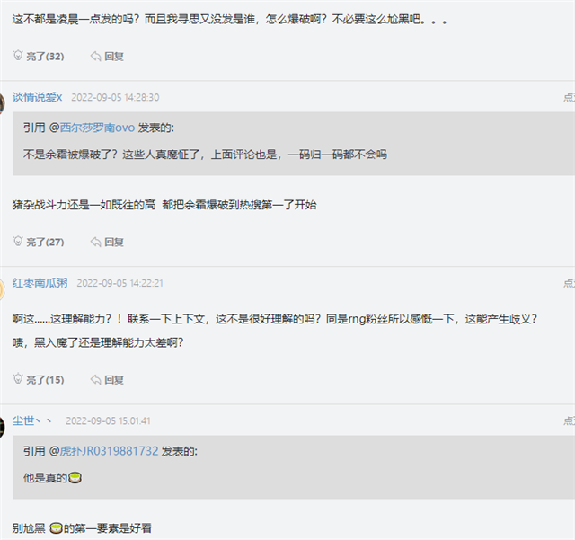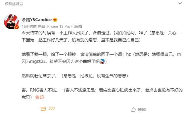 前导:RNG得胜后,LPL的真爱粉坐不住了,纷纷表达自己的高兴之情。此中央情升沉最大的是余霜,她常常发文表达自己想法,为RNG的得胜开心,为他们的失败沮丧。RNG赢下决胜局,余霜报告了一个配景的小细节。 原来,LPL有不少喜好RNG的工作职员,除了主持人、讲授,另有一些是平常现场职员。角逐竣事后,余霜晒出了他们的大合照,可以看到后方非常拥挤,都是各大战队、同盟的工作职员,各人一起到场LPL的出征仪式。 被冲上热搜一天,余霜终于说话表明 惋惜,这张照片只能看清一号、二号种子,另有挤在一旁的三号、四号种子,反面人脸都被挡住了。余霜说的是自己跟一位女工作职员攀谈,由于她看完角逐哭了。每天跟语言打交道的主持人,余霜的语言构造本领却有点不敷。 着实从她寻常主持也能看出来,无论是转场照旧问题目,余霜总是说得顿顿卡卡,还喜好“中译中”。这也是为什么余霜身为LPL一姐,却总是被吐槽业务本领不敷。她发的这一条动态,把自己奉上了热搜第五。余霜跟一位工作职员互换,问她为什么哭泣。对方回了一个词“hz”然后脱离,余霜感慨RNG“害”人不浅。 由于余霜这番话,各人有两种明白:一种是对面女工作职员喜好LNG,为他们落败哭泣,然后劈面喷余霜hz,她听了之后心情欠好求全谴责RNG。一种明白是女工作职员也喜好RNG,为他们得胜哭泣,说自己也是hz,余霜对此感同身受,颇为唏嘘。 没有生气,也没有欠好的意思,却被质疑是自导自演? 显然,余霜的真正寄义是第二种。偏偏她一开始的说法太暗昧,很多人明白成了第一种。余霜被冲到了热搜第五,已往将近一天,她才发文向各人表明。余霜编辑了原文,在反面加上四个括号。第一个括号说她没别的意思,只是关心一下现场工作职员。 第二个括号表明女工作职员也是RNG粉丝,盼望各人不要曲解自己的意思。第三个括号是说工作职员没有生气,急遽脱离要忙现场的事物。第四个括号是余霜自我讥讽,她说自己没有欠好的意思。 余霜本人也没想到会被冲上热搜,只因RNG赢角逐发的几条动态。说话表明之后,另有人吐槽余霜“自导自演”,复兴得太慢了。我以为在这件事上,余霜简直很无辜。这条动态应该不难懂白,就算余霜写得有歧义,看看品评也能读懂了。 总结 余霜简直做过一些错事,好比翻译堕落导致EDG被喷,拿走IG的物品自己使用,透露骆歆和小钰的恋情等等。不外如今余霜没做错什么,只是表达了对自己喜好队伍的支持,我们不应以此苛责这位女主持人。 |