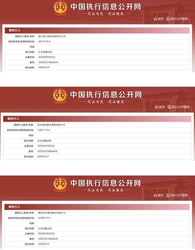 [消息页-台海网] 中国实行信息公开网表现,9月2日,丽江雪山投资有限责任公司、阳光壹佰置业团体有限公司、潍坊阳光壹佰置业有限公司新增被实行人信息,案号均为(2022)京74执366号,实行法院为北京金融法院,实行标的逾4.5亿元。 天眼查App表现,阳光壹佰置业团体有限公司分别持有丽江雪山投资有限责任公司、潍坊阳光壹佰置业有限公司31%和90%的股份,李亚鹏持有丽江雪山公司约27.84%股份并任职董事。 (泉源:举世网) |