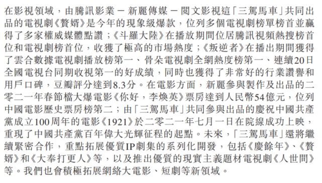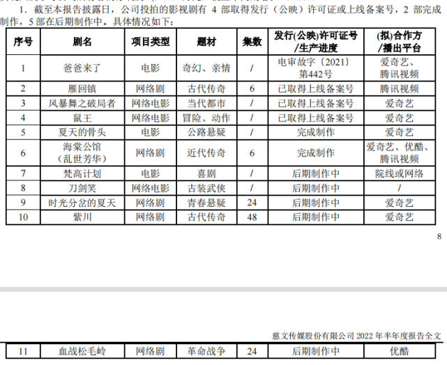 仅看上半年的高热度剧集,老牌剧集上市公司的存在感单薄了不少。 据云合数据,客岁的上半年上新连续剧集均有效播放榜前20中,一半以上都是老牌剧集上市公司出品。新丽传媒出品了《赘婿》《斗罗大陆》《反叛者》,慈文传媒出品了《江山令》《风暴舞》,完善天下影视到场出品了《狂风眼》,华策则拥有4部《你是我的城池营垒》《锦心似玉》《长歌行》《我的期间,你的期间》。 而本年上半年的榜单里,新丽传媒仅有一部《人间间》,华策拥有2部《与君初相识》《镜·双城》,阅文影视是《心居》的出品方之一,新晋上市公司柠萌影业主控的《猎罪图鉴》登上榜首。别的作品,均非上市公司出品。 毒眸在梳理剧集上市公司半年报后发现,其在剧集市场上的弱势,与半年报透露的趋势同等。对现阶段的剧集上市公司来说,连续发展是第一要义,即便如今所为,与上市时向资源市场描画的精美蓝图差别,也没有关系。 对剧集上市公司来说,这是冷静的上半年,有些是不得已,有些则是为了活命。 全面减量按照其发展模式,最不大概减量发展的三家公司:华策影视、完善天下影视和稻草熊娱乐,在上半年都有数地选择了减产。 华策影视上半年3部剧的产量,是近五年里最少的一次,客岁同期都播出了9部剧的完善天下影视和稻草熊娱乐,本年分别只播出了3部和1部。 之以是说最不大概减产,是由于这三家公司,遵照的是规模化的打法,靠的是多个制作团队齐头并进,多个项目滚动式播出,来包管资金的连续。在半年报中,华策影视下半年出于准备期的作品就有8部。 规模化运营的特点之一是子公司和内部独立工作室浩繁,以此包管项目连续供应。 华策旗下拥有二十余家子公司,三十六支制作团队,包罗上海剧酷文化流传(《你是我的城池营垒》)、上海辛迪加影视(《天盛长歌》)等。完善天下影视也是云云。据其官网,旗下共有包罗鑫宝源(赵宝刚导演)、富丽时空(滕华涛导演)、刘宁工作室等16家影视公司及工作室。 《香蜜沉沉烬如霜》就是刘宁工作室的作品 与华策和完善差别的是,稻草熊影视固然也是同时举行多个项目,但并不是将制作团队内嵌至公司内部,而是采取的是平台模式来“分发”。公司不光是制作者也是服务者,除自制内容之外,将手头储备的20-30个IP向全部创作者开放,稻草熊则继续码局、品控、融资、贩卖、发行等多项商业方面的工作,其2021年上半年播出的9部剧中就有平台模式诞生的作品。 对这些靠规模化运作的公司来说,减量是严肃的环境,而对新丽传媒来说,“减量”反而是回归了其正常生产节奏,在调解的周期内。 客岁上半年,新丽传媒播出了三部剧,此中《赘婿》《斗罗大陆》都是阅文旗下的男频IP改编,而且都是由腾讯影业,阅文团体和新丽传媒“三驾马车”共同出品。2021年正是“三驾马车”的蜜月期,在剧集和影戏方面都动作反复,并体现“未来还将继续精密相助”“积极拓展网络大影戏、短剧等新范畴”。 但此前,上半年1-2部剧才是新丽传媒不停以来的正常节奏。客岁更像是“三驾马车”相助力气的会集发作,但并非恒久之计,究竟IP开辟有着巨大的资金斲丧负担。 据阅文半年报,2022年上半年阅文团体固然贩卖及营销开支,以及一样平常及行政开支都同比淘汰了12%以上,但是电视剧、网络剧、动画及影戏的制作资本从上年同期的2.24亿元增长到4.51亿元,同比增长101.9%,占总营收的比重从5.1%升至11%。 如今,随着腾讯影业在内部战略职位的厘革,三方相助的未来另有待观察。固然《人间间》同样是“三驾马车”出品,本年阅文的财报中对此就再无提及。 做规模化运营的公司和在大公司体系下的公司,都在减量。而欢瑞、慈文这两家起于IP高潮,又在退潮后备受打击的公司,仍然在迟钝的调解期里挣扎。 欢瑞仍然对峙古装IP改编剧的路子。自客岁与阿里巴巴签订了3部剧共5.9亿的制作条约,与爱奇艺签订了2部剧共6亿的制作条约后,连续亏损三年的欢瑞续上了资金,并在本年播出了由杨紫、成毅主演的仙侠剧《沉香如屑》。而豆瓣5.9分的《沉香如屑》,已经是欢瑞自2020年的《琉璃》后,评分最高的作品。 欢瑞半年报中提及《沉香如屑》 凭古装IP在行业站稳脚跟的慈文传媒,本年三部剧《流光之城》《冰球少年》《婚姻的两种料想》已经与古装IP没有了关系,数据体现也并不亮眼。 客岁两部剧,《风暴舞》跻身2021年云合上新连续剧集均播放量TOP20,《江山令》成上半年圈层爆款。不外,后者曾被以为是耽美题材火热的开篇,没想到成了句点,慈文手头尚有另一部耽美IP《杀破狼》的储备,其番外篇《雁回镇》已取得了上线存案号。一家善于做古装IP的公司,还处于停息的余震中,在学习怎么样去做如今市场上继续水平更大的作品。 差别于欢瑞、慈文这批2016年左右,借着IP高潮上市的影视公司,新晋上市公司柠萌影视有着更多原创剧集的基因,当代剧在公司的履历表中始终占据重要位置。因此,它好像不在周期调解内,并在上市后的第一份半年报中交出了体现良好的答卷。 本年上半年播出了《逾越》和《猎罪图鉴》两部题材有较大差别的原创剧集,前者是广电总局重点引导项目,作为冬奥题材剧集,是央视一套黄金档的开年大剧,而《猎罪图鉴》在云合数据的统计里,是上半年集均播放最高的剧集。 减量并非剧集公司的孤立征象,整个剧集行业的上新数都有了显