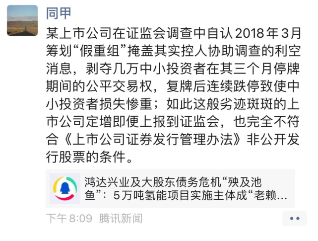 好风依附力,送我上“氢”云? 作者 | 高远山 梁春富 编辑丨高岩 泉源 | 野马财经 “潮汕富商”周奕丰旗下的上市公司鸿达兴业(002002.SZ)迎来了久违的一波上涨。9月1日公司公告,准备在全资子公司扬州威亨的谋划范围中增长研发、生产贩卖储氢瓶,在江苏全塑行的谋划范围中增长研发、生产贩卖质子交换膜。 由于这两个业务均属于火热的氢能行业,消息一出立刻点燃了股价,一扫之前的低靡态势。9月1日,鸿达兴业开盘即涨9.95%报4.75元/股。克制9月6日,鸿达兴业股价报收4.52元/股,涨幅4.39%,市值141.11亿元。 由于氢能产物是主业务务氯碱的副产物,在几年前公司鸿达兴业就提出向氢能发力。不外,这两年公司在氢气产物及干系装备收入上,却出现降落趋势,2021年这一收入占营收3.93%;本年上半年,这一数据降落为1.86%。 《21世纪经济报道》指出,鸿达兴业定增再融资55亿元结构氢能项目延宕两年多,没有实质性盼望。 根据鸿达兴业2021年6月披露的发行预案,鸿达兴业3万吨液氢和2万吨高压气氢,拟募资45亿元。增补活动资金和归还银行乞贷合计10亿元。 两个氢能项目筹划在5年内达产,将增长公司年收入48亿元,增长年均净利润 9.79亿元,投资接纳期约7.25年。 但鸿达兴业有关人士在继承《21世纪经济报道》采访时透露,“5万吨氢能源项目标定增募资,还没申报,详细申报时间现在很难确定。” 究竟是何缘故原由导致鸿达兴业定增融资项目难产? 氢能项目为何难产?鸿达兴业氢能项目难产,实在有多重因素,也很复杂。 值得一提的是,即便定增申请上报到证监会,也存在实质性停滞。《上市公司证券发行管理办法》第三十九条规定,上市公司存在严峻陵犯投资者正当权益和社会公共长处的其他情况,不得非公开发行股票。 而踢爆此事的则是,鸿达兴业曾经的互助同伴上海朝希的副总司理冒同甲。 冒同甲在朋侪圈转发《21世纪经济报道》上述报道时间评价称:“某上市公司在证监会观察中自认2018年3月操持“假重组”粉饰实在控人帮忙观察的利空消息,剥夺几万中小投资者在其三个月停牌期间的公平生意业务权,复牌后连续跌停致使中小投资者丧失惨重;云云这般劣迹斑斑的上市公司定增即便上报到证监会,也完全不符合《上市公司证券发行管理办法》非公开发行股票的条件。” 曾经的互助同伴反目,还要从证监会给冒同甲开“黑幕生意业务罚单”提及。 2017年,私募机构上海朝希与鸿达兴业睁开战略互助。冒同甲由于在2018年7月28日鸿达兴业披露克制重组利空消息之前卖出股票,被证监会认定存在黑幕生意业务举动,依据2005年《证券法》第二百零二条的规定,对冒同甲处以60万元罚款。 这对于曾在上市公司协鑫集成(002506.SZ)担当过董秘的冒同甲而言,相当于“职业生存尽毁”。 为了挽回荣誉,冒同甲被处罚之后就开始不绝向证监会申说,而且在批评媒体报道的时间还扯出了鸿达兴业的“假重组、真违规”。 上海朝希与鸿达兴业是在2017年举行战略互助的。上海朝希副总冒同甲则被委派担当私募宁波德希负责人。根据鸿达兴业2018年半年报可知,宁波德希是从当年一季度开始建仓,克制6月30日,持股2654.4万,持股比例1.03%,为第八大股东。 根据工商资料追溯宁波德希的股权结构,也可以发现其与上海朝希的细密接洽。 依据冒同甲在交际媒体披露的信息,联合2018年鸿达兴业半年报、公告倒推,鸿达兴业用“假重组”粉饰董事长周奕丰帮忙观察一事,应该指的是2018年3月26日,鸿达兴业收购鸿达兴业团体、郑楚英(实控人周奕丰老婆)旗下的盐湖镁钾公司巨大重组。由此推断,周奕丰帮忙观察应该发生在重组公告披露前几日。 值得留意的一个细节是,证监会在《〔2021〕67号行政处罚决定书(冒同甲)》中提到,2018年4月至5月,第一创业证券承销保荐的马某等前往盐湖镁钾现场走访,鸿达团体无法提供尽调资料,其判断本次重组存在停滞。2018年5月尾,第一创业证券项目负责人范某源明白拒绝担当本次巨大重组独立财政顾问。 到了5月31日,冒同甲的同事——上海朝希的闫某向鸿达兴业保举了华龙证券投行团队。6月初至15日,华龙证券项目现场负责人辛某高等人到盐湖镁钾现场预尽调。当时,辛某高以为重组存在两个停滞。 6月26日,鸿达兴业并未如实披露投行意见,而是刊发了《关于继续推进巨大资产重组暨股票复牌的公告》。 2018年7月28日鸿达兴业披露了克制重组的公告,股价从停牌前的6.05元/股跌至3.18元/股,近乎腰斩,投资者丧失惨重。 证监会在《处罚决定书》中提到,冒同甲及其署理人提出辩论意见,称鸿达兴业黑幕生意业务案的黑幕信息认定错误。巨大资产重组系为了粉饰真实黑幕信息而急忙启动,为卖弄的黑幕信息,当事人与鸿达兴业之间并无事先有筹划的预谋。当事人以此等四条来由,哀求免于处罚。 泉源:中国证监会官网(2021)67号公告 但证监会颠末复核以为:本案认定的黑幕信息属于重组事项的巨大盼望,黑幕信息认定无误。在敏感期内,冒同甲既与黑幕信息知情人蔡某兵有多次联结,又与黑幕信息知情人郑某英、林某韩有晤面打仗,且与林某韩有通话接洽。上述黑幕信息发展过程、干系接洽打仗时点与生意业务时点高度符合,生意业务举动显着非常。冒同甲对黑幕信息敏感期内生意业务“鸿达兴业”没有提出正当来由或合明白释。因此,证监会对冒同甲辩论意见不予采取。 固然证