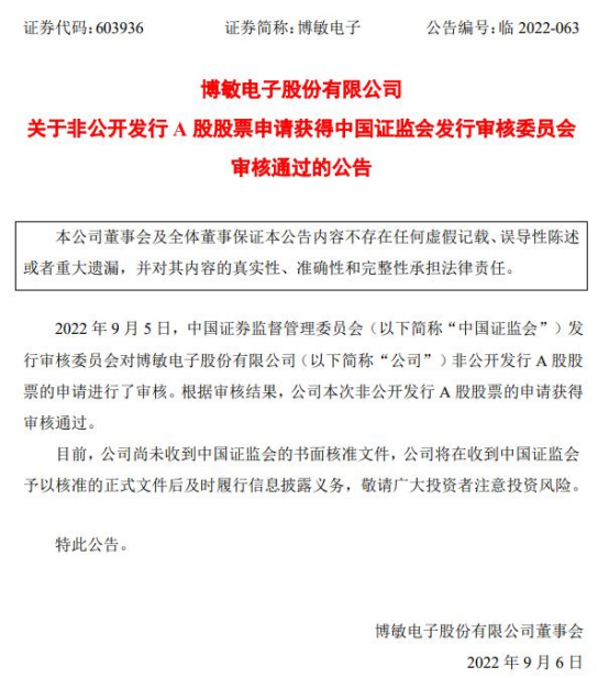 中国经济网北京9月6日讯 博敏电子(603936.SH)昨日晚间发布关于非公开发行A股股票申请得到中国证监会发审委考核通过的公告。2022年9月5日,中国证券监视管理委员会发行考核委员会对博敏电子股份有限公司非公开发行A股股票的申请举行了考核。根据考核结果,公司本次非公开发行A股股票的申请得到考核通过。 5月12日,博敏电子发布2022年度非公开发行A股股票预案。本次发行召募资金总额为不高出15亿元(含本数),扣除发行费用后的召募资金净额将用于博敏电子新一代电子信息产业投资扩建项目(一期)、增补活动资金及归还银行贷款。 公司本次召募资金将用于博敏电子新一代电子信息产业投资扩建项目(一期)和增补活动资金及归还银行贷款,顺应卑鄙应用范畴发展趋势,符合国家干系产业政策及公司谋划发展战略,有利于促进公司现有主业务务的一连康健发展,深化业务结构,进一步进步公司的综合竞争本领和团体红利本领,巩固并进步公司在行业内的职位,符合公司和全体股东的长处。 本次发行的股票为境内上市人民币寻常股(A股),每股面值人民币1.00元。本次发行采取向特定对象非公开发行股票的方式,在得到中国证监会批准后由公司在中国证监会规定的有用期内选择恰当机遇向不高出三十五名特定对象发行。 本次非公开发行股票的发行对象为符合中国证监会规定条件的不高出35名的特定对象,发行对象包罗证券投资基金管理公司、证券公司、信托公司、财政公司、保险机构、合格境外机构投资者以及其他符正当律法规规定的法人、自然人或其他机构投资者等。全部发行对象均以现金方式认购本次非公开发行的A股股票。制止预案出具之日,本次发行尚未确定具体发行对象,终极是否存在因关联方认购公司本次非公开发行股份构成关联买卖业务的环境,将在发行竣事后公告的发行环境陈诉书中披露。 本次非公开发行的股票数量按照本次发行召募资金总额除以发行代价盘算得出,且不高出本次发行前上市公司总股本的30%。制止第四届董事会第二十次聚会会议召开之日,上市公司总股本为5.11亿股,按此盘算,本次非公开发行股票数量不高出1.53亿股(含本数)。 本次发行的订价基准日为发行期的首日,发行代价不低于订价基准日前20个买卖业务日(不含订价基准日)股票买卖业务均价的80%。 发行对象认购的本次发行的股份,自本次发行竣事之日起6个月内不得转让,本次发行竣事后因公司送股、资源公积金转增股本等缘故起因增长的公司股份,亦应服从上述限售期安排,限售期届满后按中国证监会及上海证券买卖业务所的有关规定实行。 在本次发行完成后,由公司新老股东按本次发行完成后各自持有的公司股份比例共同享有本次发行前公司的滚存未分配利润。 本次发行的股票将在上海证券买卖业务所上市买卖业务。本次发行决定的有用期为自股东大会审议通过本次发行干系议案之日起12个月。 制止预案出具之日,徐缓持有公司股份比例为13.83%,谢小梅持有公司股份比例为7.64%;两人系夫妻关系,合计持有公司股份比例为21.47%,为公司控股股东、现实控制人。按发行上限测算,本次发行完成后,徐缓、谢小梅夫妻合计持有公司股份比例为16.51%,仍为公司的现实控制人。因此,本次发行不会导致本公司的控制权发生变革。 博敏电子与华创证券有限责任公司关于博敏电子股份有限公司非公开发行股票申请文件反馈意见之复兴陈诉(2022年半年度财政数据更新版)表现,华创证券有限责任公司为本次非公开发行股票的保荐机构(主承销商),保荐代表人为卢长城、彭良松。 |