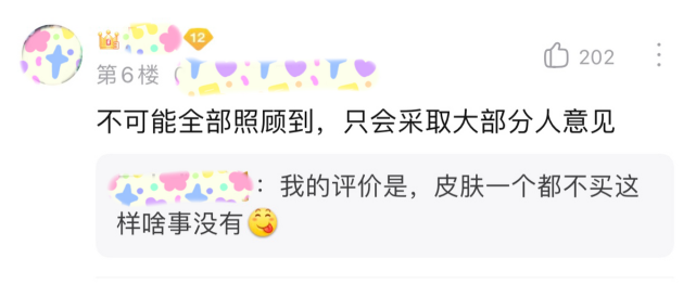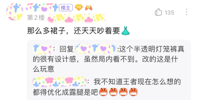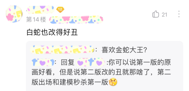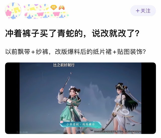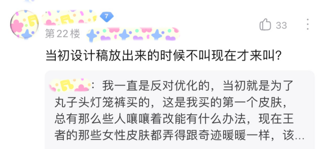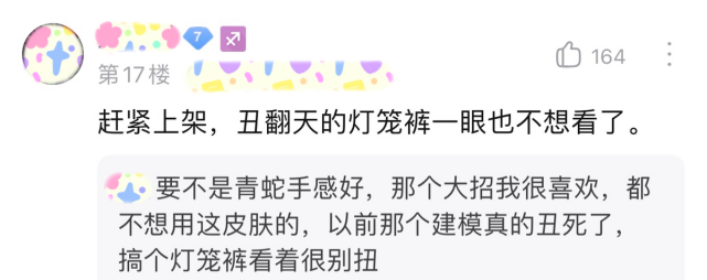 前言:各位小搭档各人好,这里是不光游戏打得6,长得还很帅的熊猫哥哥~ 王者光彩的豪杰皮肤多种多样,玩家们也是喜新不厌旧~而官方也时不时地会对老款皮肤举行优化,但整个流程比力贫苦。 举个例子来说,小乔和大乔的青蛇皮肤就是此中之一,官方不绝在安排流程优化,玩家们等候了泰半年,履历了投票,如今终于要迎来新的青蛇白蛇皮肤。 就在这时,却又有玩家吐槽道:“我就是冲着裤子买的青蛇皮肤,效果官方说改就改了?”引来路人围观,快来和熊猫哥哥一起相识一下! 女玩家因小乔青蛇皮肤由裤子改成裙子而不满,不由得吐槽先来看看还没颠末优化的小乔青蛇皮肤,可以看到穿的是裤子,简直非常特殊,毕竟女玩家的服装照旧以裙子比力多。 再来看看官方给出的小乔青蛇优化后的爆料视频,被修改成了裙子,看起来也是非常飘逸。 这位女玩家不满的点在于:小乔已经有很多穿裙子的皮肤,青蛇特殊就特殊在穿的是裤子,然而官方非要改成裙子。 既然有人喜欢穿裤子,有人喜欢穿裙子,那为什么不能和星元皮肤一样出两个版本,让玩家自由选择,而不是如许非要改成裙子呢? 不外,就这一观点,路人们很快反驳道:青蛇是由经典形象而来的皮肤,如许的配景让这款皮肤不大概出星元配件,因此不会有两版。 裤子和裙子哪个才是yyds?各人审美差别,还真不好说看完女玩家发出来的内容后,有路人支持,表现自己也喜欢旧版。 除开小乔的青蛇以外,大乔的白蛇也被吐槽改得欠悦目。 但更多的路人则以为,原版的小乔青蛇皮肤是真的辣眼睛,重新到脚都是槽点。 尤其是女玩家所说喜欢的裤子,更是最大的槽点,很多玩家都在吐槽。 由此可见,众口难调,每个人的审美都差别,但喜欢裙子简直实比裤子多,只能少数人服从多数,根据大众的意见来修改。 吃瓜群众:不改也骂,改了也骂,某些玩家是真的太难奉养!也有路人指出,小乔的青蛇皮肤早就说过要改,女玩家完全可以在计划稿放出之初去给意见,为何偏偏比及定稿,爆料视频已出,齐备都成定局才来喷? 而且,在青蛇优化之初,官方就网络了玩家意见,故意改成裙子。 女玩家如许的活动,还真有点马后炮的意思,优化前有人吐槽,优化后也有人吐槽,谁看了不说一句太难了? 只能说,总有人不满,但官方也是尽大概思量到大众的意见,人群中总会有不一样的声音,风俗就好! 熊猫有话说:原版的小乔青蛇,灯笼裤俏皮,非常生动,而更改之后穿的小裙子,显得更加芳华可爱,两个版本各有千秋,熊猫哥哥个人倒是比力喜欢改版之后的! 好了小搭档们,对于上述事故,你有什么不一样的见解呢?你喜欢老版的照旧新款的呢?接待来批评区留言讨论,大概你有别的故事也可以私信告诉熊猫哥哥噢,爱你萌,比心~ |