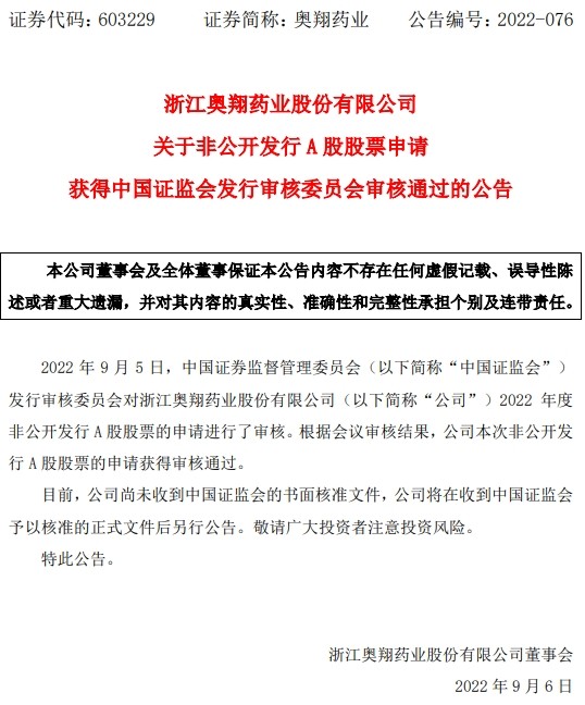 中国经济网北京9月6日讯 昨日晚间,奥翔药业(603229.SH)发布公告,中国证监会发行考核委员会对公司2022年度非公开发行A股股票的申请举行了考核,根据聚会会议考核结果,公司本次非公开发行A股股票的申请得到考核通过。 2022年7月26日,奥翔药业发布2022年度非公开发行股票预案(二次修订稿),公司本次非公开发行股票召募资金总额不凌驾48,490.31万元(含本数),扣除发行费用后的净额拟投资于高端制剂国际化项目(一期)、特色质料药及关键医药中心体产业化项目(二期)、增补活动资金。 奥翔药业2022年3月9日发布的2022年度非公开发行股票预案体现,公司拟召募资金总额不凌驾50,000.00万元(含本数)。 奥翔药业本次非公开发行对象为不凌驾三十五名(含三十五名)特定投资者,包罗符正当律、法规和中国证监会规定条件的证券投资基金管理公司、证券公司、信托公司、财政公司、资产管理公司、保险机构投资者、及格境外机构投资者以及符正当律法规规定的其他法人投资者、天然人大概其他及格投资者。证券投资基金管理公司、证券公司、及格境外机构投资者、人民币及格境外机构投资者以其管理的二只以上产物认购的,视为一个发行对象;信托公司作为发行对象的,只能以自有资金认购。 奥翔药业本次非公开发行股票的定价基准日为发行期首日,发行代价将不低于定价基准日前20个买卖业务日公司股票买卖业务均价的80%(定价基准日前20个买卖业务日股票买卖业务均价=定价基准日前20个买卖业务日公司股票买卖业务总额/定价基准日前20个买卖业务日公司股票买卖业务总量)。终极发行代价将在公司取得中国证监会关于本次非公开发行的允许批复后,由公司董事会根据股东大会的授权,按照干系法律、法规和规范性文件的规定,根据发行对象申购报价环境,依照代价优先的原则,与本次非公开发行的保荐机构(主承销商)协商确定。 奥翔药业本次非公开发行股票数目不凌驾本次发行前公司总股本的10%,即不凌驾40,186,670股(含本数),并以中国证监会的允许文件为准。基于前述范围,终极发行数目将在公司取得中国证监会关于本次非公开发行的允许批复后,按照干系规定,由公司股东大会授权董事会根据发行询价结果,与本次发行的保荐机构(主承销商)协商确定。 制止上述预案公告日,奥翔药业本次非公开发行的发行对象尚未确定,终极是否存在因关联方认购公司本次非公开发行股份构成关联买卖业务的环境,将在发行竣过后公告的发行环境陈诉书中披露。 本次非公开发行前后,郑志国均为奥翔药业的实际控制人、控股股东,不会导致公司实际控制权发生变革。 奥翔药业2022年8月31日发布关于《关于请做好浙江奥翔药业股份有限公司非公开发行股票发审委聚会会议预备工作的函》的复兴公告体现,公司此次非公开发行股票的保荐机构(主承销商)为国金证券股份有限公司,保荐代表人为余波、樊石磊。 奥翔药业2022年5月20日发布的2021年年度权益分派实行公告体现,公司本次利润分配及转增股本以方案实行前的公司总股本287,047,646股为基数,每股派发现金红利0.102元(含税),以资源公积金向全体股东每股转增0.4股,共计派发现金红利29,278,859.89元,转增114,819,058股,本次分配后总股本为401,866,704股。 |
