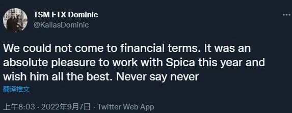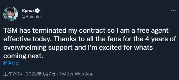 TSM打野选手Spica在个人推特上公布自己已经成为自由选手,大意如下: TSM已经克制了我的条约,以是如今我是一名自由选手了。感谢已往四年不停支持我的粉丝们,让我们看看接下来会发生什么。 Spica自2020年夏季赛到场TSM起,跟随TSM拿下一次联赛冠军并跟随队伍到场了2020环球总决赛,终极小组垫底无缘出线。在2021年Spica拿下夏季赛MVP,但终极TSM不敌C9仅排名夏季赛第四无缘天下赛。 停止现在TSM对于Spica这条推特并未做出复兴。 值得一提的是,固然Spica居住在美国,但他现在依然是一位中国公民。 随后TSM副总裁回应了和Spica克制条约的缘故起因,大意如下: 我们在款子题目上未能告竣同等,但和Spica互助的这一年依然是舒畅的一年,祝他以后齐备都好。 Spica这条推特也引发部分从业职员讨论,部分批评如下: EG锻练负责人Peter:不把这条推特翻成中文发一下么? Spica:中文、法语、西班牙语、丹麦语、越南语、葡萄牙语、俄罗斯语、日语、土耳其语、韩语、德语、意大利语的翻译工作正在举行中。 LCS讲授Markz:我盼望你的下一份工作别是来讲授席代替我吧。 Spica:哈哈你TM唾骂我们掉到了第七,我很快就来抢你的工作了 |