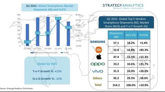 7月29日,权威市调机构StrategyAnalytics发布的最新报告显示仪,2021年Q2全球智能手机出货量同比增长11%,达到3.142亿部。这是近年来第二高的年增长率(仅次于2021年Q1的 28%)。 2021年Q2,三星以18.2%的市场份额继续保持领先地位。然而,三星的年增长率(同比增长5.4%)在排名前五的厂商中垫底。 Strategy Analytics认为,来自中国厂商的激烈竞争和供应限制都影响了三星在本季度的业绩。 出货量暴增85.3% SA:小米手机首次跻身全球前二 小米有史以来第一次跻身世界前二,其全球智能手机出货量为5280万部,市场份额为16.8%。 在前五名的厂商中,小米的年增长率最高(+85.3%)。小米迅速且成功的抓住了LG在拉丁美洲的退出和华为在欧洲地区的余波。 苹果在Q2的业绩创历史新高,iPhone出货量为4740万部,占据了15.1%的市场份额。新兴市场在苹果的全球版图中扮演着越来越重要的角色。 SA估计,该季度中国已经超过美国成为苹果iPhone最大的单一市场,这是有史以来的第一次。支持5G的iPhone 12系列继续受到忠实iPhone粉丝的欢迎。 中国厂商OPPO和vivo分别以10.6%和10.0%的市场份额分列第四和第五。这两家厂商都见证了两位数的年增长率,主要来自中国、印度和其他海外市场。 |