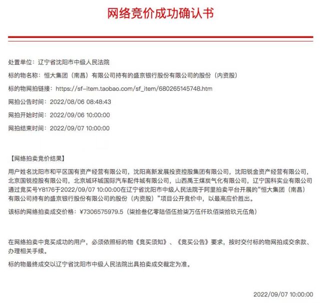 北京日报客户端 | 训练记者 夏骅 7日上午,随着恒大团体(南昌)有限公司持有的盛京银行全部12.82亿股内资股一拍效果出炉,恒大将全面退出盛京银行。 阿里拍卖网表现,恒大团体(南昌)有限公司(以下简称“恒大南昌”)持有的盛京银行全部12.82亿股内资股一拍于7日上午竣事,沈阳市清静区国有资产谋划有限公司等7家公司竞拍乐成,网络拍卖成交代价73.07亿元,折合约5.7元每股。 数据表现,恒大南昌持有盛京银行12.82亿股,占比14.57%。若此次交易业务终极完成,恒大将全面退出盛京银行。 阿里拍卖网表现,竞拍乐成恒大南昌所持盛京银行全部12.82亿股股权的为沈阳市清静区国有资产谋划有限公司、沈阳高新发展投资控股团体有限公司、沈阳锐金资产谋划有限公司、北京国锐控股有限公司、北都城环城国际汽车配件城有限公司、山西禹王煤炭气化有限公司、辽宁国科实业有限公司7家公司。从7家公司股权配景来看,多家有国资配景。 据公开资料表现,2016年恒大通过收购盛京银行5名内资股股东10.02亿股股份成为该行第一大股东,2019年恒大又加码盛京银行,增持股份至32亿股。停止2020年末,恒大南昌直接持有盛京银行32.02亿股内资股,占该行已发行平凡股的比例为36.4%,为盛京银行第一大股东。 从2021年下半年,恒大就开始出售所持盛京银行股权。在客岁8月出售盛京银行10亿元股权后,恒大在9月尾继承以99.93亿元将所持盛京银行19.93%股权转让给沈阳国资委附属公司沈阳盛京金控投资团体有限公司。 随着剩余股权在本日拍卖成交,恒大也将全面退出盛京银行。三次出售完成后,恒大累计回笼资金凌驾180亿元。 图片泉源:阿里拍卖 |