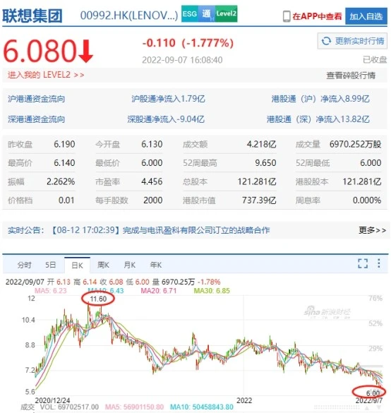 中国经济网北京9月7日讯 本日,遐想团体(00992.HK)股价下跌,盘中最低报6.00港元,跌幅3.07%,创20个月以来新低。克制港股收盘,该股报6.08港元,跌幅1.777%,港股市值737.39亿港元。 遐想团体已一连5个生意业务日下跌,此前9月1日收跌0.92%,9月2日收跌3.11%,9月5日收跌0.48%,9月6日收跌0.32%。 遐想团体于2021年3月31日盘中创下阶段高点11.60港元,经盘算,本日收盘价与之相比已跌去47.59%。 |
