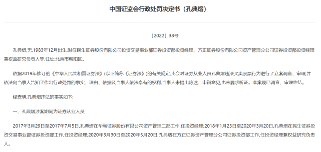 又有证券从业职员交易股票被罚! 克日,证监会官网公布的一则行政处罚决定书表现,现年39岁的证券从业职员孔典熠违法交易股票,被处以20万元罚款。 据行政处罚决定书,孔典熠,曾任时任民生证券股份有限公司投资交易业务奇迹部证券投资部投资司理、方正证券股份有限公司(简称“方正证券”,601901)资产管理分公司证券投资部投资司理兼权益研究负责人等职务。 经证监会认定,孔典熠在2019年4月8日至2020年3月19日、2020年3月30日至2020年5月20日期间(简称“涉案期间”)控制使用姨父“刘某宁”财信证券账户交易业务“中信证券”“安全银行”等133只股票,交易业务金额合计约4557.43万元,累计亏损约1.3万元。 投资司理违规借账号炒股还亏了钱 行政处罚决定书表现,孔典熠,出生于1983年12月,现年39岁。在涉案期间及之前,孔典熠先后在多家券商任投资司理一职。 2017年3月29日至2017年7月5日,孔典熠在华融证券股份有限公司资产管理二部工作,任投资司理;2018年1月23日至2020年3月20日,孔典熠在民生证券股份有限公司投资交易业务奇迹部证券投资部工作,任投资司理;2020年3月30日至2020年5月20日,孔典熠在方正证券资产管理分公司证券投资部工作,任投资司理兼权益研究负责人。 孔典熠举行证券交易业务所用的账号来自姨父“刘某宁”。早在2015年2月16日,孔典熠姨夫“刘某宁”在财信证券湘潭韶山中路业务部开立证券账户,下挂沪市股东账户、深市股东账户,并于同日开通第三方存管,开户所留手机号码为孔典熠母亲王某萍的手机号码。 资金泉源方面,孔典熠不但使用本身的资金炒股,尚有来自母亲、朋侪、朋侪之母的资金。 行政处罚决定书表现,自2015年“刘某宁”财信证券账户开户至账户末了交易业务日2021年8月4日,“刘某宁”财信证券账户共转入资金11笔,合计67.685万元。此中,20万元来自王某萍,37.685万元(含来自孔典熠朋侪陈某慧的3.2万元以及现金存款4万元)来自孔典熠,10万元来自孔典熠朋侪吴某文之母杨某芬。 只管身为投资司理,孔典熠却以亏钱收场。在涉案期间,“刘某宁”财信证券账户交易业务“中信证券”“安全银行”等133只股票,累计买入成交22885614.22元,累计卖出成交22688666.51元,合计45574280.73元,累计亏损13280.9元。 券商从业职员“顶风作案”时有发生 不但炒股亏了钱,孔典熠还被罚20万元。 证监会以为,在涉案期间,孔典熠作为证券公司从业职员,通过现实控制并使用“刘某宁”财信证券账户举行股票交易的举动,违背《证券法》第四十条第一款的规定,构成《证券法》第一百八十七条所述的举动。根据当事人违法举动的毕竟、性子、情节与社会危害程度,依据《证券法》第一百八十七条的规定,证监会决定对孔典熠处以20万元罚款。 《证券法》第四十条第一、二款规定,证券公司的从业职员在任期大概法定限期内,不得直接大概以化名、借他人名义持有、交易股票大概其他具有股权性子的证券,也不得收受他人赠予的股票大概其他具有股权性子的证券。任何人在成为证券公司从业职员前,其原已持有的股票大概其他具有股权性子的证券必须依法转让。 另据《证券法》第一百八十七条,证券从业职员违背第四十条的规定,直接大概以化名、借他人名义持有、交易股票大概其他具有股权性子的证券,责令依法处置处罚非法持有的股票,充公违法所得,并处以交易股票等值以下的罚款。 毕竟上,证券从业职员不得持有、交易股票的规定由来已久。依据证监会关于政协十三届天下委员会第四次聚会会议第1820号(财税金融类198号)提案复兴的函(下称“复兴函”),自1998年《证券法》出台,就规定证券从业职员不得持有、交易股票。 据复兴函,新《证券法》在修订过程中,曾取消了克制证券从业职员交易股票的条款,但思量到证券从业职员地点机构是专业从事证券交易业务和证券经业务务的单位,由于职务工作缘故原由,大概把握超出一样平常投资者可以大概相识的未公开信息,具备使用业务上风、信息上风以致黑幕信息到场股票交易业务,谋取不正当优点的根本。因此,为了维护证券市场秩序和市场公平性,保障平常投资者正当权益,立法构造终极仍保存了干系条款。 但在实践中,仍有券商从业职员“顶风作案”。 此前在6月22日,上海证监局针对某券商资管公司原权益投资部副总监(主持工作)刘某发布了行政处罚决定书。经查,刘某在2013年9月24日至2020年6月3日期间,先后使用“秦某珍”等人的海通证券名誉账户、平常账户持有、交易股票,通过刘某个人使用的手机和电脑装备委托下单共计24623笔,占总委托下单笔数的89.37%,累计交易业务金额146.82亿元,红利5463.87万元。 根据刘某违法举动的毕竟、性子、情节与社会危害程度,依据《证券法》第一百八十七条的规定,上海证监局决定:责令刘某依法处置处罚非法持有的股票,充公刘某违法所得5463.87万元,并对刘某处以5463.87万元罚款,合计逾1.09亿元。 |