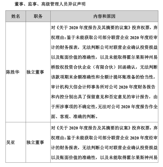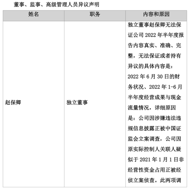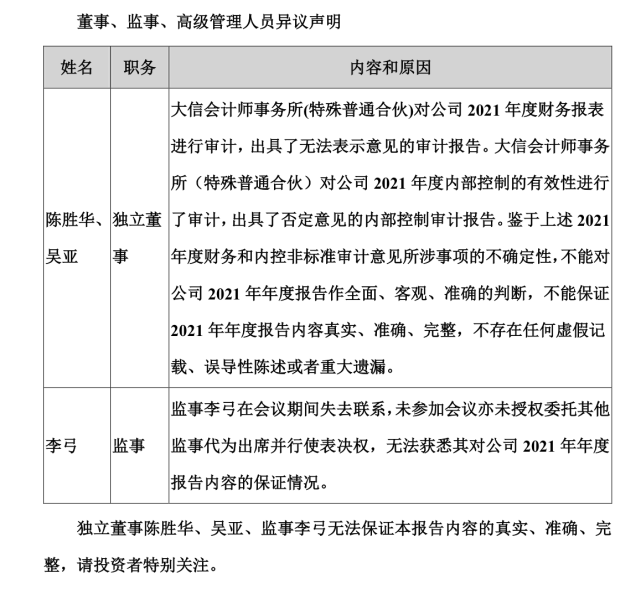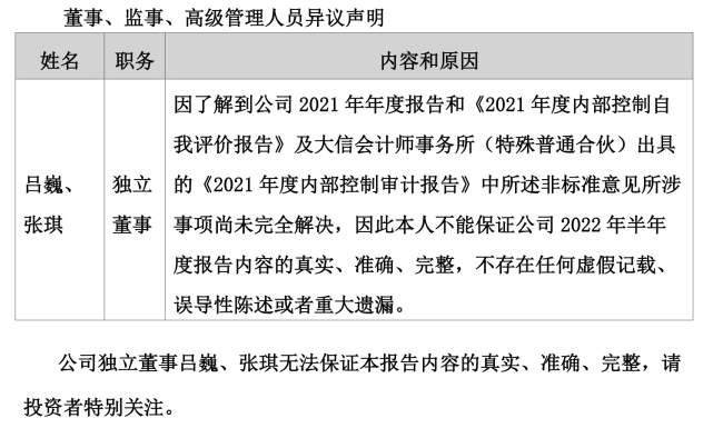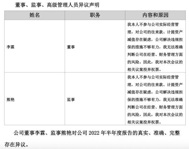 记者|赵阳戈 随着2022年半年报披露竣事,四千多家公司交出了自己的效果单。不外通过梳理可以发现,有些公司的半年报,竟然连自家人都“无法包管”真实性、正确性、完备性。而这一份份“无法包管”背后,又有着怎样的故事呢? 4月推选5月就不想干了,ST凯撒“无法包管真实”的监事终辞任成行这类“无法包管”的公司,以戴帽者居多。 ST凯撒(000796.SZ)是8月31日披露的半年报。在半年报开篇告急提示中,ST凯撒就提示公司监事李峰无法包管陈诉内容的真实、正确、完备,来由则是“本人既不在公司任职也不在公司股东处任职,前期5月份已向公司提出辞任监事,公司至今未推行改选步调”。 泉源:公告 ST凯撒早在1997年7月3日就上市了,靠近25年的A股履历,不知尘封了多少老股民的急遽光阴。该公司现在主业务务包罗旅游业务(旗下凯撒旅游),航食、铁路配餐业务(旗下凯撒易食,现在中国唯一的业务范围同时覆盖航空配餐、铁路餐饮、邮汽船供、社会化团餐及休闲食品等范畴的企业),新零售业务,以及目的地业务。目的地板块的设立是后疫情期间凯撒旅业转型的深度推进,2022年告急以旗下公司海南亿步为资源要素整互助抓手,重点从“源产地好物”+“文旅整合营销”两个业务方向发力。 疫情对业务的影响是严肃的,2022年上半年ST凯撒业务收入1.9亿元,同比下滑了66.9%,净利润-1.7亿元,同比下滑0.39%。这几年,ST凯撒不绝处于亏损状态,2020年亏了6.98亿元,2021年也亏了6.9亿元。ST凯撒2021年年报的审计意见还为“生存意见”,形成生存意见的底子,则为无法获取公司投资海南微凯创新实业发展有限公司4900万元的资金使用情况。另从厚交所网站上看到,羁系层对ST凯撒的2021年年报、2020年年报也都举行干涉询。 2022年半年报也不例外,公司于9月1日收到了关注函。厚交所要求公司阐明监事李峰对半年报内容存在贰言的详细缘故原由及被页净公司前期是否为前述贰言监事推行职责提供须要帮忙、是否收到监事辞职申请、其辞任监事的详细收效时间;公司是否推行了相应的信息披露任务、与贰言监事的沟通情况;全体董事、监事、高级管理职员是否依法依规审视了公司2022年半年度陈诉,推行了勤勉尽责任务,并阐明详细职责推行情况;公司内部控制是否存在缺陷、公司管理工作是否正常开展。 同时羁系层也要求监事李峰阐明是否切身出席监事会,是否审视了公司2022年半年度陈诉,是否已对2022年半年度陈诉内容及公司策划情况举行须要的事前核实与观察,并阐明推行勤勉尽责任务的详细情况。别的公司监事会也必要对监事李峰实行公司职务的活动发表意见,对李峰无法包管年度陈诉内容的真实、正确、完备事项发表意见。 泉源:同花顺 公开信息体现,监事李峰任期本来为2022年4月6日至2022年10月13日,他曾任海越能源团体股份有限公司风险控制部总司理,现任海南海航国际旅店管理股份有限公司合规法务部总司理、海航非航空资产管理古迹部合规法务部总司理助理。2022年9月2日,公司披露了李峰因工作缘故原由申请辞去公司监事职务的消息,辞职后,李峰将不再担当公司任何职务。 从过往来看,2022年8月31日半年报监事会决定中,李峰就给了《2022年半年度陈诉全文及择要》《关于增长2022年一样平常关联买卖业务预计的议案》弃权票,公告体现“监事李峰因个人缘故原由未给予明确的表决意见,公司视为弃权”。 汗青遗留题目未办理,*ST顺遂两独董“无法包管真实”8月31日,*ST顺遂(000606.SZ)披露的半年报中,独立董事吕巍、张琪的声明相称扎眼:“因相识到公司2021年年度陈诉和《2021年度内部控制自我评价陈诉》及大信管帐师变乱所(特殊平凡合资)出具的《2021年度内部控制审计陈诉》中所述非尺度意见所涉事项尚未完全办理,因此本人不能包管公司2022年半年度陈诉内容的真实、正确、完备,不存在任何卖弄记载、误导性陈诉大概庞大遗漏。” 泉源:公告 形貌很明确,汗青遗留题目惹出的贰言。 *ST顺遂2019年亏损10.21亿元,2020年亏损12.11亿元,2021年亏损6.29亿元,2022年上半年亏损5081.42万元,从事互联网服务业务,包罗人力资源业务、企业综合服务、顾问咨询业务。2022年上半年业绩下滑,公司表现是受疫情、行业竞争等因素连续影响,公司业务量连续下滑所致,同时受人力资源业务下滑影响,政府互助收益亦大幅镌汰。 停止现在,公司存在如下风险:活动资产远低于活动负债、净资产为负、业务收入连续下滑、部分银行账户被冻结、存在庞大诉讼、2021年度财务陈诉非标意见所涉事项主业务务收入完备性、持有待售资产和持有待售负债及子公司的停止确认、子公司涉税事项、连续策划本领庞大不确定性等以及内控审计非标意见所涉事项尚未消除、公司股东彭聪所持股份被动减持。这此中,就有独立董事吕巍、张琪提及的缘由。 翻开2021年年报就会发现,现实上*ST顺遂也有类似的尴尬,独立董事陈胜华、吴亚也表现过“不能包管2021年年度陈诉内容真实、正确、完备”。 泉源:公告 2020年年报,*ST顺遂也有这报酬,独立董事陈胜华、吴亚对《关于2020年度陈诉及其择要的议案》均投了弃权票。 泉源:公告 泉源:公告 回到2021年年报,大信管帐师变乱所(特殊平凡合资)做的审计,形成“无法表表现见”的底子有五点。其一,2020年生存事项连续,即长期股权投资核算的28家联营企业确认的投资收益