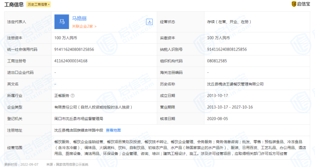 每经编辑:杜宇 9月7日,“槐店王婆大虾采取剩菜再上餐桌”的消息登上微博热搜,引发网友热议。 9月8日破晓,槐店王婆大虾官微发布致歉声明,对山西太原一门店采取剩菜再上餐桌报道作出回应。 槐店王婆大虾官微声明称,表现将立刻对涉事门店休业整理,并对全部门店拉网式查抄,加速推进“放心厨房”项目。对给消耗者带来的伤害,朴拙致歉。 据槐店王婆大虾官微表现,槐店王婆大虾关联公司为河南槐店王婆餐饮管理有限公司。 据启信宝,河南槐店王婆餐饮管理有限公司建立于2013年10月,注册资源100万人民币,法定代表人为马美丽,谋划范围包罗餐饮服务、餐饮企业连锁谋划、餐饮项目策划及投资、餐饮技能转让等。由河南致良味餐饮管理有限公司全资持股。 图片泉源:启信宝 值得注意的是,据2016年至2021年年报表现,该公司参保人数均为0人。 图片泉源:启信宝 逐日经济消息综合槐店王婆大虾官方微博、启信宝、新浪微博 逐日经济消息 |