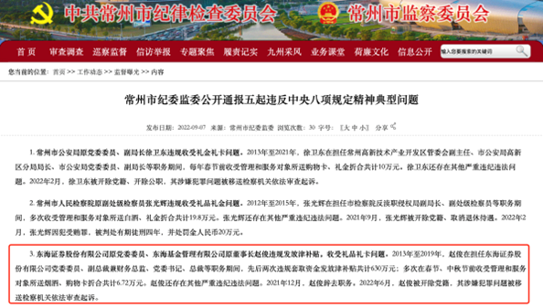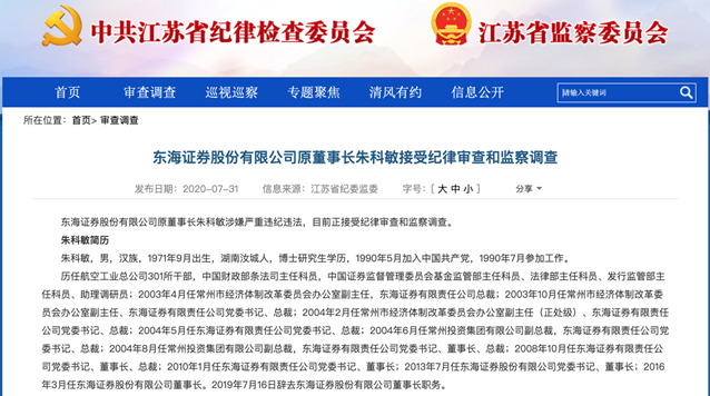 每经记者:陈晨 每经编辑:赵云 9月7日,常州市纪委监委公开转达五起违反中心八项规定精力典范标题,此中包罗东海证券股份有限公司原党委委员、东海基金管理有限公司原董事长赵俊违规发放津补贴,收受礼物礼卡标题。 常州市纪委监委披露表现,2013年至2019年,赵俊在继承东海证券股份有限公司党委委员、副总裁兼财政总监、党委书记、总裁等职务期间,先后两次违规套取资金发放津补贴共计630万元;多次在春节、中秋节前收受管理和服务对象所送烟酒、购物卡折合共计6.72万元。赵俊还存在其他严峻违纪违法标题。2021年12月,赵俊辞去职务。2022年6月,赵俊被开除党籍,其涉嫌犯罪标题被移送查察构造依法查察告状。 关于转达中,赵俊还存在其他严峻违纪违法标题,这是否与东海证券或东海基金有关?制止发稿,东海证券方面并未就此向记者回应。 离任总裁后曾受到羁系发言步伐赵俊,1970年1月出生,硕士研究生。曾任常州飞机制造厂计划所职员,常州国光办公主动扮装备公司网络工程部职员,常州证券有限责任公司电脑部司理、总司理助理,东证有限总监、高级总监、副总裁兼财政总监,东海证券副总裁兼财政总监、副总裁、代行总裁、总裁。 2016年4月,因原总裁刘化军提出辞职,东海证券董事会指定副总裁赵俊代行公司总裁职务。2016年5月,东海证券董事会同意聘任赵俊为公司总裁,赵俊也就正式转正。2019年9月,因原合规总监兼首席风险官巫兰辞职,东海证券董事会指定总裁赵俊代行公司合规总监兼首席风险官职务,代行时间不凌驾六个月。2019年12月,因任期届满,股东单位工作分工调解等缘故原由,东海基金(东海证券持股比例45%)原董事长葛伟忠离任,赵俊因此再添一职成为东海基金董事长。 然而,2020年1月15日,东海证券董事会决定,赵俊不再继承公司总裁及代行公司合规总监兼首席风险官职务。不外,关于东海基金董事长职务,直到2021年12月赵俊才因个人身材缘故原由离任。2022年1月,东海基金法定代表人由赵俊变动为严晓珺。 值得一提的是,就在2021年1月赵俊不再继承东海证券总裁后,2020年2月,江苏证监局还出具了《关于对赵俊接纳羁系发言步伐的决定》,重要内容为:赵俊继承东海证券负责人期间,公司资产管理业务展业过程中存在风险控制制度和合规管理制度不健全、个别业务开展过程中未勤勉尽责的环境。赵俊是对上述标题负有责任的高级管理职员,江苏证监局对赵俊接纳了羁系发言的行政羁系步伐。 原董事长曾继承规律查察和监察观察着实,在赵俊之前,东海证券原董事长朱科敏继承观察一事也曾引发剧烈关注。2019年7月18日,东海证券发布公告称,公司董事会于2019年7月16日收到董事长朱科敏递交的辞职陈诉,2019年7月16日起辞职见效。同时,东海证券还披露称,公司2019年7月16日晚,接到江苏省公安厅电话关照,告知朱科敏如今处于共同观察阶段。 时隔一年,2020年7月31日,江苏省纪委监委官网发布消息称,东海证券股份有限公司原董事长朱科敏涉嫌严峻违纪违法,如今正继承规律查察和监察观察。 着实,就在朱科敏辞职前,即2019年5月,常州市委就任命钱俊文继承东海证券党委书记并提名为公司董事长。 2021年1月,东海证券正式睁开了高管团队的重新调解组建,推选钱俊文为公司董事长,聘任殷建华为公司总裁,赵俊不再继承公司总裁及代行公司合规总监兼首席风险官职务,殷建华代行公司合规总监兼首席风险官职务,其他高级管理职员维持稳固。紧接着2月,聘任马芸为公司合规总监兼首席风险官。值得一提的是,新任总裁殷建华和合规总监马芸均来自羁系部分。 本年7月22日,常州市纪委监委网站公布,常州市纪委监委派驻东海证券纪检监察组第一时间构造召开党委会举行专题学习。东海证券党委书记钱俊文体现,公司党委将进一步进步政治站位,旌旗光显地支持共同派驻纪检监察组工作,自发继承派驻监督;支持派驻机构工作规范化、法治化、正规化创建;支持派驻纪检监察组执纪执法,连续营造公司风清气正、继承作为、干事创业的精良氛围……为东海证券“二次创业新征程”、实现战略目标做出更大贡献。 上半年公司实现营收净利双增东海证券的前身是1993年创建的常州证券。2003年5月,在行业大潮迁移变革之际,常州证券改名为“东海证券有限责任公司”,2005年成为天下首批第十家创新试点券商。2013年7月公司改制为“东海证券股份有限公司”。制止2022年上半年末,公司资产总额596.02亿元,较年初增长13.09%。 在业绩方面,本年上半年,东海证券实现营收净利双增。东海证券2022年半年报表现,本年上半年公司实现业务收入7.98亿元,同比增长22.82%;实现归属于挂牌公司股东的净利润1.43亿元,同比增长10.14%。这与同期证券行业双降格局形成光显对比。中证协数据表现,受上半年证券市场颠簸等因素影响,自业务务收入下滑显着,导致行业团体业务收入和净利润分别同比下滑11.4%和10.06%。 记者进一步相识到,东海证券本年上半年业绩增长重要缘故原由是自业务务和名誉业务收入增长。数据表现,本年上半年,东海证券利钱净收入1.16亿元,同比增长596%,占业务收入比重约为15%,东海证券体现,利钱净收入大幅增长重要缘故原由是钱币资金及结算备付金、其他债权投资利钱收入增长所致。自业务务收入(投资收益+公允代价变动损益-对联营和合营企业的投资收益)2.23亿