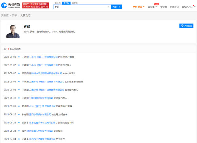 天眼查App体现,克日,赣州快乐分期网络服务有限公司、小沐(厦门)投资有限公司发生工商变动,罗敏均退出法定代表人及实行董事职务,由彭晓锋接任。此前,罗敏已退出赣州趣店科技有限公司和趣分期(赣州)信息技能有限公司的法定代表人、实行董事、总司理,均由彭晓锋接任。 |