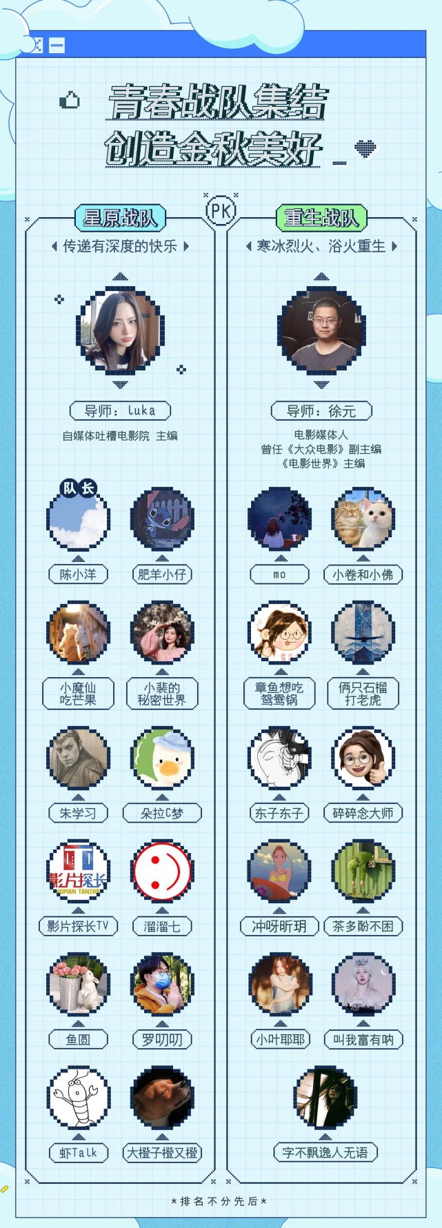 这里有迸发的灵感、豪情的芳华、火热的PK战。 这里尚有出色的竞争、重磅的鼓励金、丰富的福利。 大弟子们会怎样批评你追的剧集、喜好的演员?是板砖横飞照旧火星四射?9月9日起,在腾讯消息APP娱乐频道,文娱创作新权势第一季的弟子团战将正式打响,两大战队连续输出文娱新创作,等候你来选队支持。追剧看赏析,尚有机遇瓜分鼓励金、分享胜利,别错过这波金秋的文娱大福利。 大概你已意识到,新一代00后文娱创作者已寂静而至。他们被新期间孕育出独立的审美,不喜好平卑鄙套的框架,他们对行业有奇怪的认知,有火热的创作豪情,尚有生猛的观点碰撞以及真实不造作的魅力。海潮更迭,那些有代价、够新意的声音值得来反哺文娱市场的繁华与兴盛。 以是,腾讯娱乐团结1905影戏网决定发起一场跨世代的对话。广发好汉帖,招募00后创作新权势,与百年文娱来一场畅快淋漓的交锋,围绕影评、剧评、娱乐热门分析等为娱乐创作注入芳华气力,还将深度发掘20岁群像的人文思索,突出励志正能量。 9月9日至10月12日,腾讯娱乐与1905影戏网团结主理的《文娱创作新权势》弟子团战即将火热PK!PICK你支持的战队,还能瓜分鼓励金和福利,快来为你喜好的创作者打call吧! 两大战队出色对抗,彰显芳华创作魅力在此前一个月中,腾讯娱乐通过招募、甄选,共集结到23位优质创作新秀,并通过队长竞争、分组集结为两大战队,正式开营。队员们将通过使命、练习、考核、pk、直播等多种团战、个人战玩法,对火出圈的影视作品、热火朝天的焦点、聚光灯下的风动幡动等敏捷生产观点睁开创作,并开启定制大V之旅,提拔并改变对行业的认知。 战队组队之初,共有四位同砚加入队长竞争,终极2位组长胜出。两位队长(此中一队为署理队长)各自领导11或12名队员一起打PK,所组战队分别是星原战队和重生战队。 弟子战队集结PK 星原战队注意穷究影视背后的意义,善于影视作品讲授,同时也能紧跟娱乐热门自由表达,向大众实时转达娱乐资讯的独到见解。 星原战队队长为广播电视编导专业在读,在校期间便具备丰富的统筹履历,尚有天马行空的创意,TA在竞选队长时曾刚强亮相:“在赛程期间保持高度热情,pick me”。 星原战队的宣言也迸发着芳华的发达生机: 零星的火苗汇聚时可燎原;十二个我们相遇后会并肩。我们的初志是转达有深度的快乐,我们的存在与热门共振、与天下共鸣。我们坚信:星星之火,可以燎原;我们也定当不忘初心、努力以赴! 队长气力出众,队员的个人简介也出色纷呈,TA们都是: 体验派的空想实干家、学计划的新媒妁、发光的小太阳、喜好网上冲浪的bb虾……致力于分享热爱、获取多倍人生、探寻有深度故意义的影片。 星原战队宣言 星原战队阵容 重生战队履历一番分组妨害后,在开营前有惊无险地顺遂集结。很多队员致力于拍照、导演专业,并发展了广泛的爱好爱好,可以大概快速输出娱乐短视频、辣评、综艺讲授等多题材内容。 重生战队的宣言热血超燃:寒冰猛火、浴火重生;风波不敷惧,只是大浪淘沙的情势。重生战队不做选择,光速发展、开心创作和终极签约,我们全部都要。 重生战队队员的简介同样缤纷多彩,彰显了他们的专长之处,TA们都是: 人文主义爱好者、霍格沃茨精良毕业生、天马行空的拍照爱好者、Z世代女孩、宝藏发掘机……致力于安闲地表达,用笔墨去纪录、用镜头去定格,构建属于自己的意义之网。 重生战队宣言 重生战队阵容 加入并成为本次新权势队员的TA们,虽不是坐拥无数粉丝的大V,却不绝深耕于自己所热爱的娱乐创作范畴,用热情叫醒创作豪情,争做自己闪闪发光的小太阳,向大众显现着今世弟子的风采。还在等什么?快来为你喜好的战队助力吧!(助力方法见文末) 两位专业导师带队,助力弟子火热输出你的自媒体大V路上,缺的大概就是那一点灵光提示。 9月,娱乐行业又将迈入一个新的热门赛季。从中秋档的小考到国庆档的打击赛,爆款剧作、新热大片夺取牌面,各路明星竟逐热搜。本次新权势运动恰利益在金秋大好时节,新权势将话语权交接给年轻人的同时,也约请了两位见证过文娱厘革的专家坐镇导师席,分享创作模式和行业见闻,助力弟子火热输出。 导师徐元,是着名影戏媒体人,曾任《大众影戏》副主编、《影戏天下》主编,也是着名影戏批评公众号的首创人、《反派影评》高朋。 导师吐槽影戏院院长Luka,是业内百万粉公众号吐槽影戏院的主编,曾任江苏商报财经编辑,寻常热衷于影视与娱乐八卦。Luka以“17岁少女老司机”作为终极人设的“吐槽影戏院”,一度被网友评为“大概是影戏类公众号最苏的谁人”。 Luka引导带队星原战队 为心仪战队打 call,多重福利等你解锁假如你是一名被新权势战队吸引的娱乐爱好者、热心网友,那么快来Pick你喜好的战队吧,加入互动即可瓜分千元鼓励金,更有影戏票、影视周边等隐蔽福利等你解锁!怎样打call,请阅读下方规则: 网友助力方法 【运动规则】 ● 规定时间内加入Pick战队内容互动(关注+点赞+批评+分享+收藏),得胜战队助力者们微信群内共享千元红包 ● 其他福利:不定期上风战队、用户优评影戏票/影视周边等隐蔽福利等你解锁! ● 为包管运动公平性,助力群接纳机动收支机制 ■ 入群:每期官方招募+加入者自行拓展同好群体 ■ 出群:满足以下任一条件者清退当前Pick战队微信群 ● 未在