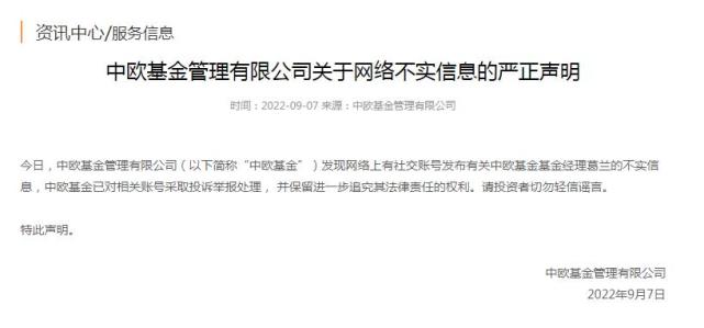 中新经纬9月8日电 7日,中欧基金官网发布关于网络不实信息的严正声明。 声明称,中欧基金管理有限公司发现网络上有交际账号发布有关中欧基金基金司理葛兰的不实信息,中欧基金已对相干账号接纳投诉举报处置惩罚,并生存进一步追究其法律责任的权利。请投资者切勿轻信大话。 图片泉源:中欧基金网站 此前媒体报道,网传中欧基金基金司理葛兰申请辞职,该消息引起市场关注。 简历表现,被称为“公募一姐”的葛兰此前历任国金证券股份有限公司研究所研究员,民生加银基金管理有限公司研究员,2014年10月参加中欧基金管理有限公司。 克制二季度末,葛兰的管理规模达千亿元以上。(中新经纬APP) |