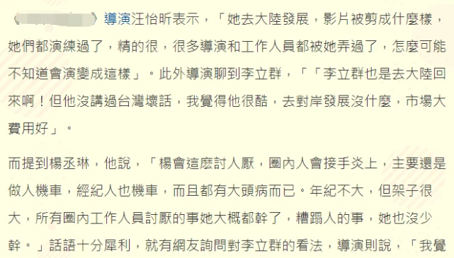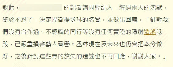 9月8日,杨丞琳经纪人就“海鲜风波”发声回应,怒怼蹭热度和网暴的人。 经纪人回应道:“针对我们没有相助过、不认识的偕行等没有任何实证的隐射造谣诋毁,已严峻侵害艺人荣誉。丞琳现在及将来也仍会把天职做好,之后针对这些无的放矢的造谣也不再回应,谢谢各人。” 杨丞琳近期在一档节目吃“豆腐鱼摒挡”时,透露小时间家庭经济压力大,没吃过什么海鲜,当时间吃海鲜是一种奢侈,又夸大是发展在台湾省的广东人,直接导致部门弯弯人破防了。 “杨丞琳吃不起海鲜”被台湾媒体和电视节目无穷放大,“名嘴”们吵得比俄乌战役还要热闹,更有娱乐圈的边沿人蹭热度,长篇大论攻击杨丞琳。 一名叫汪怡昕的台湾导演,指杨丞琳在台湾演艺圈混不下去才跑去大陆发展,还说她的品德很差,人精得很,许多导演和工作职员都被她弄过,又指杨丞琳人很机车,经纪人也很机场,年龄不大架子很大,全部圈内人士都讨厌的事,杨丞琳大概都干了,摧残人的事,也没少干。 对于这位导演的控告,杨丞琳经纪人体现,两人没有相助过且根本不认识,不要再作没有实证的隐射,针对无地放矢的造谣也不再回应。可以看出,杨丞琳算是很美丽了,没有告状对方,同时明白对方是要蹭热度,以是不会再剖析。 杨丞琳小时间吃不起海鲜,并不是什么希奇事,有槽点但不至于闹得满城风雨,台湾女歌手阿爆(阿仍仍)受访体现,现在看到的只是一个片断,这个片断会产生差别的判断,资讯要多一点才气判断,声援杨丞琳。杨丞琳的闺蜜金勤在微博为其发声:“用善意的心情去明白别人的话,会让天下单纯风雅容易。” 据悉,38岁的杨丞琳祖籍广东合浦,从小在台湾省长大和发展,她在2019年嫁回大陆,与歌手李荣浩被视为金童玉女,风波发酵之后,杨丞琳遭到不少台湾网友网暴,她关闭了交际平台留言权限,沉默沉静数日直至9月8日由经纪人发声。 |