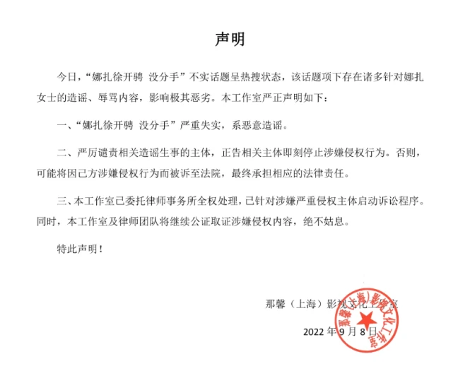 前段时间,徐开骋被前女友张天爱重锤语音的变乱在网络上掀起不小的波涛,在两人此前的感情纠葛中,古力娜扎也被牵涉在内,此前,就有媒体拍到徐开骋多次与娜扎多次私下见面,推测两人是不是在爱情。 不外,在张天爱晒出灌音证据重锤徐开骋的当天,古力娜扎随后也转发了此条动态,并义正言辞地声明自己并非小三,只是惨遭徐开骋的诱骗,也通过语音看清徐开骋的为人了。 本以为此事之后,娜扎与张天爱两位玉人都会与徐开骋彻底划清界限,没想到克日又有圈内人透露徐开骋与娜扎并没有因此分道扬镳,两人私下还在一起。 针对如许的舆论,当下娜扎举世后盾会正式发作声明,声称娜扎与徐开骋没有分手的消息是有人在恶意造谣,而且工作室已经在举行相干取证,看来也预备用法律本事为公道维权。 别的,工作室也对外发布正式声明,表现“娜扎徐开骋没分手”严肃失实,系恶意造谣。会严肃非难相干造谣生事的主体,而且已经委托状师受理此案,针对涉嫌严肃侵占主体启动诉讼步伐,而且会继续公正取证涉嫌侵权的内容,绝不姑息,可以看出,此次娜扎方简直是态度倔强,预备用法律本事来以正视听。 正如不少网友品评的那样,此前徐开骋的真面貌已经被戳穿,正常女孩都不会继续与其为伍,更何况在此事中也沦为受害者的古力娜扎,何况娜扎也是智慧女孩,也不会在这种事变上云云拎不清。 被爆丑闻之后,徐开骋的古迹也受到了严肃影响,据悉,在事发之际,徐开骋正在与蔡娴静拍摄电视剧《装腔启示录》,此前这部剧已经开机一个多月,徐开骋卷入风波之后,剧组也第一时间做出举措,直接对徐开骋举行换角。 据悉,现在,剧组已经确定让韩东君顶替其脚色,克日,有媒体也拍到韩东君本人已经出如今拍摄现场,至于此前徐开骋拍过的戏份,后期韩东君也会与蔡娴静重新举行补拍。 别的,徐开骋此前还参演了本年备受关注的大片《长空之王》,在被爆负面消息后,《长空之王》片方也将其除名,不知道其出镜的戏份是否会在后期举行删减,大概换角换脸。 据悉,徐开骋在片中的戏份并不少,所饰演的脚色也有肯定分量,以是外界猜疑片方最大大概会对徐开骋饰演的脚色举行AI换脸,毕竟删减戏份大概率会影响到原定的剧情。 别的,徐开骋另有两部待播作品《照亮你》和《花溪记》,信赖后续过程中,剧方也会就此接纳肯定步伐举行调停。 走到如今这一步,只能说徐开骋也是作法自毙,幸亏这件事中,张天爱与娜扎都及时果断与其分开,至心盼望广大网友能对两位姑娘多些明确与善意,不要让诸云云类的不实大话继续传播。 |