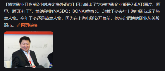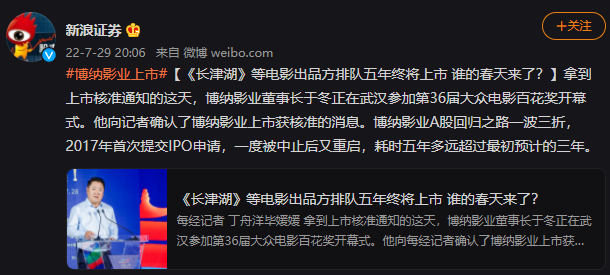 8月18日,博纳影业回归A股,上市乐成。 发行价5.03元,之后连拉7个涨停,近两日受大盘影响,体现有所回落,周五收盘价12.42元,但市值已经实现翻番。 在影视隆冬中回归A股而且上市乐成,博纳迩来的体现给影视圈打了一针强心剂。 以是,谁在看好博纳?为什么看好博纳? 曲折的上市 博纳在资源市场上走得一波三折,用于冬的话来说,就是“起了个大早,赶了个晚集”。 2010年12月9日,博纳影业团体登岸纳斯达克,成为在美国上市的中国影视第一股。 但上市首日股价就一起下跌,当日收盘价较发行价下跌 22.59%。如今仍能在博纳影业的微博看到当时的官方回应:“收市了,本日的股价有点令各人扫兴。但也意味着我们要更加油才可以!以是,没有关系,中国影戏市场须要的不是短期的谋利运动,更欢迎的是真正有信心并乐意见证中国影戏将来发展的投资者。博纳加油!中国影戏加油!” 2010年,本地影戏总票房初次高出100亿。据影戏局转达,2010年天下都会影院总票房到达101.72亿元,较2009年62.06亿元增长63.9%,冯小刚导演的《唐山大地动》创造了6.73亿元国产影戏最高票房的新记录,整年累计有17部国产影片超亿元票房。 同年11月3日,米高梅公司申请了休业掩护,一边是本地影戏市场腾飞,一边是美国影戏产业的暮气沉沉。 在纳斯达克上市的五年,美国市场不停不看好博纳的代价。而这五年里,华谊和光线在A股借着本地影戏市场狂飙突进的东风,股价一起飙升,华谊在最高点市值曾逼近900亿。 直到《智取威虎山》的精彩体现都没能拉高博纳在纳斯达克的股价,2015年6月,于冬决定从美股退市,博纳开启私有化进程。 走了一段弯路的博纳,终极在2017年回A股初次提交IPO申请。 2019年7月,受瑞华管帐师变乱所被证监会存案观察影响,博纳影业IPO中断检察。2020年11月,博纳登岸A股获发审委“有条件”通过。2022年7月28日,博纳影业终极得到证监会答应发行上市。 从递交材推测过会通过1870天,从过会到拿到批文630天,于冬迩来公开表现,这段路走得好费力。 从纳斯达克退市后,博纳没有借壳、不走捷径、老诚实实列队,在这个过程里,影戏大盘突破过600亿,也因疫情回落到200亿;市场在2015年左右履历过资源热钱的涌入,但很快泡沫幻灭,2019年后遭遇隆冬。 隆冬期重回A股,但这段弯路未必不是功德,于冬曾在采访中表现,如果行业最疯狂那几年博纳通过融资拿了许多钱去并购,市值缩水后投资人会受到很大的丧失,一旦这些投资人撤出,对一个企业的发展来说会是一种伤害,一个优质企业的发展还是应该水到渠成,不能拔苗助长。 博纳错过了资源的热闹,但不停在修炼内功,做好内容。 于冬曾说,自己少年期间继承的赤色影戏的基因还在,是挥之不去、陪同发展的。以往传统的主旋律影戏都是概念先行,概念先行之后就忽略了戏剧性,无形中是给观众设了一道墙,就把观众挡在外貌。 从2009年的《十月围城》开始,博纳探索出了一条主旋律贸易片的发展路径,也就是用发展在贸易影戏氛围中的这批职业化水平很高的香港导演,来重新拍摄本地的主旋律故事。 于冬以为,博纳的主旋律大片在美学代价上是有突破的,也就是“在技能上包管了贸易大片的属性,技能一流,靠近好莱坞,乃至逾越好莱坞,在语境上跟年轻人接轨,用一个当代影戏的节奏去完成如许一个故事,而不是已往传统意义上的拍摄方法”。 2014年徐克执导的《智取威虎山》、2016年和2018年林超贤执导的《湄公河举措》《红海举措》、2019年陈国辉执导的《猛火好汉》、2019年和2021年刘伟强执导的《中国机长》《中国医生》……香港导演善于用港产贸易片的叙事节奏和本领,给与主旋律题材不一样的气质和出现,这几部香港导演执导的主旋律大片都实现了票房的乐成。 曾经主旋律大片也不被看好,2018年《红海举措》在春节档上映,还是以黑马姿态实现逆袭,但如今主旋律贸易大片已经成为博纳影视帝国的“护城河”。 号准期间的脉搏 在如今的影视隆冬中连拉七个涨停,投资人为什么会看好博纳? 如今华语票房榜前十里,排名第1、第8、第9的《长津湖》《长津湖之水门桥》《红海举措》都是博纳的作品,已经用票房效果证实白这一品类的代价。 近几年,不少影戏公司的作品由于种种缘故起因未能与观众晤面,大概题材上不符合大众审美而遭遇票房滑铁卢,导致影戏公司团体业绩低迷。博纳则是近几幼年有的稳步发展、每个大档期都有影片推出的排头兵企业,业绩稳固,且门路安全。 制止发稿前 回看博纳发展中的三个庞大迁徙变化,可以说是每一步都踩在了期间的脉搏上。 在上市敲钟时,于冬约请了五个高朋,分别是他当年就读北京影戏学院时的班主任吴曼芳、在北京影戏制片厂的老向导韩三平、博纳创建之初发行的第一部影戏《说出你的秘密》导演黄建新、为博纳开启主旋律大片的徐克导演、如今为博纳艺术掌舵的陈凯歌导演。 从一起敲钟的高朋人选中,于冬本人和博纳发展的路径清楚显如今各人眼前:科班出身、曾入体制、出走创业、携手香港、主旋律称王。 1993年到场工作时,于冬遇到了中国影戏发行体制改革,从发行发迹开始创业。于冬曾拎着拷贝天下跑,深入行业、胆子大、头脑活,放弃体例出走创业是他的第一次迁徙变化,而第二次迁徙变化则是与香港影坛的牵手。 千禧年后,于冬赶上了香港影戏人的北上潮。2003年,《本地与香港关于创建