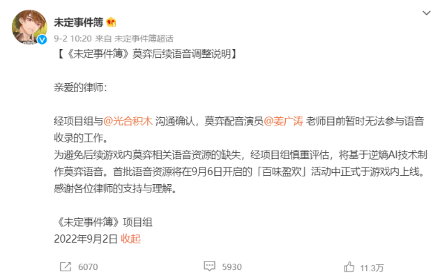 作者|毛丽娜 编辑|李春晖 隔断配音演员姜广涛被带走已近两个月,黑白尚无定论,其到场的广播剧、游戏等配音工作均处于停息状态。广播剧还好说,乙游可等不起,尤其是姜广涛分量较重的两款——《未定变乱簿》与《时空中的绘旅人》。 8月下旬,《未定》与《绘旅人》官微先后公布将接纳AI配音度过难关。《绘旅人》与网易互娱AI Lab互助,《未定》则使用自家开辟的逆熵AI对姜广涛的声音举行提取再制作,并在未来的新卡中应用。 消息一出众口纷纭。附和者以为这比换新CV更容易让人担当,反对者则担心AI配音没活人味儿。而随着两款游戏的新语音实装,大众终于能一窥AI老公的体现。 感恩科技,二嫁乐成 《未定》玩家丸子因姜广涛失事非常颓丧了一阵。姜sir在《未定》中为莫弈配音,而她正是莫夫人。姜广涛失事后,“老公要变哑巴了”。 一样平常来说,CV塌房且无法调停的环境下,厂商会直接换人。但这是个受累不讨好的活儿,又要贴脚色,又要有本身特色,还得让先入为主的夫人们满意。《光与夜之恋》因CV李元韬塌房换人,拉拉扯扯半年,还引出好几场网暴骂战。丸子很担心自家老公会像隔壁陆沉,一哑就是半年,还搞出摩斯暗码电话这种国乙笑话。 如今她根本放心了。米哈游在9月2日公布接纳逆熵AI举行声音处理处罚制作,9月6日新运动莫弈带着AI声带回归,《绘旅人》的AI版叶瑄也实装完毕。两款AI老公初登场,市场反馈大多是正向的。 “震惊了,前十秒真没听出什么区别,音色完善复制。”有网友录制了《绘旅人》叶瑄卡牌语音,初听确实与姜广涛原声区别不大。但仅限于短句,稍长一些的句子还是有“机器感”,比如感情不到位,轻重音读错。 米哈游的逆熵AI体现得则更加完善,新卡语音听起来跟真人差不多,黑白句的处理处罚也优于《绘旅人》。丸子表现,实在细致听还是能听出AI与姜sir的差异,但能做到如许已经满意了,“至少AI老公没有塌房题目”。 《未定变乱簿》的配音列表中,莫弈的CV也从姜广涛改为“莫弈”。有退坑玩家表现,这一改反倒让她有回坑冲动,“那种纸片感变得更强了。任何让纸片人变得更纸片的技能,都是好技能”。 AI莫弈的体现实在并不令人不测。7月中旬,米哈游打造的捏造人鹿鸣初次在B站直播,就让大众见地到了“技能宅接济天下”(米哈游slogan)的气力。 在直播首秀中,鹿鸣到底有没有中之人,是弹幕讨论最多的题目。鹿鸣的口型与声音完善同步,且有真人语言时的小停顿、气声等。也正是这次直播,让米哈游的逆熵AI技能打响了名头。 这次莫弈语音实装,算是逆熵AI的“第二次公测”。颤音、气喘这类细节均有出现,加强了卡牌的“真人感”。 为《绘旅人》提供技能支持的是网易互娱的AI Lab。2021年1月,五大卫视跨年晚会团战,浙江卫视靠捏造人博得不少关注,也就是网易互娱AI Lab打造的“万一”。比起纯二次元风的鹿鸣,万一更像真人,以假乱真感更强。 万一不及鹿鸣的影响力及认知度高,但网易互娱AI Lab在声纹辨认技能方面也很有竞争力。2020年,网易互娱AI Lab在环球规模最大的声纹辨认角逐中,拿到文本相干辨认赛道综合第一与单模子第一。 万一还发行过单曲《一人禅》 别的,与合成声音相比,网易互娱AI Lab似乎更善于面部动捕及技能合成。客岁上线的女性向游戏《绝对演绎》中也应用了面部动捕技能,游戏捕获玩家心情后在纸片女主身上还原。 总之,AI老公的登场以及玩家的正反馈,让饱受CV塌房之苦的厂商们看到了渴望。 配圈腾飞,题目不少 如今做游戏,尤其是二游和乙游,CV已成揽客标配。像姜广涛如许的着名配音,本身就自带粉丝能给游戏引流。也由于CV的紧张性日益进步,原来处于幕后的配音圈被奉上台前,乱象也接踵而至。 在《还是藐视配音圈了》中,硬糖君归纳了当下CV塌房的各种姿势。只有想不到的角度,没有塌不了的房子,CV频仍塌房也为厂商带来了不小困扰。 最刀切斧砍的办理办法就是换人。但一方面玩家听惯了之前的声音,对新人难免有抵触,还会对比新旧CV的咖位、资历,任何一点差距都会引发维权战争。 另一方面,CV圈也盘根错节,有师徒交情,有同门至好。当初李元韬失事,听说北极光工作室也问了不少着名CV,对方多囿于圈内友好不肯接下烫手山芋。末了在北极光工作室苦苦恳求之下,原来为副角陆霆配音的刘北辰改为男主陆沉配音,叔叔直接变老公。可饶是刘北辰资历、水平在业内都排得上号,仍有人暗自吊唁李元韬。 如今,AI配音给了厂商们换人以外的另一个办理方案:配音老师不消担心冒犯偕行,玩家不必担心老公不贴脸,厂商也省去了两面不是人的尴尬。 在行业飞速发展过程中,CV忽然腾飞还没来得及担当身份转换,塌房偶然也无可非议。信赖待到行业更加成熟,配音演员也会严格要求本身,塌房不会像如今这么频仍。 实在,比起偶然性的塌房,声音缺乏差异性这个常态化题目大概更值得关注。 阿杰、夏磊、吴磊、赵路等几位老师,险些包揽了市面上几款头部乙游的配音工作。原来纸片老公就有形象人设高度雷同的题目,再共用声带,更让人傻傻分不清楚。 “我玩来玩去,感觉本身不停在和阿杰谈爱情,一想到这就有点代入不进去。”有玩家告诉硬糖君,被共用声带困扰的她,干脆关了配音玩乙游,以减轻那种肴杂感。 真正的乙游老公们 这几年,二次元游戏也开始器重配音。7月,《原神》毫无
