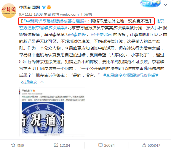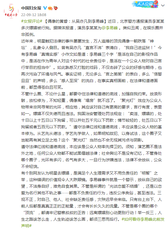 9月11日,演员李易峰因多次嫖娼被警方转达,并被行政拘留一事引发全网热议。而在此之前,李易峰本人以及工作室还在做末了挣扎,又是辟谣声明,又是长文自证明净,没想到末了被官方狠狠打脸,因此他也被网友群嘲是“死鸭子嘴硬”!事变发作后,李易峰的演艺古迹彻底凉凉,他由于自己的“不洁身自好”自毁前程,真是让人无比唏嘘。 李易峰多次嫖娼被转达后,不少网友都体现非常震动,由于他平常塑造的形象太好了,阳光且正能量,没想到私底下竟然云云不堪,以是事发后,网上都炸锅了。之后,另有多家官媒了局点评了李易峰变乱。 9月11日下战书,中国消息网批评道:“网络不是法外之地,实际更不是”!官媒直言不逾越道德底线、不触碰法律红线是做人的根本准则。而作为公众人物的李易峰应该更知晓这一点,但他却知法犯法,末了更是抱荣幸生理,盼望“大事化小,小事化了”,更是不应该。以是李易峰完全就是被自己给“作”没了。 12日,中国电视艺术家协会官微也发文点评了李易峰变乱:“崇德尚艺是文艺工作者的根本要求”。 官媒称文艺要塑造民气,而文艺工作者起首就要塑造自己。着名演员作为公众人物,一言一行都会被社会各界关注,一举一动也都会对社会产生影响,更应该榜样服从法律法规,爱惜自己的社会形象。官媒还直言无论曾经有多么好的结果,要是不洁身自好,冒犯了法律法规,所谓功名都会烟消云散,前程也将毁于一旦。但李易峰显着忘记了这些,因此才会让自己的大好前程彻底毁掉。 与此同时,中国妇女报也了局点评了李易峰变乱,而且还提到了曾经的“顶流”吴某某,两人曾是好兄弟,现在都由于触碰法律自毁前程,还真是“一丘之貉”。 李易峰在被转达的前一晚连连发文自称明净,结果末了被打脸,与之前吴某某的做法何其相似。但这些诡辩在究竟原形面前,以及法律和道德面前都显得惨白且可笑。而更可笑的是,李易峰曾在某杂志采访上被问及自己最宝物的东西是什么时,他答复的是“贞操”。联合此次的变乱,他确实是搞笑了…… 官媒体现无论身在什么圈、是什么星,都要守住法律和道德底线,增强自我束缚。而李易峰变乱就是一个警示,不洁身自好不免自食其果。假如三观不正的话,灾殃也早晚会到临。文末官媒借用了警员叔叔的正告:阔别嫖娼别心动别办法! 值得一提的是,在李易峰被转达后,各大品牌纷纷发文公布与其解约,以是李易峰现在不但星途尽毁,之后还大概面临补偿。不但云云,他曾经所参演的影视剧也相继将其除名,之后娱乐圈估计也会“查无此人”了。 李易峰之前不绝都是正能量满满的演员,形象正面,而且不绝致力于公益,本来他的星途会一片大好,但终极却由于如许的变乱而彻底凉透。不知道李易峰现在有没有为自己的知法犯法感到羞愧和痛恨呢?那么,各人对李易峰变乱怎么看呢? 图片源于网络 |