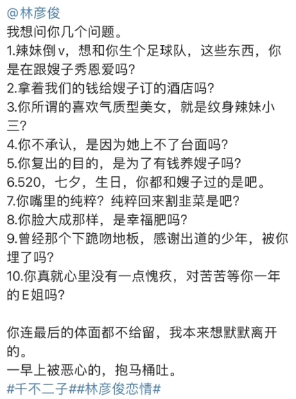 文 | 爱猫小说家中秋佳节的末了一天,我突然刷到之前与现在的网络‘吃瓜’合集,包罗但不完全包罗中秋节当天及越日让人震动到现在的xx瓜。反复看反复笑,着实不由得了,来大胆地给这些‘瓜’摆列出来,渴望各人看到,图一乐,也祝各人,中秋快乐(迟到的祝福)。 本年比往年差别的是,内娱开始‘剑走偏锋’,改走笑剧门路了,很多热搜一‘爆’,我们惊奇的不是谁家爱豆又塌房了,而是,这灌音怎么这么可笑? 闺蜜、朋侪、同事纷纷发来‘贺电/喜报’,恐怕谁错过了这一场场大戏。而且明星们好像分成了两派:爱豆怕爱情被拍;演员怕出轨被锤,另有一种,也就是接下来要讨论的,粉丝与偶像之间该不应有‘隔断感’。 一 站姐瓜 站姐,网络盛行词,又称大炮女神,指的是利用高级相机拍摄偶像的粉丝,亦指明星偶像应援站的构造管理者。站姐这个词开始出自韩国饭圈,也是韩国演艺圈的特殊追星文化。 由于韩国好坏常着名的‘偶像诞生地’,以是好久以来,这个名字并没有在内娱盛行起来。上高中时间为了代购韩国爱豆的署名照、专辑,常常能听到这个词,毕竟站姐的功能有很多,拍摄、代购、应援,无所不能,是‘隔断明星迩来’的粉丝。 而国内站姐‘崛起’,照旧要从‘一日顶流’丁泽仁提及。 信赖很多人都是由于站姐的长文,才知道丁泽仁是谁,没错,就是乐华七子中的一位,《偶像训练生》前35强,厥后颠末乐华娱乐的内部团体出道,就是和范丞丞、黄明昊一个组合。 总结下来就是,他谈爱情被站姐发现,一边低头认错,一边被录下了神发言;站姐选择包容过,到反面看得出来着实是忍无可忍,逐而曝之。从她爆出来的谈天记载里,我们可以知道:她给丁泽仁买的迪奥、古驰、纪梵希等奢侈品共计高出60万;跟拍丁泽仁的两次巴黎行程,花了小20万。 是啊,追星哪能不费钱呢,这也就是为什么偶像不能十拿九稳的官宣恋情了,由于有大概造成与丁泽仁一样的了局,只不外现在的内娱也没有比他还糊的了。 实在很能明白如许的粉丝心情,毕竟花了这么多钱,而且看她与丁泽仁的谈天记载中,两人偶然候的攀谈密切到看不出来到底是粉丝照旧情侣,如许的隔断关系很难到末了不崩。 下面是丁泽仁的‘致命’语录: “姐,我的命真的端赖你了” “我真的不能再失去姐了” “我求你了姐别不要我” “这两个字我不要再听到了。听到没有?我再跟你说一遍,我对你是至心的。”“你是我的劫(姐),是我唯一的劫!” 一开始站姐还算有耐烦,毕竟丁泽仁那里太卑微了,可逐步的,站姐直接忍不了了,感情冲动、扬声恶骂,说自己瞎了狗眼,还悉数把他之前干过的事一尽倒了出来。 除了丁泽仁事故的爆出,我才过细研究了一些跟他一样的爱豆塌房的过程,只是没有他这么糊,却也都一样。比如妹妹张子枫突然爆出的绯闻男友焉栩嘉,就由于多次爱情被站姐爆了好频频;焉栩嘉的队友翟潇闻,曾给站姐发语音唱《逐步喜欢你》;另有黄旭熙竟然来往韩国站姐,还在粉丝眼皮子底下‘暗送秋波’…… 另有很多说不上名字的小爱豆,一个顶一个的糊。实在我前面也说了,‘站姐’是离偶像迩来的粉丝,毕竟她们常常在火线照相,跟的行程也多,也能在男爱豆面前混个眼熟;于是只要爱豆被爆出爱情,她们肯定是第一个跳脚的。 二 分手瓜vs乱搞瓜 上周的林彦俊爱情瓜不知道各人看了没有,我朋侪就跟我吐槽,说他怎么这么没数,谈爱情就算了,怎么和他之前说的要求不太一样? 是的,曾经《偶像训练生》第五出道位,一副高冷男神人设的林彦俊,不知道恶心了多少自家粉丝。固然被爆料后个人有回应,但我看完总结下来就两句话:没认可,但有点嘴硬。 粉丝十问林彦俊,而后站姐直播被挤爆,接下来还被拔出各种不雅的运动,显着刚要转型做演员,路就被堵死了。无论工作室怎样公关,他本人怎样‘撇清自己’,毕竟就是云云,当爱豆一谈爱情,塌房是一定的效果。 林彦俊的瓜到现在也就告一段落了,毕竟没有什么‘灌音’,更没有什么反转,各人唏嘘的大概是现在的饭圈文化已经开始崩坏,很多爱豆都是表里两幅面目,追星,还不如看看剧。 提及追剧,我的一些影视行业朋侪们,非常担心现在塌房的明星会影响影视剧定档、宣传、播出。 这不,张天爱锤渣男的灌音还没已往多久,男主角徐开骋之前还宣传的新剧《长空之王》预告里就将他‘一剪没’了(不知道正剧里是不是也没有他了)。 各人大概对他没什么印象,由于他之前演的都是霸总的脚色,近期比力出彩的是饰演了《警员荣誉》里的高材生杨树。 爆料当天,张天爱放出的那条视频,又革新了我们对语言笔墨的认知,原来致歉也可以说得这么……尴尬。 徐开骋说:“我天天都生存在痛楚中,对自己的处罚中,对你情不自禁,对你心口不一,对自己身不由己。有一天我肯定会告诉你统统,但大概那是你爱我的末了一秒。你眼中的我,就不再是谁人云云纯粹的我,云云简单的我了。”‘ 徐开骋说:“爱宝,爱宝,爱宝,返来吧”。 …… 固然内娱分手瓜那么多,你看,前有毛晓彤锤陈翔,后有胡冰卿曝光张铭恩,就在锤渣男这件事上,女人就没输过。渣男出轨,内娱见的太多了,但看到徐开骋的表现,除了以为搞笑,就是担心《警员荣誉2》会由于他而搁置,用所长的话来说,大树糊涂呀! 本以为这个瓜到张天爱这就竣事了,没想到,古力娜扎突然一条转发微博又掀起一层浪,否认做小三,告诫各人阔别