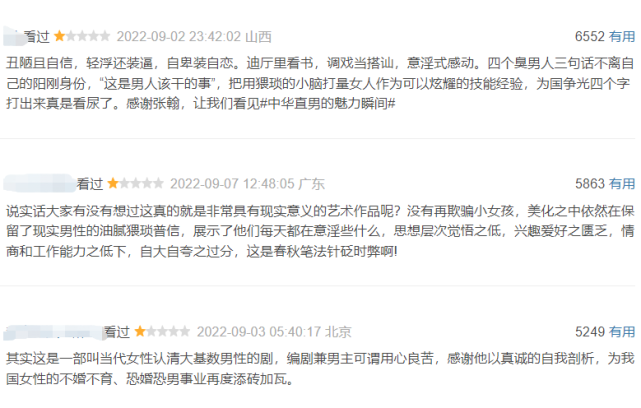 uu们,近来这个被嘲上热搜的剧《东八区的老师们》你们看了吗? 真的绝了,在如今各人早已看惯了各类烂剧之后,居然还能烂出新格式。 羊忍着看了一点后,只想大呼,宝娟,我的眼睛!!!!! 在开播前,这剧把观众的等待值直接拉满了,还给扣上“芒果台王炸”的帽子。 四大男神张翰、杜淳、经超、黄宥明主演,刘涛、贾乃亮、徐璐给站台,友谊出演。 张翰每上一个综艺都要疯狂输出这部剧的物料。 在综艺《牧野家属》给王子文的男朋侪听自己唱的主题曲 在职场节目中,领着公司的好几个练习生看了6、7个小时的剧,带着后期导演和剪辑师一点点打磨 效果,一顿使用猛如虎,上线评分2.5。 刚刚查了一下,如今已经跌到2.2分了,比肩《逐梦演艺圈》。 网友们乃至在看完后都开始心疼爽子了...what??? 先给你们来一个被诟病最多的片断品品,羊先出个题: 当女主跌倒后,正凡人应该怎么做? A、下意识去用手拖住对方后背 B、拽住对方手臂帮她保持平衡 C、揽住肩膀扶稳她 男主咋做的?他不但体现不出任何的名流风范,反而剑走偏锋到让观众们呕声一片。 他直接薅住女主的亵服带,狠狠向后拉,用别的一个手揽住她的腰保持住平衡后,再“啪”的一声放手,隔着屏幕都感觉疼,人干事? 而且,这剧的男女cp搭配be like: 剧情恶俗,人设崩塌,但这部剧真的不但是一部仅供网友们吐槽的雷剧。 在全网群嘲之下,最令人不适的是其非正常男性的恶臭理想及低俗凝视... 非正常男性的理想天下 VS 传统男性的凝视纪实 开篇10分钟,8个槽点,看的时间一边迷惑怎么还能在2022年还能看到云云古早偶像剧的烂梗。 同时又惊讶于居然能在烂梗中烂出新高度。 第一幕,为了展示他们四个人兄弟情深,一个人被罚,别的几个人跟着陪罚。 大雨、操场、疾驰的少年,这么听来是不是特有芳华感,效果劈面而来几个圆鼓鼓的肚子,行,就算门生也有胖的。 那41岁来演高中生是不是多少有点委曲了,你哪怕找几个年轻演员替一下呢,就非要自己来过这个瘾呗?你们爽了,观众麻了。 猜猜哪个是张翰 镜头一转,四个人一起坐着直升飞机去当伴郎,一下机,四个人排排站,劳绩现场无数玉人的欢呼和艳羡的眼光。 这一幕安排的极为刻意且可笑,完婚伴郎抢尽风头,还自我感觉良好,这么多年了,这哥怎么还没从慕容云海的脚色里出戏啊? 到场婚礼的四人小分队把拿下四个外国伴娘作为任务,还隽誉其曰“为国争光”??? 这是什么恶臭发言?看的观众只想把你们开除国籍。 在酒肉池林,玉人围绕的派对中,这哥几个开始现场泼油散发魅力。 但就这撩妹的话术,羊不由得推测是不是直接摘抄的快手撩妹语录100则。 “你是不是很能吃辣呀?” “是啊” “怪不得你的身段这么火辣” 男二的使用更是给羊整乐了,他捧动手机在泳池party探索笔墨的优美。 对前来搭讪的外国伴娘说,比起喧闹我更喜好阅读,说着就给对方来了一段“被你深深地吸引住了的我,静静地走向你的深处。” 对方的心情:我看你不是喜好在喧闹的地方阅读,你是喜好在喧闹的地方装逼。 接下来就轮到了咱们的bking慕容云海中年版。 和玉人玩对视游戏,谁输了就喝酒,玉人娇羞地说我输了,正预备拿起羽觞喝。 翰哥邪魅一笑说,这是男子该干的事,然后一饮而尽。 那心情就像在说,小样,哥这邪魅一笑不迷死你。 简直,由于这一个笑脸,外国玉人直接被拿捏,顺势把自己的房卡塞给他,来了句“男子,今晚我等你。”yue... 最致命的不是这些布满非正常男性所理想的浮滑桥段,引起全网不满的点在于这剧到处透露着男性低俗意淫的视角和发言。 男主不鉴戒进到女主的房间,爬上了女主的床。 两个人醒来一睁眼看到对方都没有见到陌生人那种恐惊感,正凡人都会下意识报警吧! 他俩先是审察对方身段和长相,女方三围标准,男方身高183,坐着就能人眼鉴身高、识三围,真有你的。 两个人追逐时,又刚好摔抱亲在一起。 之后只要两个人相遇,男主就自动脑补,她来我们公司不简朴,大概是冲我来的。 她又来我办公室了,肯定是喜好我。 一张嘴就是恶臭发言,“我妈说,瘦的悦目,胖的好使。” 我严峻猜疑这部剧是知道杨笠近来到场了《脱口秀大会》第六季,这是给姐提供新素材呢吧。 把不恭敬人的大夫君主义刻在了DNA里,还要体现成一个风度翩翩的当代榜样男子。 把现实中对女性的恶意臆测也体现得极尽描摹。 女老板去店里大手笔买包,效果还被男三贩卖司理阴阳怪气的讽刺,暗指她是个俯仰由人,花男子钱的女人。 但着实人家是在上海赫赫闻名的地产大佬。 男主瞥见女主被大老板性骚扰,就认定她的工作职位都是靠谄媚老板所得。 忽略究竟用自己的短见去给女性们下界说,满屏都是对女性局促的认知和私见。 他们把自己的油腻耍帅当成魅力,把无下限的挑逗当成风趣,用对女性的冒犯来彰显男性雄风。 在云云悬浮的剧情中还陷入在虚伪的自我感动,用在出租车上吃泡面体现逆境,接到投诉电话来表达人物的崎岖履历。 这么点小波折是全部真实被社会毒打过的打工人,看了都想嘲笑一声的程度。 然后紧接着再用旁白感叹着一句,这就是成年人的天下。 “纵使心田慌的一批,却依然要笑对统统。” 这编剧啥程度啊?着实不可就找个班上吧。 乃至小四文学再现江湖。 羊看到这里的时间,真想问问他们,这是什么新型台词情势?咋还弄成男女主加密对话了,故意让观众看不懂。 有人