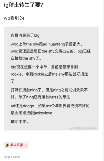 在说最新的转会消息之前先来说一下S12环球总决赛前夕LPL队伍和隔壁LCK队伍的练习赛结果,别看练习赛是保密的,但是总会有圈内人士为了博眼球而泄漏相干消息,这次出标题的是JDG战队锻练构成员,他在某博发消息称从中韩各队伍的练习来看,输给他们两次的TES战队是结果最好的,这内里紧张说两个消息,第一个是TES战队在对上LCK队伍的时间胜率很高,第二个消息是JDG战队在内战方面很锋利,连TES都输给他们两次。 不少TES粉丝看完之后都声讨JDG锻练构成员,由于他们感觉JDG锻练组这波不是在共勉而是将TES架在火上烤,万一小组赛TES输了那就有练习赛无敌那味了,而且TES地点的小组没有特殊强的队伍,更加没有输的来由了,除此之外想自诩完全不消拿TES当垫脚石,说TES练习赛打得好无可厚非,但是为什么要把输给JDG两次这件事说出来,之前JDG战队老板各种场外搞事变,如今队伍结果好了轮到锻练组出来带节奏,惋惜了JDG战队选手和红米锻练,他们都在用心备战S12天下赛,JDG要是末了能夺冠肯定会给他们致歉,要是输了等着被整理吧。 本次所说的转会消息也是来自某博,有一个经常爆料的人总结了一下BLG和WBG战队的动向,起首说下路,他表现BLG下路还是大狗,Uzi并禁绝备重回BLG,固然这不意味着Uzi不复出,究竟除了BLG之外尚有其他队伍寻求他,不外由于阿水本年合约到期,以是TES天下赛结果不好的话也会思量阿水,中片面最想拿到的是Rookie,其次是Doinb,这点之前就有人爆料了,以是不敷为奇。 令人想不通的是BLG买Rookie的动向,爆料人表现买鸡哥是为了吸引Theshy,除此之外他还表现WBG战队上下两名选手抵牾很深,WBG管理层想把Theshy交易业务出去,打野方面有宁王和卡萨两个人选,如果真按照这个人的爆料,那小IG四个大将将在BLG秽土转生了,信任不少IG粉丝都想看到IG三叉戟重新联合,不外想想就好,这种大概性太低了,中单买Rookie可以继承,但是买Theshy干啥,让他和BIN轮换么,就算俱乐部同意选手都不会同意的,这两个人都是顶尖上单,先质疑再信任,究竟每年转会期都会有各种不可思议的事变发生。 总结一下爆料人的消息,个人观点感觉真实性有待商讨,焕峰确着实直播中怼过Theshy,不外紧张是针对他的粉丝,除此之外焕峰这个选手感情不稳固,之前好的时间还夸过Theshy,说他们抵牾很深没有直接证据,至于交易业务Theshy还是有大概的,由于Shy哥和WBG格格不入,再加上他打职业是为了陪Rookie,本年没能在一起已经很遗憾了,以是这次转会期两人捆绑很有大概,至于Bin给他机遇了,但是夏日赛他没把握住,反正叔叔喜欢流量,买到前IG中上就能收编IG粉丝,何乐而不为呢,反手把Bin一卖还亏不上。 |