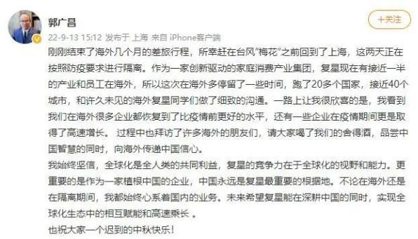 9月13日,复星团体董事长郭广昌在微博表现,刚刚竣事了外洋几个月的差观光程,所幸赶在台风”梅花”之前回到了上海,这两天正在按照防疫要求隔离。 他说:“我始终坚信,环球化是全人类的共同优点,复星的竞争力在于环球化的视野和本事。更告急的是作为一家植根中国的企业,中国永世是复星最告急的根据地。岂论在外洋照旧在隔离期间,我都始终心系着国内的业务。将来渴望复星能在深耕中国的同时,实现环球化生态中的相互赋能和高速发展 。” “一起上让我很欣喜的是,我看到我们在外洋的许多企业的谋划环境都规复到了比疫情前更好的水平,另有一些企业在疫情期间更是取得了高速增长。过程中也拜访了许多外洋的朋侪们,请各人喝了我们的舍得酒,品尝中国聪明的同时,向外洋转达中国信心。我始终坚信,环球化是全人类的共同优点,复星的竞争力在于环球化的视野和本事。”郭广昌表现,更告急的是作为一家植根于中国的企业,中国永世是复星最告急的根据地。岂论在外洋照旧在隔离期间,都始终心系国内业务。将来渴望复星能在深耕中国的同时,实现环球化生态中的相互赋能和高速发展。 值得注意的是,据第一财经,克日,网传北京市管企业收到北京国资委关照,梳理与复星团体的互助环境(不限于持有股票,股权投资,资金出借,工程承包,包管,商贸互助等事项),并研判相干互助风险,形成书面陈诉。 对此,复星团体回应称:我们注意到有网传“北京市国资委关照”。经向北京国资委问询,获悉这一调研是北京市国资委体系的一项一样平常信息搜集工作,没有任何针对性,此前他们也对有关企业发过相干调研关照。复星在北京各项业务发展正常。8月31日公司刚发布半年报,在当前宏观环境复杂多变的配景下,仍旧保持妥当和韧劲,各项业务安稳运行。 9月13日,复星国际(HK0656)跌4.11%,收报4.9港元/股,市值为408.8亿港元。(泉源:郭广昌微博、第一财经、公开信息;整理:方凤娇) 编辑:李云鹏 |