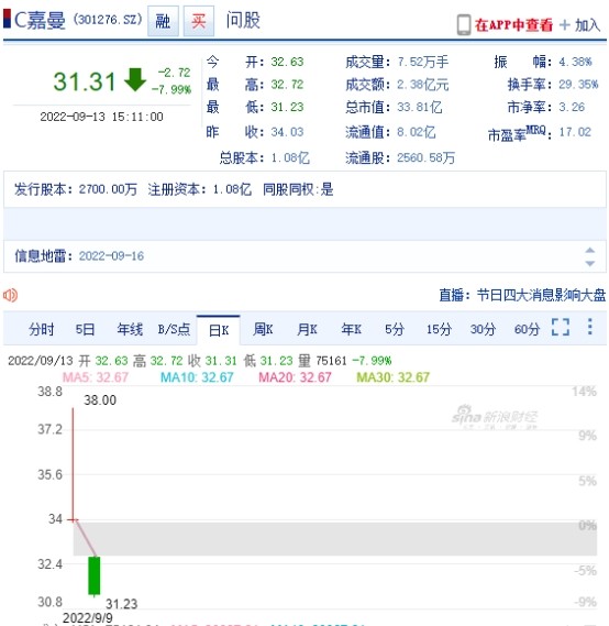 中国经济网北京9月13日讯 本日,嘉曼服饰(301276.SZ)股价下跌,制止收盘报31.31元,跌幅7.99%,总市值33.81亿元。 嘉曼服饰于9月9日在厚交所创业板上市,公开公开辟行股票2,700万股,发行代价为40.66元/股。上市首日,嘉曼服饰收报34.03元,跌幅16.31%。 嘉曼服饰发行召募资金总额为109,782.00万元,扣除发行费用(不含税)后召募资金净额为99,458.56万元。嘉曼服饰终极召募资金净额比原筹划多47,350.56万元。2022年9月5日,嘉曼服饰发布的招股书体现,公司拟召募资金52,108.00万元,分别用于营销体系创建项目、电商运营中心创建项目、企业管理信息化项目、增补活动资金。 嘉曼服饰的保荐机构(主承销商)为东兴证券股份有限公司,保荐代表人为姚浩杰、张仕兵。嘉曼服饰发行费用共计103,234,368.96元,东兴证券股份有限公司得到保荐、承销费用81,449,528.30元。 |