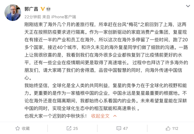 腾讯消息《一线》 作者 何西 “复星现在有靠近一半的财产和员工在外洋,以是这次在外洋多停顿了一些时间,跑了20多个国家,靠近40个都会,和许久未见的外洋复星同砚们做了过细的沟通。” 9月13日,复星国际董事长郭广昌在交际媒体发文,变相回应克日以来的多种听说。他夸大,“作为一家植根中国的企业,中国永久是复星最告急的根据地。岂论在外洋照旧在隔离期间,我都始终心系着国内的业务。” 此前一周,有市场消息称北京市管企业收到北京国资委关照,要求梳理与复星的相助情况,并研判相干相助风险,形成书面陈诉。对此,复星回应称这一调研是北京市国资委体系的一项一样寻常信息搜集工作,通过专用体系下发。 腾讯消息《一线》获悉,复星与北京国资委体系将举行专项聚会会议,郭广昌或以视频方式参会。 此前在担当腾讯消息《一线》专访时,郭广昌曾表现,复星的界限从财产和地区两个维度来看,都已经充足宽阔。在财产上,复星涉足包罗金融、保险、医药、时尚、文旅等多个复合型赛道;在地区上,复星通过收购与扩张,涵盖了包罗西欧、亚洲等多个地区,反映在收入结构上,起2019年上年年高出40%收入来自外洋。 郭广昌坦言,复星在这些财产和地区结构的过程中“付出了很多代价”,不外在确定完成前述结构之后,复星决定“深耕已有财产和地区”。 “以是从客岁开始,我们提出要深耕地区、深耕财产,本年我们进一步提出要聚焦。”郭广昌对腾讯消息《一线》表明,复星的重点不再是拓展多少新的财产,也不是开发多少新的地区,而是专注已有的界限,聚焦已有的财产,深耕已有的市场。 |