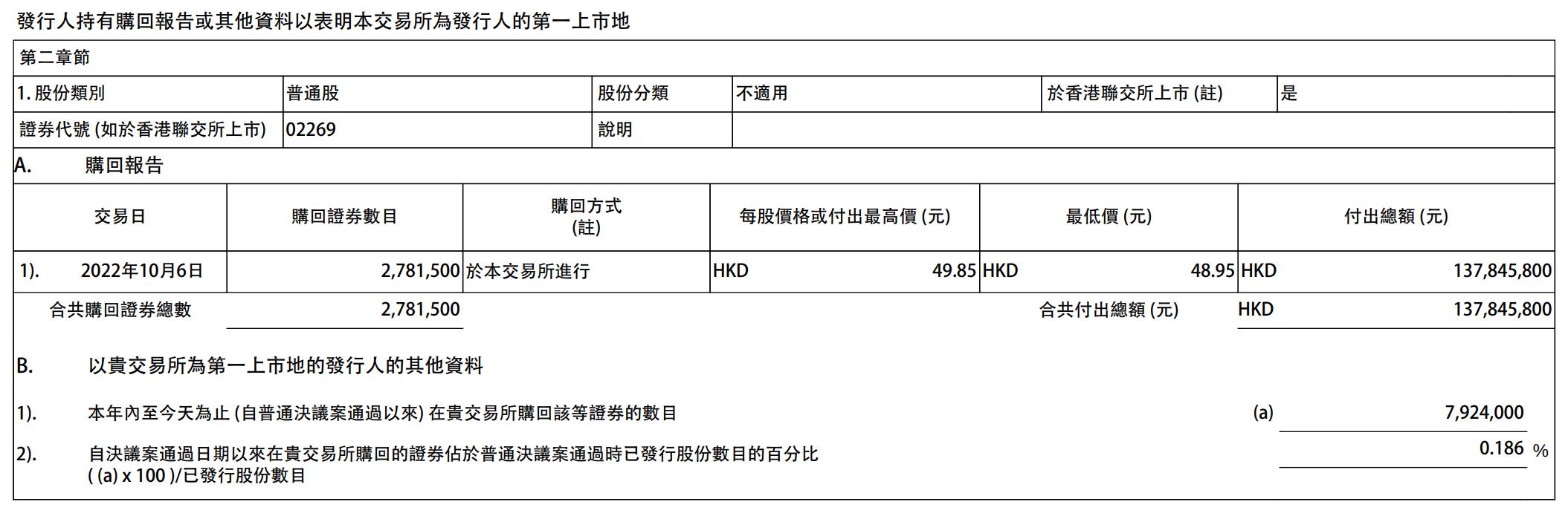 药明生物10月6日公告,2022年10月6日,公司耗资1.38亿港元回购278.15万股公司股份,回购代价为48.95港元/股-49.85港元/股。 |