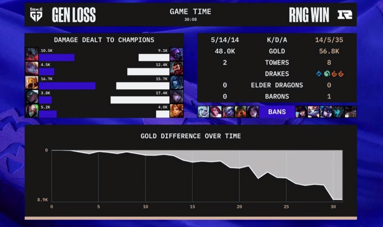 各位LPL的观众和好汉同盟召唤师各人好,这里是天卑鄙戏汇。 在EDG被T1暴打之后,LPL的四号种子RNG是小组赛首战,面临LCK的一号种子GEN,在大多数人都不看好的情况下,直接在开局中筹划特殊套路打出上风,提前解锁中野联动解放小虎丽桑卓,用LPL式的阵容体系,在前期打出很大上风。 GEN选出了一个容错率很低的阵容,赛娜炼金零作用,被RNG轻松扩大上风终极输掉了角逐。 GEN选出炼金,但对线大劣GEN与RNG的BP,GEN蓝色方是按次序选,上单剑魔打野波比,三手出中单沙皇,二轮AD被BAN的情况下出了赛娜炼金的组合。RNG后手也是按次序选,先拿武器打剑魔,中野出丽桑卓男枪,二轮选出厄斐琉斯与女坦的组合。 阵容对比上GEN又是一套主打拉扯的阵容,RNG三核心搭配中辅先手开团抓机遇打上风,双方上路的对线和中期发育很关键。 开局RNG打入侵套路,女坦E闪逼出赛娜闪现然后反掉红BUFF,WEI随后直接来中路逼出Chovy闪现,又是一波回马枪双闪现想要强杀Chovy但失败了。 不外RNG是直接变奏中野联动去上路,武器推线到塔下越塔击杀了剑魔。 WEI是一连带节奏导致自己野区发育落后,但队友很舒服,下路对线炼金有点尬,补刀落后许多,不久之后RNG中野辅捉住中路Chovy完成了击杀。 下路RNG是抓机遇先手炼金逼出闪现,后GEN困绕下路,但伤害不敷双方拉开了。 RNG瞬间开团,乐成击败GENRNG前期是拿下一龙和一前锋,野辅联动启动后是在GEN野区蹲赛娜,Ruler来了之后被指到直接击杀,GEN是野辅强行过来击杀了男枪,但GALA厄斐琉斯赶到击杀了炼金,总体是1换2。 15分钟GEN三人上路抓Breathe,呼吸哥是选择直接冲赛娜,被连续追击后,炼金一个背摔把呼吸哥背到赛娜身边导致赛娜直接阵亡,双方1换1。 中路GALA被留住,出现失误没有第一时间后撤,被Chovy击杀。 资源争取上,RNG拿下二前锋,拆了下路一血塔,上路GEN两人威胁武器被小虎TP反困绕击杀后,Breathe拿下上路防御塔。 21分钟三龙团战,RNG中辅瞬间开团出场,RNG第一时间快速击杀两人,付出男枪一个人的代价,后直接Rush大龙并乐成拿下。 大龙BUFF推进,Peanut先手后被RNG击杀,小明也阵亡,RNG选择后撤。 27分钟龙魂团之前,RNG野区直接抓死了炼金,之后顺遂拿下火龙魂,在末了一波大龙团的争取中,小虎出场后被击杀,但GALA直接放烟花共同男枪输出清场,一波竣事角逐。 关于RNG逆袭的个人见解个人以为RNG这一战可以或许取胜,可以说是出乎了许多观众的预料,由于在入围赛阶段RNG的状态是很差的,从入围赛突围乐成后备战小组赛的时间也很短,必要先从墨西哥转移到纽约,但在如许困难的情况下,RNG却突然逆袭,显现出了非常好的竞技状态。 起首在对阵GEN的角逐中,RNG是有开局筹划的,是以寻衅者的姿态去打GEN,一级直接入侵拿红,然后一连干扰Chovy的发育节奏,只管没能击杀,还是共同小虎上路越塔击杀了剑魔。 然后就是GEN的这一手特殊下路组合,炼金赛娜面临厄斐琉斯对线打不了,炼金补刀都困难。在GEN陷入劣势的情况下中期这个阵容是根本就没有伤害的,导致许多团战打起来,RNG的容错率太高,导致GEN根本打不了。 RNG方面本场险些是没有出现什么失误,如许的状态提拔无疑是令人惊喜的,渴望RNG之后继续积极,夺取在首轮拿到全胜战绩。 |