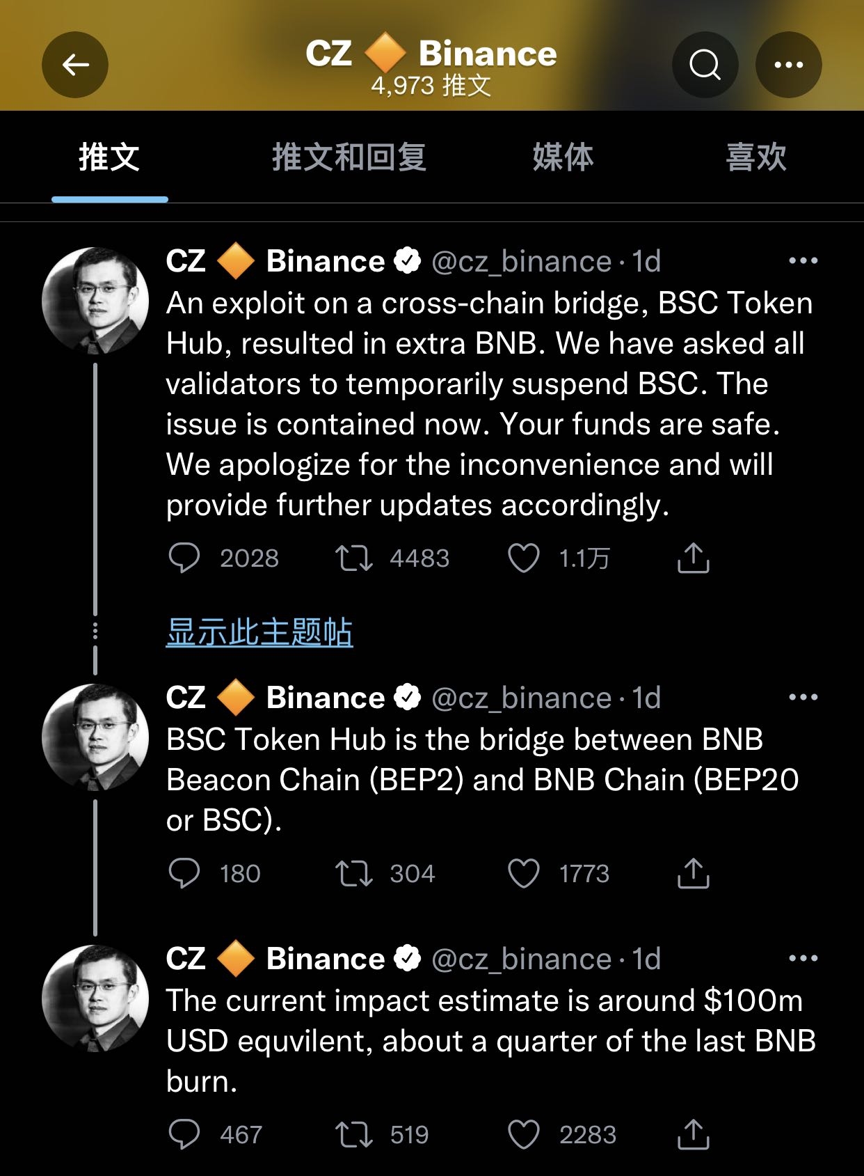 中新经纬10月8日电 据华尔街日报中文网报道,加密钱币生意业务所币安(Binance)周四晚些时间表现,币安智能链(Binance Smart Chain)区块链网络遭黑客攻击,大概导致1亿美元被盗。 报道称,在检测到两个区块链之间桥梁上的毛病后,币安智能链已停息生意业务和资金转移。 另据FT中文网报道,黑客攻击的目标是BSC Token Hub,后者是毗连两个币安体系的桥梁。 赵长鹏推特截图 币安首席实行官赵长鹏也在推特上发文称,这个标题涉及跨链桥BSC Token Hub。跨链桥可以大概将数字资产和信息从一个独立的区块链转移到另一个区块链。 赵长鹏写道:这个标题现在得到了控制,客户的资金是安全的。他还对造成的未便表现歉意。 资料表现,币安链于2020年9月推出,旨在为日益昂贵的以太坊主网提供更换的智能合约平台。(中新经纬APP) |