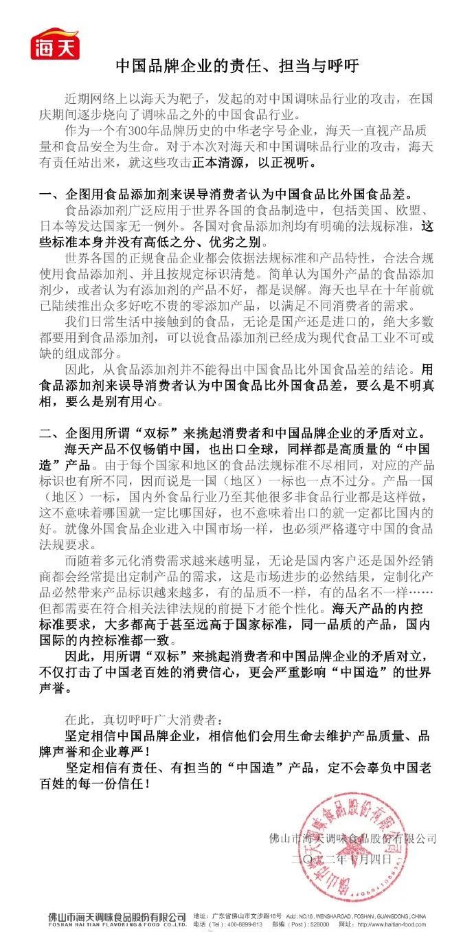 作者丨张向阳 编辑丨刘肖迎 “海克斯科技”“科技与狠活”……国庆假期,与海天酱油相干的的话题不绝冲刷着热搜榜。网友们讨论的焦点,是海天酱油在中国市场与一些国外市场对添加剂利用的“双重尺度”。 原是游戏用语的“海克斯科技”,本指邪术与科技的融合技能。这几天,“海克斯科技”成了海天酱油的标签。 别藐视一瓶不起眼的酱油,卖酱油但是一门好买卖。 酱油是调味操行业最大的一个子品类,2020年,我国酱油市场规模就已达850亿元。行业龙头海天味业的酱油产物毛利率一度超50%,2022年上半年卖酱油收入75亿元,其董事长兼总裁庞康,早已是身家千亿的富豪。 01、海天态度倔强 2021年,中国的酱油产量为788.15万吨,出口量为18.34万吨。而海天味业酱油产物的生产量为265万吨,贩卖量为266万吨,是行业绝对的龙头。在财报中,海天味业并没有披露境外市场的贩卖情况。 不外,在2022年半年报中,海天味业称,公司产物已出口环球80多个国家和地区。 海天味业此次风波,正是由出口酱油与国内酱油的“差别”而起。 国庆假期前夕,有博主及网友晒出在日本、加拿大等国家购买的海天酱油,配料表中只有水、大豆、小麦、食盐等质料,而在国内购买的海天酱油,配料表中含有多种添加剂。 在国内购买的海天酱油,产物名称为老抽酱油(酿造酱油),配料中有水、非转基因黄豆、食用盐、焦糖色小麦、小麦粉、谷氨酸钠、5'-呈味核苷酸二钠、5'-肌苷酸二钠、三氯蔗糖、黄原胶、苯甲酸钠。 食品安全相干国家尺度对食品添加剂是如许界说的——为改善食品风致和色、香、味,以及为防腐、保鲜和加工工艺的须要而到场食品中的人工合成大概天然物质。食品用香料、胶基糖果中根本剂物质、食品工业用加工助剂也包罗在内。 该尺度体现,谷氨酸钠(味精的紧张身分)、5'-呈味核苷酸二钠、5'-肌苷酸二钠为增味/鲜剂,苯甲酸钠为防腐剂,三氯蔗糖为甜味剂,黄原胶是一种增稠剂。 “为什么国表里是双重尺度?”一时之间,针对这一焦点标题,引发热议。 9月30日晚间,海天味业初次回应称,海天味业全部产物都严格按照《食品安全法》生产,均符合《食品安天下家尺度》;并称部门短视频账号“恶意造谣诽谤海天”“黑化中国食品安全”,将委派状师观察取证、追查法律责任。 假如海天味业大大方方地表明和科普,这个风波大概逐步就消散了,但是,对于网友最关心的“双标”标题,海天味业在回应中并未给出正面表明与科普。 由此,再次引发了一波讨论高潮。 直到10月4日深夜,海天味业再度作出回应:各国对食品添加剂均有明确的法规尺度,这些尺度本身并没有高低之分、优劣之别。“用食品添加剂来误导斲丧者以为中国食品比外国差,要么是不明本相,要么是别有专心。” 海天味业在声明中还表现,“计划用‘双标’来挑起斲丧者和中国品牌企业的抵牾对立,不光打击了中国老百姓的斲丧信心,更会严肃影响‘中国造’的天下荣誉。” 这一次回应,海天味业直接上升了高度。 几分钟后,中国调味品协会也发布声明称:“支持因舆情受到影响的调味品企业依法维权,追究网络造谣者的法律责任。” 对于食品添加剂的利用,有对应的相干尺度。海天味业大概是占理的一方,但对于质疑的回应,不直接科普与表明,而是态度倔强,难怪网友愤怒。 有网友表现,国表里尺度不一样很正常;也有许多网友以为,海天味业的危急公关处置惩罚太差,显着可以直面标题,非得上升高度。 02、强势龙头,千亿富豪 海天味业既是酱油这一细分市场的龙头,又是调味操行业的龙头。因此,海天味业经常被称为“调味品界的茅台”大概“酱油界的茅台”。 酿制酱油的关键环节之一是晾晒。佛山位于北回归线之上,阳光充沛,具备地理上风。海天这个酱油帝国,往上追溯,就是诞生在清代中叶的佛山古酱园,距今已有三百多年的汗青。 1955年,佛山地区的25家古酱园归并重组,酿成了一家新的酱油厂。其时,海天的规模最大,遂将组建后的酱油厂定名为佛山市公私合营海天酱油厂,后又改名为佛山市珠江酱油厂。这便是海天味业的前身。 固然在清代末叶有过较大发展,但总体来说,海天的贩卖范围还是有限,到20世纪80年代,市场也未完全打开。 要说最大的突破,还是在庞康手中。 庞康是土生土长的广东人。1982年,大学毕业后,年仅26岁的他就进入海天继承副厂长。陪伴着酱油厂的改制,海天彻底酿成了一家民营企业。而积极研讨业务的庞康,也一起提拔为公司的董事长兼总司理。 庞康甚少露面,流传的故事和语录天然也少。从点滴的报道中,大概可以看出,他在企业管理上,还是有一套的。 在1998年时,庞康就说过,拦阻企业发展的关键,是管理的标题,而管理的症结就是处置惩罚好人的标题。在企业谋划管理上,他不停推进改革与创新。 在20世纪90年代,海天刚积累了一点家底时,庞康就耗费3000万元引进了国外先辈的生产线;2003年,又从德国引进国内第一条全自动包装生产线,包装速率达24000瓶/小时;2005年,他又投资10亿元,建成了年产量超100万吨的海天高明生产基地。 早在1999年,海天的广告就出现在了《消息联播》整点报时环节,成为首个在央视黄金时段打广告的酱油品牌。其时间,国内酱油市场还是散装售卖,尚未有像样的品牌形成。 2001年,海天味业的贩卖收入突破10亿元,2009年突破50亿元。 2014年2月,海天味业上市,
