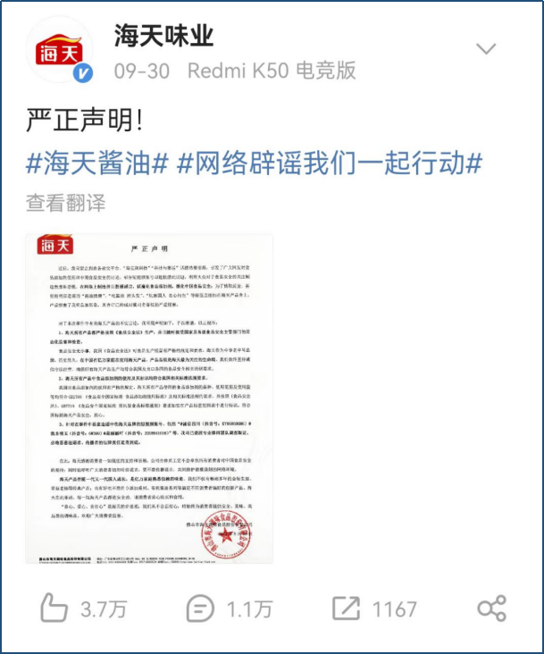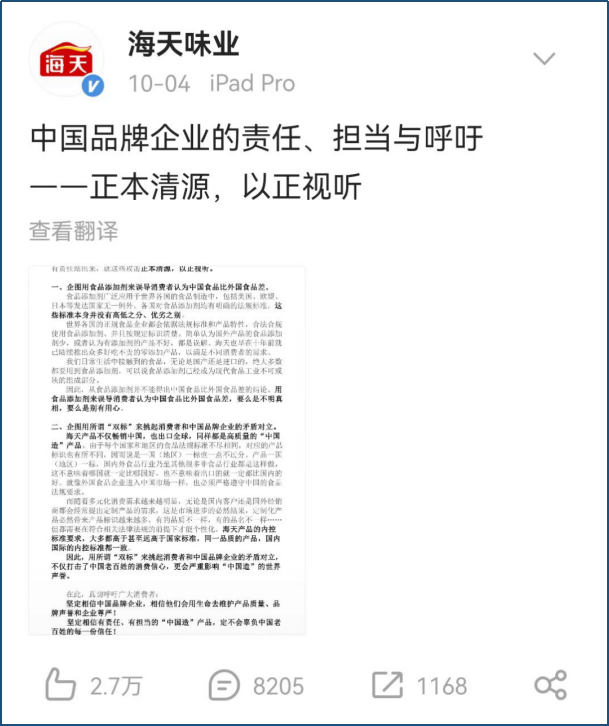 在民以食为天的中国,“柴米油盐酱醋茶”是厨房里必不可少的调味。但是,调味品龙头海天味业近期却陷入了舆论风波。 海天味业卷入添加剂风波 “海天金标生抽”,称得上是海天味业的王牌产物,但近期,据证券时报报道,有部分短视频指出海天味业的酱油是“海克斯科技食品”(本意是科技与邪术融合的技能,网络上暗指添加了各类食品添加剂制作的食品)。 视频指出,有人发现同样是海天的产物在国外的配料表非常干净,根本上都是大豆、食用盐之类的根本质料;但国内出售的产物不但利用了多种添加剂,而且还利用了“谷氨酸钠、5'-呈味核苷酸二钠、5'-肌苷酸二钠、苯甲酸钠、三氯蔗糖”等防腐剂。 “金标产物”一时间陷入了“双标风波”。 针对上述舆论,9月30日晚间,海天味业官方微博发布一则声明,对近期产物添加剂争议举行了回应。 在声明中,公司指出了三点:1.海天全部产物都严酷按照《食品安全法》生产,而且随时继承国家及各级食品安全主管部分的常态化羁系和查抄;2. 海天全部产物中食品添加剂的利用及其标识均符合我国干系尺度法规要求;3. 针对在变乱中悉意造谣诽谤海天品牌的短视频账号,公司己委派专业状师团队观察取证,必将恶意造谣者、传播者的法律责任追查到底。 10月4日,海天味业再次发布声明指出: 食品添加剂广泛应用于各国的食品制造中,各企业按照各国尺度和产物特性合法合规利用食品添加剂,海天售卖的国内国外产物内控尺度是划一的,并未“双标”。 食品添加剂已成为当代食品工业不可或缺的构成部分,从食品添加剂并不能得出中国食品比外国食品差的结论。“简单以为国外产物的食品添加剂少,大概以为有添加剂的产物欠好,都是误解。” “用‘双标’挑起斲丧者和中国品牌企业的抵牾对立,不但打击了中国老百姓的斲丧信心,更会影响‘中国造’的天下荣誉。” 究竟上,食操行业的添加剂题目争论已久,由于国表里的尺度差别,常常引发舆论。在品评区,有网友表现“(国外)也有添加剂,(只是)日本官方说可以不标出来,国内是必须标出来”。 简单来说,食品添加剂并非是“妖魔”,而是为了进一步增补质料的不敷,使其符合斲丧者的等待。岂论是国内还是国外,食品添加剂都是被广泛利用的,国外含添加剂的食品也触目皆是,只要不超标就是答应的。 同时,有食品添加剂的产物不等同于低劣产物,零添加也不肯定完全康健。“国外的玉轮更圆”、“抛开计量谈毒性”这都属于是键盘侠们常用的本事。 10月5日,中国调味品协会也发布声明称,尺度自己并不存在高低之分,只因各国饮食风俗和斲丧风俗差别,而存在差别;企业只要严酷按照干系规定利用食品添加剂,其生产的产物就是安全的。中国调味品协会还高调支持海天味业维权,追究网络造谣者的法律责任。 “酱油茅”业绩承压 作为调味操行业龙头,海天味业在市场中不停有着不可撼动的职位。据华经产业研究院数据表现,在中国,海天酱油的市占率高达15%,而李锦记、鲜味鲜的市占率合起来才有6%。 但是,从2021年第二季度起,海天味业的业绩就开始连续承压。 从海天味业发布的2022年半年报数据来看,本年上半年海天味业连续了客岁需求疲软、本钱上涨的双重压力,业绩增速继承维持个位数,此中营收同比增幅9.73%,为135.3亿元;归属净利润33.93亿元,同比微增1.21%,增收不增利依然显着。别的,公司毛利率为36.6%,同比下滑2.7个百分点。 对于增长“失速”,公司称陈诉期内,外部情况复杂多变,国内疫情多点发作,餐饮、旅游等行业遭受打击,住民斲丧需求疲软,给调味品市场带来很大挑衅,公司的产物订单出货量放缓,短期承压明显。 在本钱端,各种大豆、白砂糖等核心原质料代价仍高位运行,原来已经高企的本钱,本年继承超预期上涨,海天味业本钱加大,产物红利本事被压缩,公司策划压力进一步加大。 海天味业董事长庞康坦言,从本年整年营收280亿元、利润74.7亿元的目标来看,现在确实面临非常大的压力。 现在,市场给予海天味业的估值也很高较,克制9月30日,其PE(TTM)为56.55,远高于食品饮料行业20-35倍的均匀估值程度。 对斲丧股影响多少? 究竟上,海天味业面临的题目在斲丧行业并不少见,在疫情扰动下,斲丧赛道的多个子行业公司股价都受到重挫,如机场航运、景点旅游、食品饮料、旅馆餐饮等。此次海天味业的舆论风波,肯定程度上提升了斲丧者对食品添加剂的关注,对行业团体和斲丧股后续复苏又有何影响? 对调味操行业而言,据调味品协会数据,在2020年,日本酱油行业CR3已达53%,我国酱油CR3约莫24%。对比来看,我国酱油行业会合度尚有很大的提升空间,龙头企业将率先受益。在发展方向上,有行业企业家称,海天这个话题热炒将使中国酱油行业至少提前5年进入零添加剂期间。 扩大到斲丧股团体来看,此次变乱的影响并不大,机构仍旧看好斲丧复苏的趋势。德邦基金副总司理汪晖表现,预测后市,对市场回调的恐慌已渐渐兑现,阶段性的底部已经形成,对未来无需太过灰心。斲丧复苏以及安全自主方向在今后的一段时间内有望为市场贡献超额收益。 对于斲丧股的具体投资计谋,东吴证券以为有三大逻辑:一是行业规模与渗出率提升,当新技能诞生、新斲丧需求被发掘时,每每能迎来渗出率提升的时机。二是市占率提升,当斲丧风俗已经渐渐形成后,行业头部名将在一轮轮“拼刺