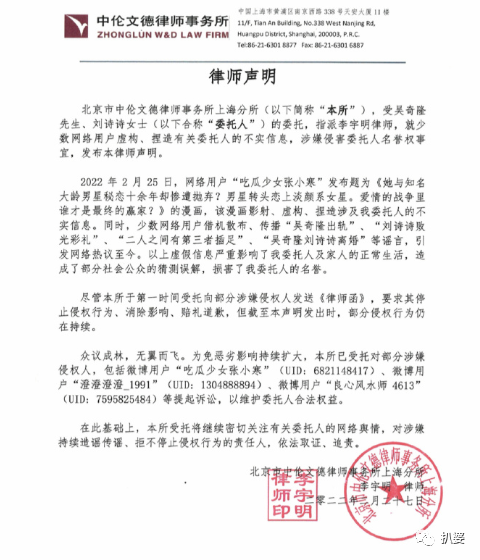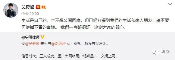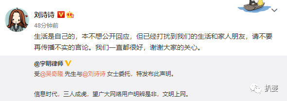刘诗诗和吴奇隆这对夫妻,终于有了新动静,让围绕他俩产生的各种纷扰剧情有了突破发展。 非常难过。 身处婚变旋涡中的他俩,被拍到一家三口同框出街了。 在狗仔拍摄到的画面里,刘诗诗和吴奇隆带着儿子去了某饭店用餐,是不是和友人聚餐欠好说,不外感觉有点像是见朋侪。 由于用餐完毕出门,刘诗诗抱着儿子和吴奇隆一起走了出来。 两人一起走到自家车前,刘诗诗带儿子先上了车,吴奇隆则反复后看,并指了指什么,过了一会才也上车,一家人脱离。 从之前夫妻俩一系列维权使用,以及10月被拍的最新内容看。 我们至少保底能得出如下信息 ↓ 不管吴奇隆刘诗诗的婚姻感情能不能一生一世,至少此时现在,他俩关系还处于存续中,而且不停以刁悍态度回手那些关于他俩“婚变”的说法。 这种使用,和很多仳离前已经连业务都委曲不起来的明星夫妻状态是完全差别的(好比刘诗诗世纪和好的前闺蜜,好比和好前闺蜜的另一同姓闺蜜)。 为什么这么说。 对比给你们看一下就知道了。 吴奇隆刘诗诗,也算是不停走在辟谣打脸保卫婚姻的路上了。 关于刘诗诗和吴奇隆的婚变听说,各人也听非常久了,频率还特高,险些隔三差五就能看到这种说法蹦出来,每回都能引发一阵子热议。 客岁开始有人发预告说他俩要离,空口推测居然博得大片认同。 本年更锋利。 2月份,有人发帖称刘诗诗吴奇隆离了,已经在走法律步调办手续了。 还煞有介事的说3月份两人就会官宣仳离消息。 同一时间,某狗仔以匿名爆料的方式出了一辑漫画,以不点名道姓但全部线索都指向他俩的方式爆了个料。 还暗示男明星扬弃十年女友恋上酷似旧爱的新欢然后完婚。 末了还发出这种天问 ↓ 笔墨不紧张,紧张的是漫绘图片。 居然和刘诗诗吴奇隆当初完婚照险些千篇划一,从造型得手势。 不外面临这种爆料。 吴奇隆刘诗诗没沉默沉静不回应,而是公开联名否了。 使用是一步一步打脸渴望他俩仳离的某些粉丝。 有粉丝说吴奇隆和其经纪人任玥有关系,还穿情侣同款,厥后被逐一击破实在并非同款。 接着吴奇隆出来否认。 出具了状师函。 又被挑刺说从前都是夫妻俩一起回应,这回片面回应肯定阐明失事了。 最搞笑的是,已经有女方粉丝非常自负的给消息说,女方粉充公到团队消息,阐明婚变听说这事儿女方根本不想理,要是想管,肯定要联动粉丝探究的。 提前庆贺都有。 不少粉丝放话说,坐等她仳离,立马帮她撕。 结果呢? 氛围都到这了。 唯独偶像本人不共同。 高兴不外三秒,刘诗诗联名吴奇隆辟谣婚变了。 两人转发该声明并写了千篇划一的文案。 夸大生存是本身的,别打搅他的生存,别流传不实言论,他们不停都很好。 乃至还一起告了造谣者。 直接让粉丝梦碎现场。 但总有人不屈不挠,去找新线索力证刘诗诗和吴奇隆肯定散了。 刘诗诗出来接戏,说她突然搞古迹证明姐要独美了,毕竟上刘诗诗自打生完孩子就早复出拍戏了,每年都有新作品产出,频率根本没变过,不能说戏扑了就代表没拍过不是? 刘诗诗和前闺蜜杨幂世纪破冰,重拾旧友爱,又让粉丝们空想她这是向好朋侪取经,走她曾经走过的路。 可以说,万物皆可当成刘诗诗要离的证据一样惹。 不知道这次夫妻俩的新物料能不能让仳离控们临时消停一番? 现在的内娱,明星辟谣不值钱,也没说服力。 固然造成这种情况的出现不能怪群众,结成这种苦果,都是贵圈艺人们扎堆打脸啪啪啪本身作得。 但。 明星不被信托。 不代表围观者可以任意造谣以及恶意唱衰。 像吴奇隆刘诗诗这对,从开始到现在,感情上讲真险些没有一丝值得诟病挑刺的地方。 2010年互助《步步惊心》因戏结缘。 三年后熬过演员“因脚色入戏太深”的检验,在现实里恋情发展顺遂才正式公布恋情。 然后又是两年。 2015年才领证完婚。 从认识爱情到完婚一共花了5年时间,非常水到渠成。 16年两人补办了浪漫婚礼。 19年有个爱情结晶,可爱的儿子步步。 停止现在,12年感情,7年婚姻,孩子3岁。 节奏把握没题目。 爱情完婚生娃过日子,都是正常模式举行。 将来感情会不会有厘革,那都是天然发展的事儿。 强行提前推测乃至炮制各种谎言就没意思了。 退一万步说,即便有朝一日人家夫妻俩走不下去了,也不代表昔日的恶意造谣就是精确推理。 刘诗诗和吴奇隆会不会顶着粉丝的反对声风雨同舟一辈子我不关心,也不归我管。 但有个感受很显着。 现在有些人似乎变得越来越希奇了。 昨天的粉丝以为张智霖欠好,认定对方风流不恭敬老婆,不忿本身偶像下嫁咖位低的另一半,还盼望袁咏仪能站在粉丝一边,和老公仳离,51岁重新振作搞古迹拍影戏,当独美的大女主姐姐。 刘诗诗这边呢? 实在也碰到差不多同样的题目。 天下上那么多年事相差十岁二十岁的爱情,在别人那叫辩论年事停滞,要是姐弟恋就是姐姐好飒。 到刘诗诗身上,就是脑筋进水了,被PUA了。 黄奕吐槽大会讽刺秦昊娶伊能静是“上错花轿嫁对娘”,拿伊能静年事大开涮,被责怪丝绝不懂恭敬别人。 可到了刘诗诗这里,吴奇隆年事大她17岁,就成了谁都可以驳倒的罪行。 讽刺吴奇隆这个身材体力保持的比一众年轻人还好的资深艺人再过几年就老练坐轮椅了。 说刘诗诗要赡养5个老人。 怎么说呢? 她们在笑什么我不知道。 但她们这么个笑法,倒是挺可笑的。 不懂恭敬偶像的私家感情,强行给人当妈要棒打鸳鸯,搞年事藐视。