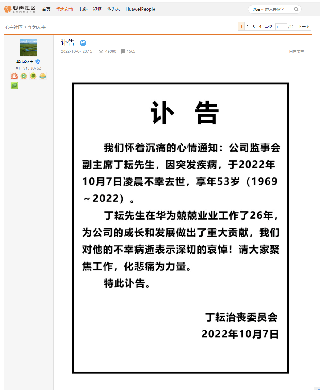 10月7日消息,华为公司监事会副主席丁耘因突发疾病去世。 华为方面发讣告体现,“我们怀着沉痛的心情关照,丁耘因突发疾病,于 2022 年 10 月 7 日破晓不幸去世,享年 53 岁(1969 ~2022)。” 丁耘出生于 1969 年,结业于东南大学,硕士。1996年参加华为,历任公司产物线总裁、环球办理方案贩卖部总裁、环球 Marketing 总裁、产物与办理方案总裁等。现任公司监事会副主席、企业 BG 总裁、运营商 BG 总裁。 认识华为发展史的都知道,没有C&C08万门程控互换机的研发乐成,就没有华为的本日,而丁耘在C&C08的研发中起到了告急作用。 这个是真大佬,级别很高很高很高。 已往30多年,华为的研发投入到达6000亿元以上,华为从建立之日起就恒久对峙将贩卖额的10%以上投入研发,曾经恒久主管研发的常务董事丁耘就说过:“低于10%我是要被砍头的”。 作为任正非的左膀右臂,掌管运营商BG的最焦点业务。在华为高管合照中,站在首创人任正非的右侧。 本年年初,华为在内网发布高层人变乱动,任命常务董事丁耘为企业BG总裁,同时仍兼任运营商BG总裁。从构造架构来看,华为现在分为运营商、企业、斲丧者三大板块。华为三大BG,丁耘掌管其二。 据悉,丁耘是在跑了28公里之后,由于心脏标题就没有再醒过来。 现在在华为的讣告信息下,已有7000余条留言信息表达了对丁耘的哀悼。现在华为官网信息上的丁耘个人信息页面、华为心声社区首页已经酿成好坏色。 |