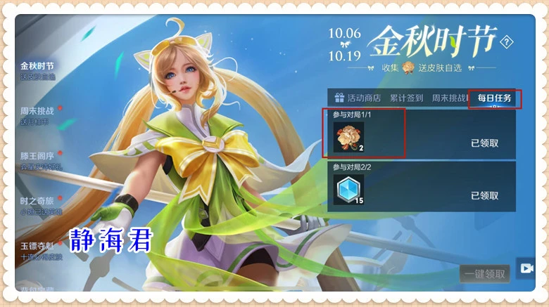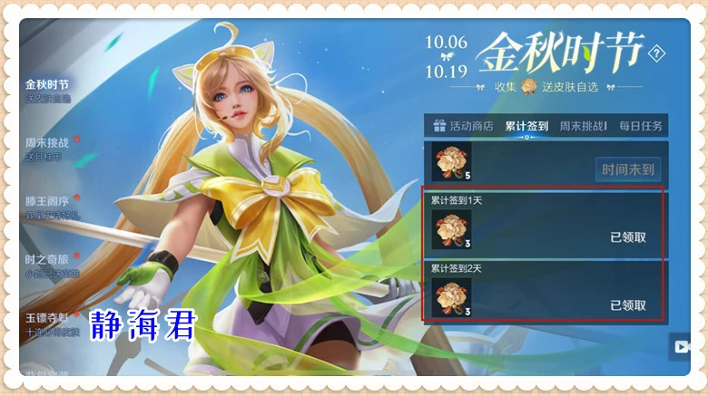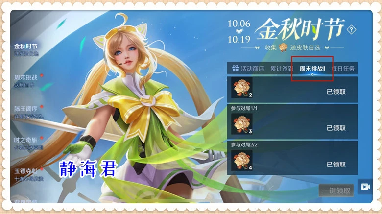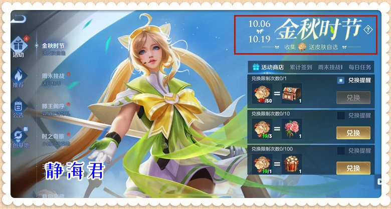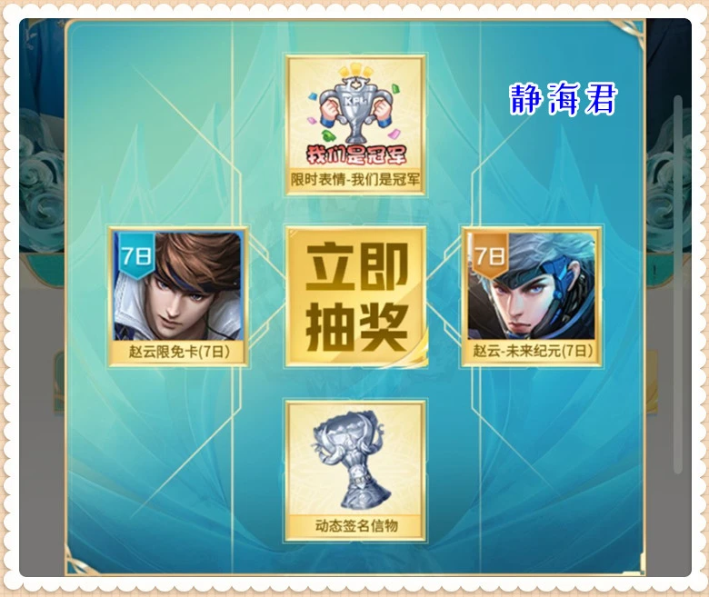 文/静海君 在国庆假期期间,天美是策划放假活动照常开启。这不,我这里就有两个性价比很高的活动要先容给各人,这两个活动一个是必得游戏里的永世皮肤,一个则是有概率得到冠部队伍的动态署名,具体什么情况呢,请往下看。 第一个活动:完成任务,5个皮肤恣意选第一个活动的名字叫做「金秋时节」。 ⑴金秋时节的根本规则 金秋时节这个活动实在是从10月6号正式开始的,一共连续14天(到19号竣事),到场这个活动的玩家一共可以得到3个夸奖,分别是: 50个道具可以换得永世皮肤5选1宝箱(这个5个皮肤分别是:苏烈的坚固之力、大乔的保卫之力、姜子牙的炽热元素使、孙膑的归虚梦演、刘备的纽约教父)。 3个道具可以换的密切玫瑰。 1个道具可以换的铭文小礼包。 本来密切玫瑰的作用确实一样寻常,但是在有了情侣榜后,不要钱的密切玫瑰肯定是越多越好的。固然了,通例玩家最想要的夸奖肯定照旧永世皮肤(上面这5个皮肤我还缺4个)。 ⑵得到道具的途径 可以得到道具的途径一共有三个,分别是:累计签到、逐日任务和周末调解。 累计签到的任务永久是最好完成的:累计签到1/2/3天,就可以得到3+3+3的寄希花;累计签到4/5天,可以得到4+4的寄希花;累计签到6天,可以得到5的寄希花。 只要累计签到满6天,就可以得到22朵寄希花(也就是兑换道具)。 在活动连续的14天内,玩家每天到场一场对局就可以得到2朵寄希花,到场两场对局可以得到15个铭文碎片。这里须要留意的是,有用的对局只限于排位、5v5匹配、全民电竞等模式。 对了,完玉成部的逐日任务后,玩家最多可以得到28朵寄希花。 末了一个得到寄希花的途径是两次周末挑衅: 周末挑衅的时间:10月7号-10月9号和10月14号-10月16号。 周末挑衅的内容:登岸游戏得到2朵寄希花,累计到场一场对局得到2朵寄希花,累计到场两场对局得到4朵寄希花,累计到场三场对局得到5朵寄希花。 完成两期周末挑衅后,一共可以得到28朵寄希花。 ⑶小结 如果三个途径的任务全部可以完成的话,我们一共可以得到78朵寄希花。兑换皮肤须要50个,还剩28朵可以兑换9朵玫瑰花以及1份铭文碎片。 各人万万不要低估玫瑰花的代价,不信自己去商城看看如果买一朵玫瑰花须要多少钱。 第二个活动:发弹幕,为冠军战队打call这次的第二个活动有肯定的概率可以得到冠军署名,这对于追星的小同伴来说是个非常好的消息。 ⑴活动的具体细节 发弹幕,为冠军战队打call这个活动的夸奖实在许多,包罗: 冠军专属头像框、限时心情(我们是冠军)、7天的限免豪杰和皮肤以及最有数的动态署名信物。 ⑵具体的操纵流程 这个活动的具体流程实在很简朴: 起首,在活动页面发送弹幕(可以选择),在发送弹幕后,就可以领取头像框的兑换道具。 别的,在发完弹幕后,玩家还可以通太过享界面来得到一次抽奖机遇,通过这个抽奖机遇玩家就有肯定的概率得到动态署名。 作为一个负责任的王者光彩玩家,我在这里有须要和说下这里的概率题目:两个赵云的7天限免(皮肤和豪杰)以及限时心情的中奖概率都是33.33%,真正有代价的动态冠军署名的中奖概率是0.01%,也就是常说的万分之一。 固然了,话说转头,这个活动本来就是免费的,人家能给这个机遇让你抽奖好像已经“仁至义尽”了? 末了,周年庆活动即将开始,各人对于这一次的周年庆有什么期盼的话不妨在批评区说一下,万一策划就看到了呢? 以上,我是静海君,江湖不大,有缘下次再见哦。 |