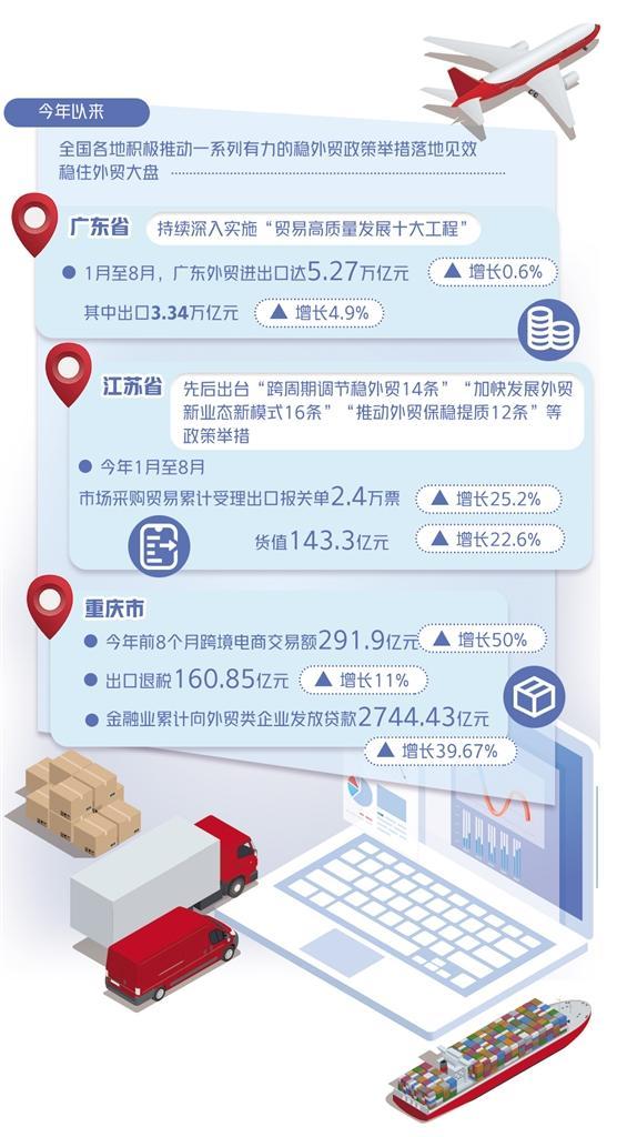 外贸是拉动经济增长的“三驾马车”之一,在稳就业稳增长中发挥着紧张作用。克日,商务部印发《支持外贸稳固发展多少政策步伐》。各地各部门稳外贸有何办法?怎样提振外贸市场主体信心?本报克日起推出“加力稳外贸”系列报道。 克日,商务部印发《支持外贸稳固发展多少政策步伐》,从加强外贸履约本领、进一步开发国际市场、强化保障本领、促进贸易流畅等方面举行摆设,加力稳外贸。实际上,本年以来,各地各部门出台了不少办法,资助外贸企业保订单拓市场。各地办法有何创新之处,政策落实怎样,效果怎样?记者举行了采访。 系列政策全面发力 本年以来,天下第一外贸大省广东在疫情打击、外洋需求不振等影响下顶住压力,一系列有力的稳外贸政策办法落地收效,稳住了外贸大盘。1月至8月,广东外贸收支口达5.27万亿元,增长0.6%,此中出口3.34万亿元,增长4.9%。 广东外贸发展韧性凸显,离不开从客岁至今一连深入实行的包罗数字贸易工程、“粤贸环球”品牌工程、通关便利化改革工程、贸易新业态工程等在内的“贸易高质量发展十大工程”,在流畅贸易通道、发掘外贸增长潜力等方面推出了大量实招硬招。比如,提出每年面向外洋和国内各举行百场以上“粤贸环球”和“粤贸天下”线上线下经贸活动,分别动员1万家以上企业加入,助力企业开发国内国际市场等。 “我们将踏实推动贸易高质量发展‘十大工程’全面突破,推动广东成为环球要素集聚程度高、资源设置效应强、具有环球贸易引领力的国际贸易中心。”广东省商务厅厅长张劲松表现。 生产车间呆板轰鸣,10多条生产线开足马力,工人们加班赶制一批销往外洋的汽油发动机产物订单。这是记者克日在位于重庆北碚区的神驰机电股份有限公司采访时看到的一幕。“本年以来,公司在当局一系列政策支持下,积极开发外洋市场,上半年实现国际市场收入9.15亿元,增长25.02%。”神驰机电副总裁黄勇说。 重庆市商务委党构成员、副主任许新成告诉记者,重庆市组建了稳外贸工作专班,分级分类创建100家重点外贸企业接洽走访制度、400家重点外贸企业跟踪服务机制,并按照“一企一策、一题目一方案”原则,加大对汽车等重点范畴外贸企业用工、用电、用气和物流运输保障的调和调理,有力提振了企业信心。 江苏省商务厅副厅长周晓阳表现,江苏已先后出台“跨周期调治稳外贸14条”“加快发展外贸新业态新模式16条”“推动外贸保稳提质12条”等政策办法,积极稳住外贸根本盘。下一步,江苏商务部门还将会同相干部门引导企业运用优惠政策,高质量实行RCEP等自贸协定,扩大与成员国贸易往来,举行多场线上对接会,构造到场50场境外国际展会项目,支持企业以“代参展”等多种方式获取更多订单。 新模式不绝拓展 科伦多食品配料有限公司是一家年产量超26万吨的食品添加剂收支口企业,每年有近15%的订单来自于外洋展会。前几天,印尼雅加达国际食品配料展览会开幕,受新冠肺炎疫情影响,企业无法到现场参会,贸易洽商遇阻。合法企业束手无策时,连云港商务部门送来政策“实时雨”。 公司外贸部司理董浩天告诉记者,商务部门通过“代参展”方式,将80多种产物提前寄到国外,实现企业“线下产物展示+线上实时洽商”加入境外展会,仅参展三天时间,公司就欢迎了40多个客户,促成意向订单50万美元。 “因疫情无法赴境外参展的企业,我们推出‘代参展’政策,还给予展位费50%的支持;在出口光荣保险方面,当局部门提供600万元支持资金。”江苏连云港市商务局外贸处李雷说,本年以来,市商务部门会同海关、银保监、中信保等相干部门及金融机构,加大了对企业开发国际市场、出口光荣保险及信贷方面的支持力度,已累计发放光荣贷款超亿元。 跨境电商等新业态也成为稳外贸的紧张气力。本年,重庆乐成举行了跨境电商生意业务会,积极推动跨境电商“保税入口+零售分装”业务试点,推广“跨境电商+产业带”模式,为外贸企业稳订单、拓市场提供了新的办理方案。本年前8个月,重庆跨境电商生意业务额达291.9亿元,增长50%。 “在环球疫情常态化配景下,跨境电商作为新的贸易情势,突破了时空限定,流畅了企业进入国际市场的渠道,低沉了生意业务资本,提拔了生意业务服从,为外贸增长注入新动能。”重庆社科院产业经济研究所所长吴安说。 9月11日,在拿到海关申报放行单后,江苏苏州常熟市莫城街道商户金香兰悬着的心终于放了下来。“已往把货交给外贸公司署理从上海口岸订船出口。由于港口拥堵,船期时常延误。如今海关推出新政策,以市场采购贸易一体化申报的方式向南京海关所属常熟海关申报放行,隔天就能走货,特殊方便。”金香兰说。 “本年1月至8月,江苏省市场采购贸易累计受理出口报关单2.4万票、货值143.3亿元,同比分别增长25.2%、22.6%。”南京海关相干负责人先容,南京海关创新“分段式作业+不见面查验”模式,主动对接天下口岸海关,买通“转关+一体化”出口通关双通道,支持符合条件的省内专业化市场、中小微企业和个体工商户通过市场采购平台扬帆出海。 优惠政策稳固信心 9月8日,致伸科技重庆有限公司提交了出口退税申请,第二天就收到了1400万元的出口退税款,极大缓解了企业资金压力。“退的是税款,增的是信心和底气。”致伸科技财政职员何平说,重庆税务部门组