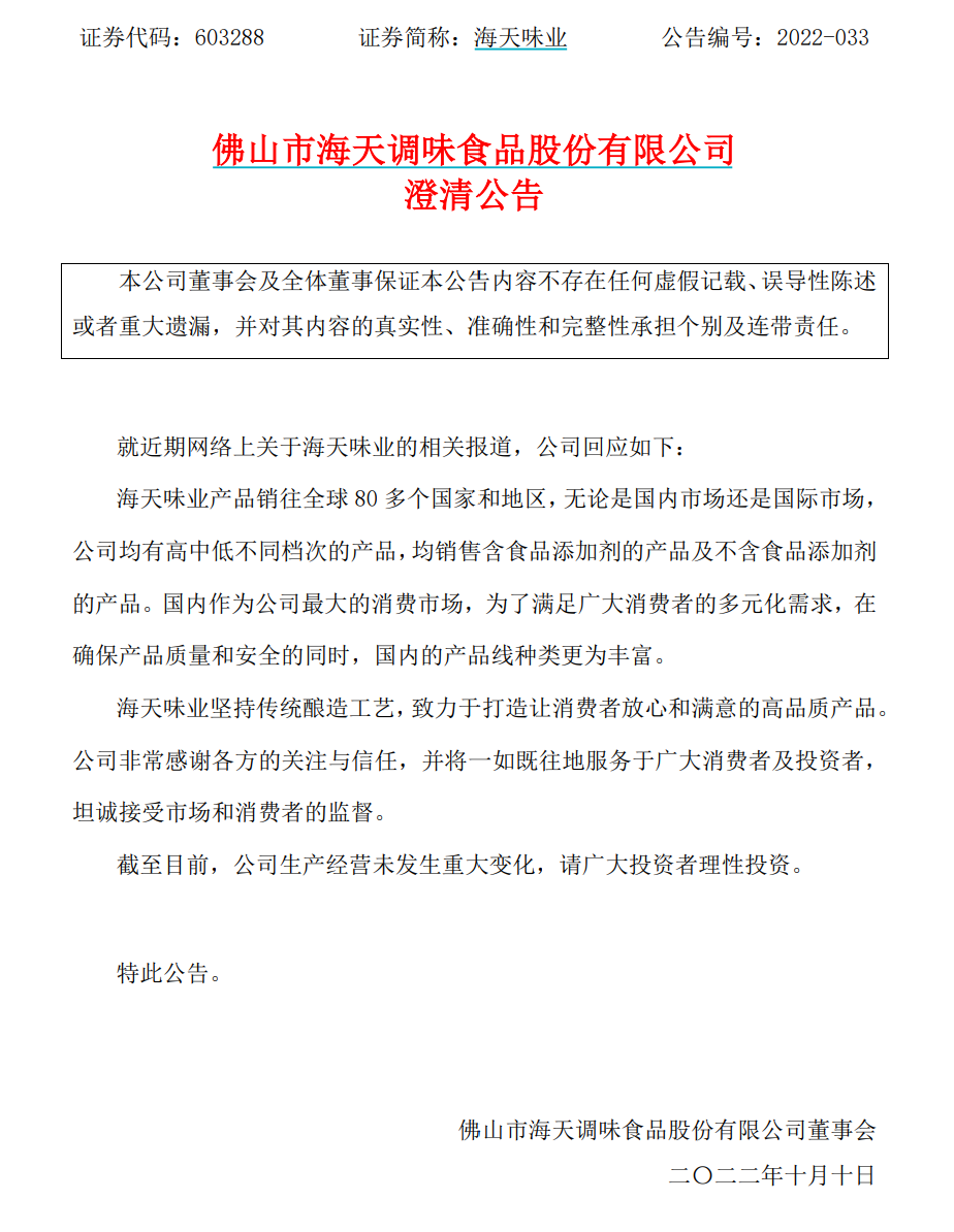 海天味业发布公告,澄清酱油添加剂“双标”质疑。 10月9日晚间,佛山市海天调味食品股份有限公司(海天味业,603288.SH)发布《澄清公告》,回应近期网络上关于海天味业的干系报道称,无论是国内市场照旧国际市场,公司均有高中低差别档次的产物,均贩卖含食品添加剂的产物及不含食品添加剂的产物。 该澄清公告指出,海天味业产物销往举世80多个国家和地区,国内作为公司最大的消耗市场,为了满足广大消耗者的多元化需求,在确保产物质量和安全的同时,国内的产物线种类更为丰富。 公告表现,海天味业对峙传统酿造工艺,致力于打造让消耗者放心和满足的高品格产物。公司非常感谢各方的关注与信托,并将一如既往地服务于广大消耗者及投资者,坦诚继承市场和消耗者的监督。克制现在,公司生产筹谋未发生巨大厘革,请广大投资者理性投资。 海天味业澄清公告 这已经是海天味业第三次了局回应酱油添加剂变乱。 此前,有网友在外交平台上晒出国外多地售卖的海天酱油配料表上只有水、大豆、小麦等自然质料,没有添加剂,而国内贩卖的海天酱油的配料表体现加了较多添加剂,包罗增味剂、防腐剂和甜味剂。由此出现海天酱油国表里产物“双标”的争议,将这家酱油龙头上市公司推向风口浪尖。 9月30日晚间,海天味业官方微博发布《严正声明》,称其全部产物都严格按照《食品安全法》生产,而且随时继承国家及各级食品安全主管部分的常态化监督和查抄。别的,全部产物中食品添加剂的利用及其标识均符合我国干系标准法规要求。 该声明称,部分短视频账号借“海克斯科技”“科技与狠活”(教唆用食品添加剂制作的食品)话题,利用大众对于食品安全的关注制造焦急和恐慌,在网络上制造而且散播谎话,以致将“酱油致癌”“吃酱油掉头发”“坑害国人”等标签扣在海天产物身上,严肃陵犯公司品牌形象,其言行已构成对公司光荣权的严肃陵犯。海天味业表现,已委派专业状师团队观察取证,必将恶意造谣者、流传者的法律责任追查到底。 10月4日晚,海天味业官方微博发布声明《中国品牌企业的责任、继承与号令》,回应近期愈演愈烈的国表里产物“双标”争议称,食品添加剂广泛应用于天下各国的食品制造中,各国对食品添加剂均有明确的法规标准,这些标准本身并没有高低优劣之分。“简单以为国外产物的食品添加剂少,大概以为有添加剂的产物欠好,都是误解”,“海天产物的内控标准要求,大多都高于以致远高于国家标准,同一品格的产物,国内国际的内控标准都同等。” 10月5日破晓,中国调味品协会在官方微信公众号上发布《关于净化市场情况,引导调味品企业高质量发展的声明》。该声明指出,因各国的饮食和消耗风俗差别,同一类产物的标准要求会有所差别,但标准本身不存在高低之分。 |