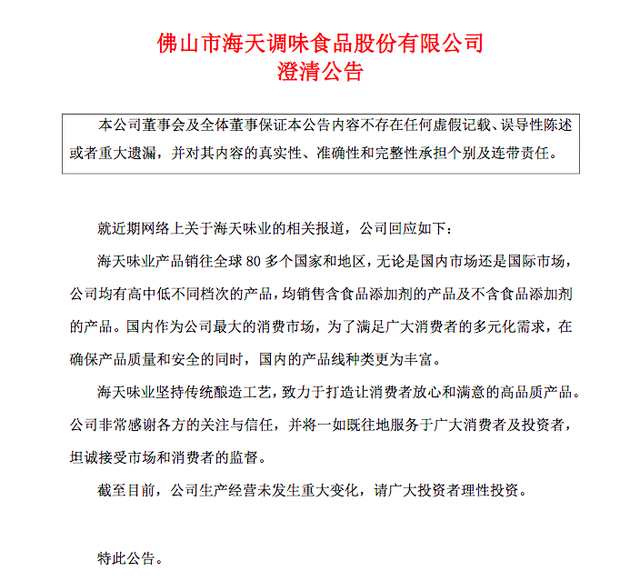 出品:子弹财观 10月9日消息,海天味业酱油添加剂的争议还在继续吸引人们的讨论。本日下战书海天味业通过上市公司公告的情势再次对这个争议话题举行了回应。 海天味业在公告中写道: 海天味业产物销往环球 80 多个国家和地域,无论是国内市场照旧国际市场,公司均有高中低差异档次的产物,均贩卖含食品添加剂的产物及不含食品添加剂的产物。国内作为公司最大的斲丧市场,为了满足广大斲丧者的多元化需求,在确保产风致量和安全的同时,国内的产物线种类更为丰富。 这是海天味业在近来10天里,第三次作出回应了。而且从说话来看,是态度最和缓的一次回应。海天味业发布这个公告的时间点也是在股市规复的前一天,此举应该也有利于投资者作出更精确的投资判定,但10月10日海天味业的股价可否出现大幅颠簸,依然很难预料。 本年9月30日,海天味业曾经在官微发布一条“严正声明”,其时他们并没有直接回应国内国外酱油为何差异的争议点,而是夸大了海天酱油在国内符合国家标准,并让斲丧者放心购买,同时还态度倔强的体现要追究相干自媒体的法律责任。 10月4日,海天味业的官微再次发布一条消息,题为《中国品牌企业的责任、继续与下令》,他们体现食品添加剂广泛应用于天下各国的食品制造中,各国对于食品添加剂的标准并没有高低之分、优劣之别。以此来夸大中国食品不比外国食品差。同时海天味业还体现各国对于食品法规的标准差异,可以说是一国一标,以此来反驳“双标”的质疑。 在这3次回应中,海天味业都亮相他们在国内也有卖不含食品添加剂的产物,不外至少从前两次回应的效果来看,有部分网友以为海天味业的危急公关并没有做好,大概说尚有做的更好的提拔空间。 有网友对这件事品评称“得亏是国庆放假期间的事,要是在正常生意业务期间,不知道他们的股价会有怎样的颠簸”。别的,海天酱油添加剂争议事故对于海天味业的业绩影响会有多大也有待进一步观察。 本年9月26日,海天味业在中期业绩发布之后,举行了一次投资者关系活动,其时有调研机构问到海天味业整年营收利润双12的增长目的是否还能实现的标题,其时海天味业首创人庞康也做出了回应,他说: 从整年的目的来看,现在确实面对非常大的压力。但对于目的,海天一直黑白常严肃的,下半年尚有几个月的时间,不会轻易放弃和放松目的,不会对目的举行调解,公司也在通过各种步伐提振员工和经销商信心,生存量,抢增量。醋和料酒比年取得不错的增长,未来公司也会连续强化品类竞争力,加速发展。 本年上半年,海天味业的营收为135.3亿元,同比增长9.73%,净利润33.93亿元,同比增长1.21%。从这个数据来看,海天味业简直还须要在下半年更加积极才有大概实现年度目的。 |
