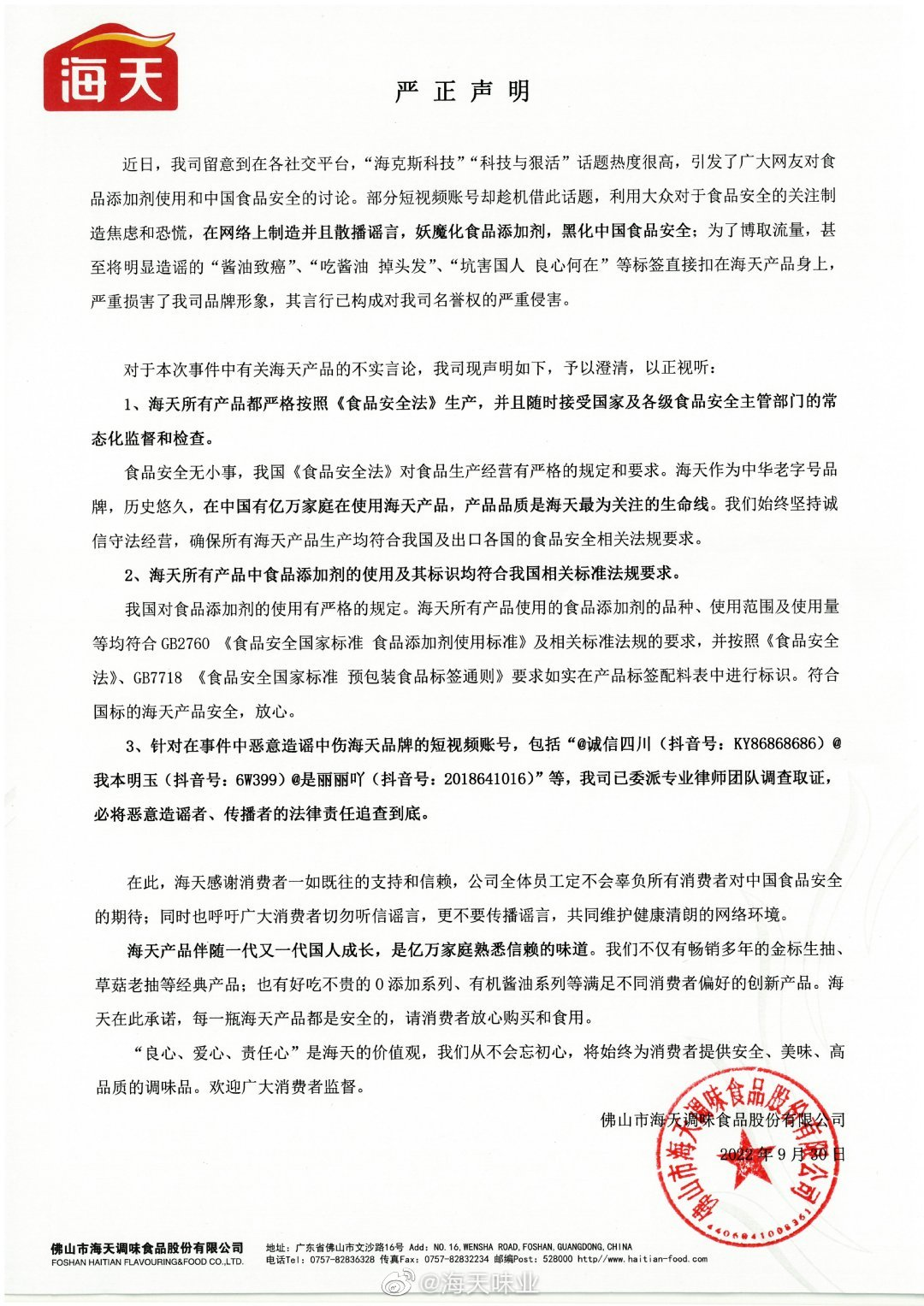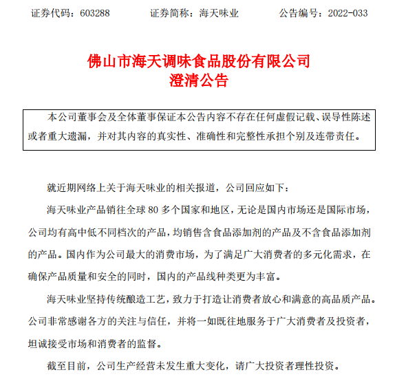 “酱油茅”第三次回应添加剂“双标”变乱! 10月9日晚间,海天味业在上交所发布澄清公告,再度回应食品添加剂“双标”质疑称,无论是国内市场还是国际市场,公司均有高中低差异档次的产物,均贩卖含食品添加剂的产物及不含食品添加剂的产物。 那么,颠末3次澄清后,海天味业的股价可否抗住呢? 海天味业再发澄清 长假期间,3800多亿市值的海天味业陷入添加剂“双标”风波。多个短视频账号爆料称,海天味业国外售卖的海天酱油配料表上没有添加剂,只有水、大豆、小麦、食盐等天然质料,而在中国售卖的除了天然质料之外尚有较多添加剂。 10月9日晚间,海天味业在上交所发布《澄清公告》,再度回应食品添加剂“双标”质疑。海天味业表现,公司产物销往环球80多个国家和地区,无论是国内市场还是国际市场,公司均有高中低差异档次的产物,均贩卖含食品添加剂的产物及不含食品添加剂的产物。国内作为公司最大的斲丧市场,为了满意广大斲丧者的多元化需求,在确保产物质量和安全的同时,国内的产物线种类更为丰富。 海天味业称,公司对峙传统酿造工艺,致力于打造让斲丧者放心和满意的高品格产物。公司非常感谢各方的关注与信托,并将一如既往地服务于广大斲丧者及投资者,坦诚继承市场和斲丧者的监视。 停止现在,公司生产策划未发生庞大厘革,请广大投资者理性投资。 此前曾两度公开回应 在此次公告发布之前,海天味业曾两次公开回应网络上的质疑。 第一次回应是在9月30日晚间,海天味业当时通过官方微博发布《严正声明》称,克日公司留意到在各外交平台,“海克斯科技”“科技与狠活”等话题热度很高,引发了广大网友对食品添加剂利用和中国食品安全的讨论,部门短视频账号利用大众对于食品安全的关注制造焦虑和恐慌,在网络上制造而且散播谎话,严肃侵害了公司品牌形象,其言行已构成对公司光荣权的严肃陵犯。 海天味业表现,公司全部产物都严酷按照《食品安全法》生产,海天全部产物中食品添加剂的利用及其标识均符合我国相干标准法规要求。针对在变乱中悉意造谣诽谤海天品牌的短视频账号,公司已委派专业状师团队观察取证,必将恶意造谣者、流传者的法律责任追查到底。 不外,在上述回应发布之后,海天味业的舆论热度仍旧不减。10月4日深夜,海天味业通过官方微博再次发文回应酱油添加剂争议。海天味业称,用食品添加剂来误导斲丧者以为中国食品比外国食品差,要么是不明原形,要么是别有效心。海天产物的内控标准要求,大多都高于乃至远高于国家标准,同一品格的产物,国内国际的内控标准都划一。因此,用所谓“双标”来挑起斲丧者和中国品牌企业的抵牾对立,不但打击了中国老百姓的斲丧信心,更会严肃影响“中国造”的天下荣誉。 10月5日破晓,中国调味品协会在官方网站发布《关于净化市场环境,引导调味品企业高质量发展的声明》。在声明中,中国调味品协会表现,国庆节期间,一则关于海天酱油等产物国表里“双标”的传言在网上疯传,对节日餐饮业和调味品市场造成严肃影响。此次变乱的发生,对中国调味品的生产和市场造成了不良影响,我们对此深表遗憾,并支持因舆情受到影响的调味品企业依法维权,追究网络造谣者的法律责任。 中国调味品协会称,食品生产企业在我国境内的生产策划应符合我国的法律法规及相应标准的规定,出口产物应符合出口国的法律法规及相应标准的规定或依照双方认同签订的收支口商业条约的技能条款。因各国的饮食和斲丧风俗差异,同一类产物的标准要求会有所差异。但是,标准本身并不存在高低之分。 我国食品添加剂的管理实行严酷的审批管理制度,食品添加剂的利用范围和限量要责备部颠末权势巨子机构的食品安全风险评估并被证实是安全可靠的。食品生产企业只要严酷按照GB2760《食品安天下家标准 食品添加剂利用标准》的规定规范利用食品添加剂,其生产的产物就是安全的。 周一股价咋走 海天味业是中国调味操行业的龙头老大,此中海天酱油产销量一连二十五年名列行业第一。根据公开资料,海天味业生产的产物涵盖酱油、蚝油、酱、醋、料酒、调味汁、鸡精、鸡粉、腐乳、暖锅底料等十几大系列百余品种500多规格,年产值高出两百亿元。 在二级市场上,海天味业是一只大牛股,上市以来股价累计涨幅一度靠近20倍,市值最高时靠近7000亿元。不外,自2021年1月中旬以来,公司股价启动漫长的调解,其间累计下跌44%,市值缩水近3100亿元。公司最新股价报82.82元/股,市值为3838亿元。 2020年以来,海天味业的营收及净利增速有所放缓。此中,2021年整年,海天味业营收为250.04亿元,同比增长9.71%;归属于上市公司股东的净利润为66.71亿元,同比增长4.18%。这也是自2011年以来,海天味业初次业绩增速为个位数。 2022年半年报表现,上半年海天味业实现业务收入135.32亿元、同比增长9.73%;归母净利润为33.93亿元、同比增长1.21%。此中,第一季度单季营收为72.1亿元,同比增长0.72%,归母净利润为18.29亿元、同比降落6.36%。第二季度单季,公司实现业务收入63.22亿元,同比增长22.19%,归母净利润15.64亿元,同比增长11.79%。可见,该公司的业绩在第二季度加快了。不外,公司整年仍旧面临较大的本钱压力。 当前,市场最关心的是,在颠末3次澄清后,海天味业的股价在周一会怎么走? 责编:战术恒 校对:杨