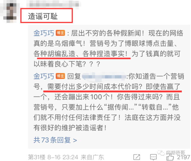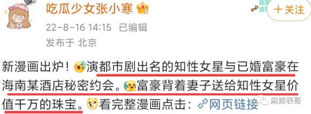 娱乐圈的瓜总是任意就能串起一串。 迩来,狗仔张小寒依附几张漫画,掀起了一波关于博纳老总于冬和女明星们的追念。 张小寒画了一组漫画。 说演都市剧着名的知性女星与已婚富豪在海南某旅馆机密约会。富豪背着老婆送给知性女星代价万万的珠宝。 完备漫画 我就不赘述了,各人可以当个小故事看一遍。 由于漫画中给出的元素挺显着,一线知性女星,因都市剧而走红,另有隐形条件:未婚。 第一个被卷入此中的就是江疏影。 (没有说漫画是真的,单就关键词来看,大多数人第一个想到的是她) 屡见不鲜,江疏影前阵子去了海边嬉戏,也让这个漫画开始发酵。 由于照片中的一些小细节,和漫画中的一些元素对应上了。 同款落地窗。 差不多的花。 江疏影也切三文鱼 而在六月份晒过嬉戏照片后,7月份江疏影晒了一些自拍,内里就有金饰。 这 (好像发型也差不多) 不外江疏影的项链没那么贵,是一个筹划师筹划的小众原创品牌,一千多块。贵的是手上的卡地亚手镯32万,手表4万,但也没达万万级别。可从逻辑上说,谁平常没事会把万万珠宝一次性戴身上。 随着江疏影一同被拉进猜猜猜游戏的是金巧巧和博纳总裁于冬夫妇。 漫画中,富豪的老婆是赤色短发,而金巧巧给人的印象也是赤色短发。 前阵子,有网友偶遇金巧巧一家嬉戏。 对照起江疏影眼镜里的倒影 人物的外貌,有几分相似。 但这就有个胡扯了,于冬的这张图和江疏影,是两个空间的。 而且有粉丝调解了图片亮度,是一个戴口罩的照相师。 要说江疏影和博纳有什么交集,我找了一下。 在2014年和2016年,江疏影出演了博纳出品的两部影戏。 可那会,江疏影正和胡歌谈着短暂的爱情。 因此,这个瓜倒不是特殊好吃。 你说它有点什么吧,好像能对上,但要说真不真,又似是而非没滋没味,就像张小寒给你挠了个痒痒说:你来呀,你猜啊。剩下的却端赖吃瓜群众脑补。 张小寒,你能不能拍点着实的? 这边江疏影没有回应,金巧巧出来了。 直接说谎话止于智者,有空多看影戏。批评区也跟网友们认真表明。 江疏影和博纳老总的瓜怎么样不好说,但金巧巧的“谎话止于智者”好像不大好用。 这年初,娱乐圈里的艺人们头一天发状师函,第二天就能被本身打脸,类似的例子层出不穷,“谎话止于智者”已经不适实用在娱乐圈了。 况且,有些人的信托值真没那么高。 71年出生的于冬,是博纳老总,公司投资拍摄过《智取威虎山》《龙门飞甲》《窃听风云》系列,《一代宗师》《桃姐》《扫毒》等,是影戏界真正的大佬。 他的第一任老婆不是金巧巧。 是臧黎璐。 百科上写,1997年两人相识,1999年开始爱情。臧黎璐家景好过于冬,刚完婚时,臧黎璐与于冬住在向阳管庄的一间60平方米的房子里,房子是臧黎璐贷款买的,婚后共同还款,月供3000元。 厥后两人开始创业,一点一点从白手发迹到成为公司老总腰缠万万,臧黎璐也生了一儿一女。 但好日子到临后,臧黎璐仳离了。 仳离后,臧黎璐对外诉诸本身的生存并不幸福。 从2003年开始就有女演员给家里打骚扰电话,厥后于冬就逐步夜不归宿,不爱回家,她怀儿子时,有女人半夜打电话说本身也有身了,是龙凤胎。大有一种逼宫的意思。 而那些年于冬确实和一些女星来往甚密。 比如,范九亿摸腰、摸肚子、牵手、挽手、撒娇,一整套都来一遍。 这些动作,你搁现在来试试看,比胡辣汤要辣眼一百倍。 不外范九亿也just so so。 臧黎璐说本身选择仳离,是由于2010年于冬与一女星牵手亮相香港金像奖,臧黎璐彻底心凉。 谁人女星被网友猜疑是袁立。 那几年,袁立很风光,固然没有大热的作品,但你总能在红毯上看到她的存在。 她大摇大摆出现在于冬身旁,东风满面。 2010年,博纳上市。 上市那一天,袁立和于冬激动拥抱。那一年,正是于冬的婚姻危急时期,但你丝毫看不出一丁点危急的状态。 再说一件比力风趣的小事。 2009年,博纳拍《枪王之王》,中心C位的女主是李冰冰。 听说,这个脚色原来是袁立的,厥后被李冰冰拿下了。 影戏上映时,袁立就去了,开始搞事。 大秀奇迹线 吐舌卖萌 说错影戏名字 第二天,头条都是以袁立为主题,谁还记得李冰冰才是C位女主。 立啊,真的会搞事。 不外太会搞事的人,也轻易让人敬而远之。现在她不演戏了,人也变得神神叨叨。 袁立从于冬身边逐步消散后,“孔雀公主”金巧巧出现了。 对于金巧巧,我只有三个印象。 一,她的时尚大片,一点儿都不时尚。让人仿佛走进了杭州四序青、北京动物园、武汉老鼠街这些服装批发市场。 二,就是她和吴启华谈过爱情。 这段恋情挺风趣,爱情时穿插着吴启华劈叉的故事,分手后金巧巧又请吴启华演男主,演戏期间传出了吴启华买春,厥后宋祖德跑出来说是金巧巧陷害吴启华,金巧巧气得痛骂宋祖德神经病。 比力详细的,可以下戳 又想到一个PC有关的瓜… 第三个,就是金巧巧征婚。 和吴启华分手后,也不知道为什么金巧巧就走上了征婚的门路,一个长得漂亮的女演员找不到对象,长年在征婚。 04年,征婚。 07年,征婚。 2012年12月,上《天天向上》,妈妈还给她征婚。 要求男方最好帅气一点,身高一米七五以上,年岁不凌驾42岁。 钱枫被拉来作配,钱枫说:我不介意。 但钱枫大概想多了,这事和他没一毛钱关系。 由于2013年8月9日,金巧巧和于冬的女儿就出生了。