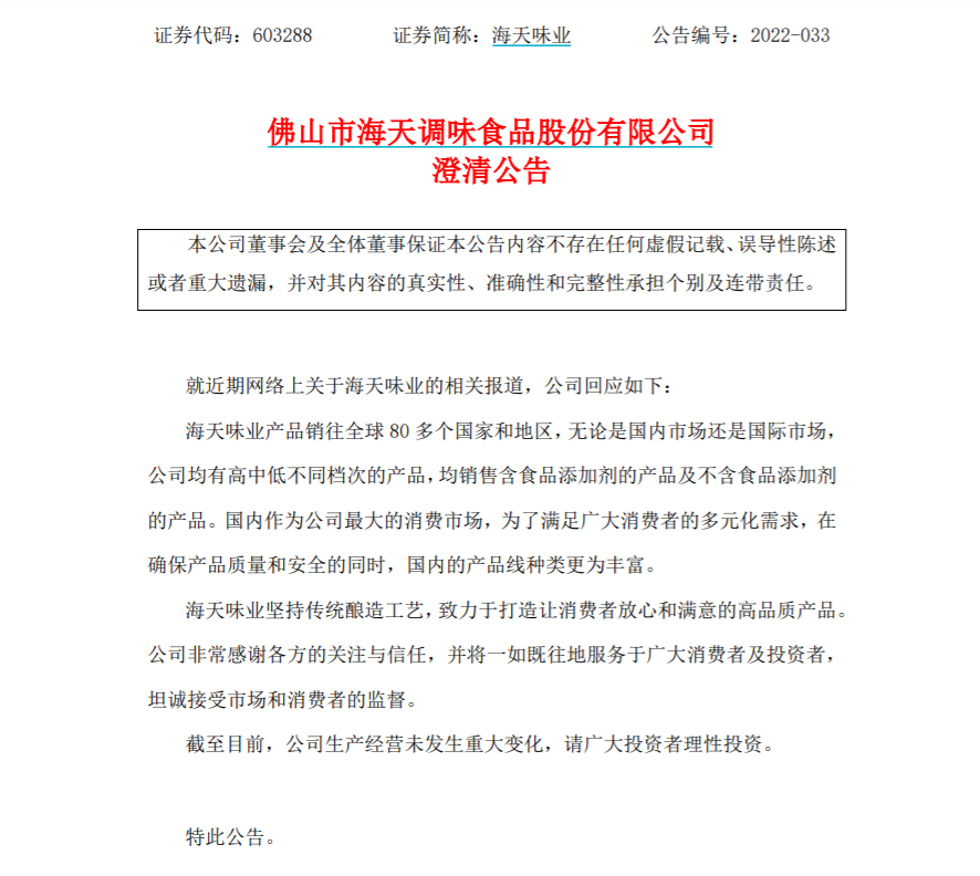 10月9日晚间,海天味业发布澄清公告,再次回应食品添加剂“双标”风波。公告称,海天味业产物销往举世80多个国家和地区,无论是国内市场还是国际市场,公司均有高中低差别档次的产物,均贩卖含食品添加剂的产物及不含食品添加剂的产物。 这已经是海天味业第三次针对食品添加剂“双标”风波举行回应。 海天味业体现:“国内作为公司最大的斲丧市场,为了满足广大斲丧者的多元化需求,在确保产物质量和安全的同时,国内的产物线种类更为丰富。” 此次风波源于,国庆期间网络平台上有消息称,国内售卖的海天酱油含食品添加剂,而国外售卖的海天酱油零添加,因此质疑海天味业在实行“双标”,将号称“酱油茅台”的海天味业这一市值近4000亿元的巨头卷入舆论漩涡。 对此,9月30日,海天味业发布声明,称公司产物所含的食品添加剂符合国家标准以及法规要求。10月5日,海天味业再次发布声明称,海天产物的内控标准大多高于国标,且国表里内控标准同等,并未双标。 此次风波是否将对海天味业的策划构成影响?海天味业体现:“制止现在,公司生产策划未发生巨大厘革,请广大投资者理性投资。” 业内受访人士以为,短期来看,受舆情影响,海天味业酱油产物贩卖或面对压力。从长期来看,该变乱将会对整个行业的质量标准提升和食品科普产生正向提振作用。 关于食品添加剂随着海天味业“双标”变乱连续发酵,有关食品添加剂的讨论再次成热门话题。 据上海证券报,南京农业大学食品科技学院教授黄明在采访时体现:“食品添加剂是食品工业发展到肯定程度产生的结果,是食品工业发展的推动力之一,重要用来改善食品品格和色香味以及防腐保鲜等,此中既有人工合成的物质,也有天然提取物。” 据黄明先容,食品添加剂在美国、日本等国家也广泛存在,但每个国家食品添加剂的使用标准并不同等,重要受膳食布局、饮食风俗等因素影响。“随着康健饮食观念的鼓起,现在欧洲国家盛行有机食品,食品添加剂使用得较少。现在,我国也在提倡在包管产物质量和风味的条件下,少用大概不消食品添加剂。” 10月7日,国君证券体现,国内各大品牌的酱油无论生抽、老抽、味极鲜还是零添加所使用的添加剂均符合国标GB2760-2014;且以海天味极鲜、老抽王产物为例,海天在中国和日本售卖的产物配料根本同等,差异部门系翻译标题及食品添加剂披露要求差别所致。 别的,上证报记者10月9日随机走访了上海两家超市,留意到海天味业酱油产物均有较大范围陈列,对于贩卖环境,两家超市业务员的答复却大相径庭。一家大型商超的售货员告诉记者,受“双标”变乱影响,海天酱油贩卖量大幅下滑。另一家社区超市的售货员告诉记者,海天酱油近期销量确有降落,但并不显着,上货工作仍在正常举行。 |