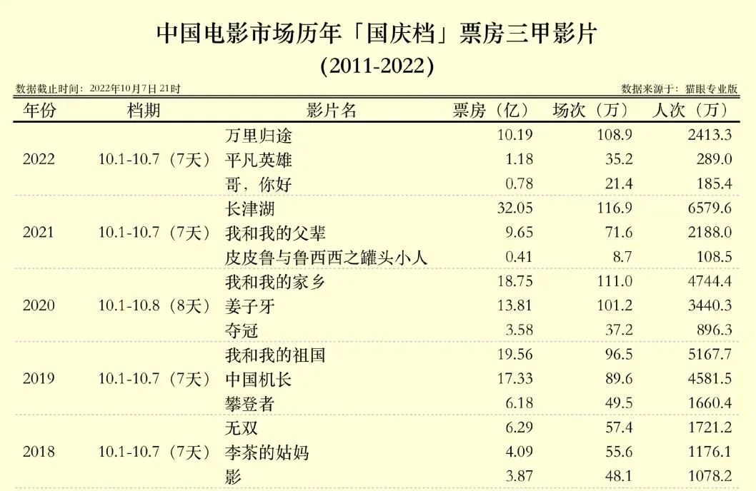 韶光编辑部 | 隐饮 用影戏治愈生存。 本年国庆档票房遇冷,冷到什么水平呢? 简单来说,一夜回到八年前,创下自2014年以来的同期最差票房。 10月1日至7日假期中,天下影戏市场共产出票房14.96亿元,总场次270.5万场,观影总人次3609万。 本年国庆档“结果”仅为客岁国庆档43.7亿元总票房的三分之一。 匀称长达七天的国庆档,原来是一年中最为紧张的档期之一。 但本年履历了一系列极限定档又改档的利用后,只剩《万里归途》一枝独秀,别的六部新片票房表现不佳。 如许的票房结果,大概早有端倪。 《万里归途》一枝独秀 在国庆档影片中,《万里归途》可谓一起领跑,假期七天票房突破10亿大关,克制10月9日,累计票房已有11.6亿元。 这部影戏在题材和范例上都非常独特,它聚焦的是“外交官撤侨”的故事,如许的题材和立意都有肯定的稀缺性。 它在叙事牵挂上安排良好,情节不停反转,观众一起看下去,都被牢牢吸引。 它在人物塑造上是“去标签化”的,男主角宗大伟的形象并非美满无缺,他有本身的个性和对峙,也有脆弱的一面,这让观众更容易有代入感。 《万里归途》固然是一部主旋律题材影戏,但在煽情方面,算是相对克制和公道的,主演的演技也有不少可圈可点之处。 影片末了张译喊出“举起手里的国旗,带你们回家”,观众的泪点被衬托得恰到长处。 《万里归途》确实是口碑过硬的“领头羊”,但在如许一个大的档期,理应有更多质量过硬、体量够大的影戏上映。 本年国庆档上映的其他三部真人影戏《寻常好汉》《钢铁意志》和《搜救》,在陪跑的过程中显着落后了。 《寻常好汉》由拍过多部主旋律大片的博纳影业操刀,但没能重现类似《中国机长》《中国医生》那样的票房古迹。 缘故原由无他,如果你看了这部片,会发现它的故事太过中规中矩,只看开头就能完全猜到末端,中心全部的妨害,都会被非常顺遂地办理。 影片固然改编自一个真实故事,但看完却有严肃的“失真感”。 别的两部新片,无论是票房照旧口碑,都表现一样寻常。 《钢铁意志》陈诉的是新中国的第一炉铁水的故事,从题材立意、演员演出到叙事本领,总有种上个世纪宣传片的味道。 匆忙定档的《搜救》作为国庆档“替补选手”上场,10月3日首映当天的票房结果,排在单日第8名,招呼力乃至不如上映两个多月的老片。 本年国庆档新片不光数量偏少,团体质量也七零八落,这直接拉低了观众对档期的团体关注度。 国庆影片的范例太单一,这让已经上映半个月《哥,你好》拿下了8000万票房,跃居成国庆档票房季军,分析观众对于笑剧片的猛烈渴望。 正如暑期档不能只靠一部《独行月球》硬撑,国庆档同样也不能只有一部《万里归途》。 极限定档与同质化严肃 对于当地影戏市场来说,春节、暑期和国庆档是撑起整年票房最紧张的三个档期。 往年的国庆七天长假,能撑起大概40亿+票房。 2019年国庆档总票房高达44.66亿,2020年国庆档累计票房39.67亿,2021年国庆档累计票房43.8亿。 往年国庆档的重磅大片,通常提前一两个月就高调定档,而在本年,定档的日期被压缩到仅剩一周。 乃至在隔断档期开始仅有3天时,尚有影片在撤档和定档。 不管是对观众、片方照旧影院来说,这齐备都太过匆匆了。 从理论上来说,越是重点档期,就越必要提前排兵布阵,充实预热,而不是临阵上场。 重点档期内的影戏更必要在题材、范例和风格上尽大概丰富,如许才气多样化地满意观众的需求。 实在国庆档影片方向“主旋律”的趋势,并非本年初次出现,而是从2019年就开始了。 2019年是新中国创建70周年,爱国献礼片顺理成章酿成国庆档的主流。 19年国庆有《我和我的故国》《攀缘者》《中国机长》,20年有《我和我的故乡》《夺冠》,21年有《长津湖》《我和我的父辈》。 为什么在前三年,“主旋律扎堆”似乎不是国庆档的标题? “我和我的XX”系列影戏已经拍了足足三年,本年才没有继承拍下去。 实在这个系列影戏,每部都有至少一个大概多个笑剧性的故事,对平凡观众来说,根本能到达“合家欢”的观影结果。 在之前的国庆档,也照旧有一些典范的商业范例片上映的,不至于像本年一样完全缺席:好比2020年的《姜子牙》和《急前锋》,2021年的《五个扑水的少年》。 近三年的疫情,让观众的观影生理产生了玄妙的变革,同样的“爱国主义”银幕大餐,题材又太过严肃,吃太多也会以为腻。 在经济下行的大情况下,观众难过进一次影院,淘汰了“不须要消耗”的欲望。 各人渴望在影院放松大笑大概放声痛哭,而不是费钱买票,再花两小时受教诲。 究竟上,院线影戏是注意力经济的产物。 影片必要在一个固定时间段内,引发观众的猛烈爱好,从而形成话题性的讨论,引发更多观众走进影院观影的高潮。 国庆档如果是《万里归途》搭配《长空之王》上映,大概对观众的吸引力还更大一些。 但《长空之王》原来已经被推高的关注度,陪伴着撤档和退回的三万万预售票房,让一部门观众的热情,提前泄了气。 比起票房下滑,这个数据更值得鉴戒:2022年国庆档总观影人次同比客岁缩水61.5%。 这也是我们最不肯意看到的局面:没人乐意讨论国庆档和国庆档影戏了。 2022整年票房预测 克制10月9日,现在2022年度当地累计票房为272.65亿,同比客岁的差距扩大至近120亿。 2022年上半年当地票房为171.8亿,这也是自2014年以来近八年的最差结果。 本年