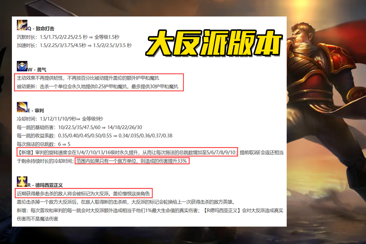兄弟们好,我是阿灰,欢迎收看本期《同盟进化史》。在曾经谁人金币难攒买不起豪杰的年代,永世免费的盖伦可以说是无数玩家的峡谷发蒙导师,简单粗暴的技能组外加没有蓝条极易上手,装备成型之后很肉不轻易死,另有一手大宝剑能用来K头,简直就是为新手量身定做。 可随着时间的推移,新玩家越来越少,新豪杰越来越多,筹划师为了让盖伦能跟上期间,在他身上做了不少实行,那么各人知道盖伦从上线至今一共履历过多少次大改版吗?一起往下看吧。 多少人吊唁初代盖伦的模子?初代盖伦的技能组绝大部分人都没见过,被动脱战回血没什么好说的,Q技能只有加快和沉默沉静效果,免疫减速是在E技能上,W技能被动补兵加双抗(最开始是满级35),主动效果开启后得到30%减伤连续3秒,大招是带斩杀效果的大宝剑,当时照旧邪术伤害。 不外初代盖伦给人印象最深的并不是技能组,而是模子,当时盖伦的攻击方式除了单手摆荡大宝剑砍人之外,还能用另一只手打拳,Q技能跳劈动作非常丝滑,QA比现在流畅不少,E技能转圈圈殊效也更有打击感。 2.5秒沉默沉静!盖伦也曾是个数值怪?S3赛季盖伦迎来了初次重做,Q技能史诗级增强,满级加快和沉默沉静时间分别增长了1.5和1秒,同时还移植了本来在E技能上的免疫减速效果,W技能大幅重做,被动从叠加固定双抗酿成了直接提拔20%双抗(对符文加成也有用),主动效果新增了30%韧性,E技能和大招光看数值是减弱(前者伤害、后者CD),但筹划师给了其他“补强”,这代盖伦转圈圈的时间会不绝地朝对头大呼,大招斩杀时新增了屏幕殊效,数值什么的无所谓,帅才是一辈子的。 前两代盖伦的玩法都是以肉装为主,由于当时有一件叫作阿塔玛之戟的装备,它可以将豪杰最大生命值的1.5%转化为攻击力,后期5000血相称于能加75攻击力,假如想更暴力一点就再补一把黑切,身板够硬的同时伤害也不容小觑,除了笨一点根本没啥弊端。 最经典的大反派S5赛季末期,筹划师对部分重装兵士举行了更新,盖伦也被算入此中,Q、W技能被大幅减弱,作为补偿,E技能旋转次数会随品级而提拔,同时单目的会增伤33%,大招新增了一个大反派机制,近期击杀最多的对头会成为盖伦的“心动女孩”,盖伦的普攻、E技能和大招都会对其造成真实伤害,团体来看就是减弱机动性、增长伤害。为了能顺遂追到本身的“心动女孩”,盖伦的主流玩法也酿成了黑切、亡者板甲和幽梦。 在这之后筹划师还给了盖伦不少照顾,好比6.24版本E技能新增了25%穿甲,7.14版本被动增强血越少回得越快,W技能还新增了0.75秒的60%减伤与韧性,这段时间盖伦在路人局里的职位但是不低。 然而大反派机制也带来了诸多题目,刚开始击杀盖伦的人也会成为大反派,即便线上完成单杀,盖伦返来刀刀真伤一下子又能把上风给夺归去,别的盖伦玩家还很轻易被其冲昏头脑,打团的时间一个劲儿地就想斩掉对面大反派,经常会因此而走向失败,以是筹划师决定将这一机制给移除。 攻速流盖伦横空出世9.20版本,盖伦迎来了第三次改版,Q、E技能都新增了攻速收益,玩法从重装兵士方向了轻装兵士,三相、电刀一出伤害爆炸,W技能的0.75秒减伤被改成了10%最大生命值护盾,大招伤害低落,但从邪术伤害酿成了真实伤害,相称于大家都是“小反派”,而且终于不消再受饮魔刀的针对了,团体强度对比之前又有了大幅提。 从两组数据中各人就可以看出这代盖伦有多么OP,当时他的登场率到达了15.7%,排名上路第二,更离谱的是Ban率,竟然靠近19%!要知道,之前在路人局Ban盖伦别人都会以为你是来搞笑的,终极,筹划师不得不告急减弱E技能的伤害与攻速收益,然而对于盖伦这种没位移又没控制的兵士而言,伤害就是命根,减弱伤害就意味着进入下水道。 神话版本尤其是挺进位移被移除之后,盖伦的处境就愈显尴尬,出肉装完全没伤害,想打伤害出攻速装(挺进+凡性+攻速鞋)在现在这个伤害溢出的版本里又很轻易暴毙,现在的他到底算什么呢?坦克?重装兵士?轻装兵士?估计连筹划师都把握不住。 |