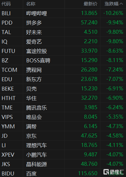 格隆汇10月10日丨中概股跌幅扩大,纳斯达克中国金龙指数跌5%,报5777.47点。哔哩哔哩跌超10%,拼多多、好未来、爱奇艺跌超9%,富途、BOSS直聘跌超8%,携程网、新东方跌超7%,贝壳、华住、腾讯音乐跌超6%,唯品会跌超5%、满帮、京东、理想汽车、小鹏汽车、晶科能源跌超4%。 |