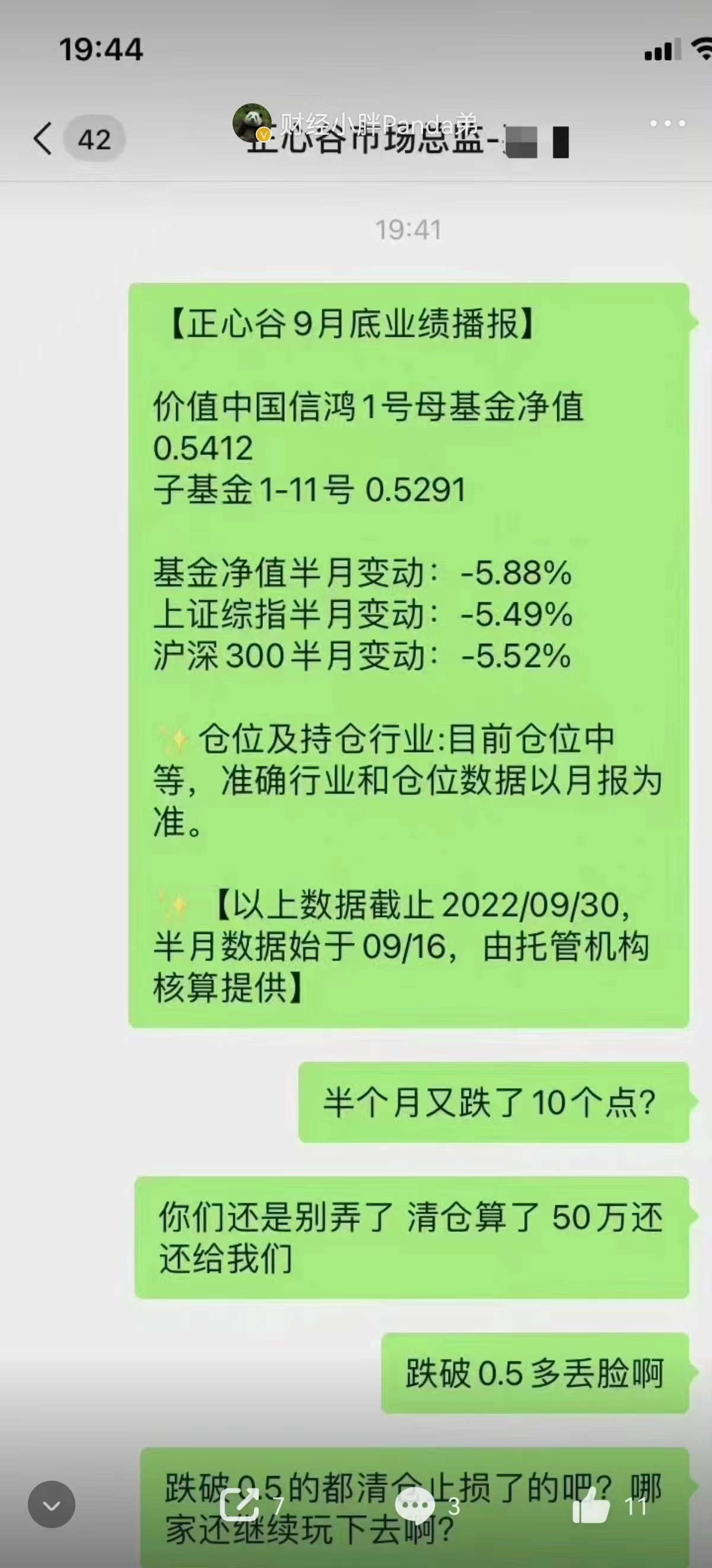 记者 | 穆玥 编辑 | 百亿私募正心谷资源又一次被推上了风口浪尖! 10月10日,一张有关正心谷9月尾业绩播报的截图在交际媒体传播。截图表现,克制9月30日,公司旗下的“代价中国信鸿1号母基金”净值仅为0.5412,子基金1-11号净值仅为0.5291,此中自9月16日起基金净值半月变动为-5.88%。 图片泉源:网络 对此,截图中的投资者在与备注为“正心谷市场总监”的对话中直言“跌破0.5多丢脸啊,跌破0.5的都清仓止损了的吧?哪家还继承玩下去啊?” 正心谷资源旗下的二级私募平台浙江义乌市檀真投资管理合资企业(有限合资)创建于2017年6月,于同年11月正式完成了登记存案,现在的管理规模为100亿元以上,公司的实际控制人林利军此前曾任汇添富基金总司理。 据中国基金业协会披露的信息,“代价中国信鸿”系列产物确实存案于该公司旗下。不外,界面消息查询多家第三方平台发现,檀真投资旗下产物近期均未更新净值数据。 值得一提的是,此前正心谷资源就曾由于业绩巨亏而被投资者怒怼。 本年1月份在交际媒体传播的一篇文章指出,“正心谷私募产物2021年创建至今,克制2021/12/31日,净值已下跌到0.66,三百多亿的产物给投资者造成了百亿亏损”。 在本年1月23日举行的正心谷资源2022年投资战略会上,公司首创人林利军也曾就客岁的业绩表现向投资者致歉。林利军坦言,已往一年的投资业绩欠佳,这是正心谷创建以来最差的一年,但短期业绩并不代表恒久收益,正心谷投资团队也在不绝反思和提拔。 与其他多家百亿私募一样,在业绩巨亏面前,正心谷资源也选择了“自购”,5月18日,其董事长林利军在公司投资分享会上正式公布其本人和正心谷的投研团队继承追加跟投3000万元,进一步保持与客户长处划一。克制其时,正心谷投研团队、员工和林利军本人在旗下产物的跟投金额高出2亿元。 如今又已往了近5个月,如果10月10日交际媒体传出的截图信息属实的话,正心谷资源现在的业绩表现也依然堪忧。 不外,界面消息留意到,近来正心谷资源也在积极扩充投研气力,并在近期得到了资管大将、原安全养老投资司理张孝达的到场。公开资料表现,张孝达此前负责大型央企的年金账户股票投资管理,管理规模近130亿,所管产物业绩位于同期公募股票型基金火线。 业绩爆亏之后的正心谷资源还偶然机逆风翻盘吗?齐备照旧未知数。 |