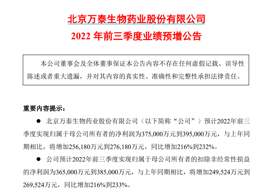 10月11日晚间,万泰生物发布2022年前三季度业绩预增公告,公告体现,预计前三季度净利37.5亿元-39.5亿元,同比增216%-232%。 公告体现,本期业绩预增的重要因由于公司二价宫颈癌疫苗继承保持产销两旺,收入及利润高速增长;因国表里新冠肺炎疫情影响,公司新冠质料和新冠检测试剂的收入及利润实现快速增长。 制止本日收盘,万泰生物涨0.38%,报收110.7元,换手率1.1%,最新总市值1003亿元。 |