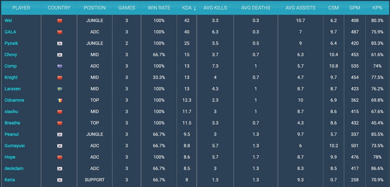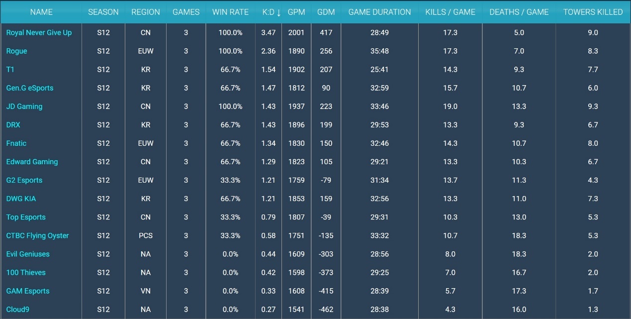 各位LPL的观众和好汉同盟召唤师各人好,这里是天鄙俚戏汇。 S12环球总决赛小组赛第一轮的比赛全部竣事了,在第一轮的比赛中LPL战绩领先,临时是第一赛区,但真正的难点在于第二轮,LPL必须要改善本身第二轮体现太差的标题,才华在第二轮中保住本身的位置,TES才有机会小组出线。 在等候第二轮比赛的期间,S12小组赛的数据也已经公布出来了,接下来我们就来看一看。 RNG选手登顶,Chovy补刀第二RNG,JDG和RGE三支队伍是现在为止保持全胜的三支队伍,在数据面上这三支队伍肯定是领先比力多的,关键是看哪支战队选手的数据更加富丽,效果我们发现,RNG战队的打野WEI以及下路选手GALA,拥有非常可骇的KDA数据。起首来看KDA数据,WEI和GALA两大选手登顶,KDA是断层式的领先,此中WEI选手的KDA高达42,GALA为40,两人的场均阵亡仅为0.3,三场比赛一共加起来阵亡1次。 相比之下WEI的助攻数更高,因此临时排名第一,在两个选手之后,是Pyosik和Chovy两个LCK赛区的选手,RGE的下路COMP排名第五,Knight排名第六,固然战队效果不好,但Knight的数据还是很好。 场均击杀数据排名第一的是RGE的COMP,高达7.3,这个ADC,包罗尚有FNC的Upset,可以说是这次天下赛的两大黑马,体现都非常出色,也都赢了LCK的队伍。 COMP除了本身的击杀数据排名第一之外,他的场均补刀也是排名第一,压了一头Chovy。 JDG击杀第一,RNG战损第一看完选手数据我们来看一下战队的数据环境,起首是看战损比数据,排名第一的是RNG,RGE名列第二,2-1的T1排名第三,GEN和JDG名列第四第五,LPL其他队伍方面,EDG是排名第八,TES是第11位。 说实话TES能排名第十一,要归功于第一场打GAM简直动手挺重,导致反面两局被DRX和RGE猛灌人头的环境下,还能排在第11,不至于排名倒数。 场均时长最短的是T1,不到26分钟,一个非常离谱的数据,赢得快输得也快。 时长最长的是RGE和JDG,两支队伍固然都拿下全胜,但是比赛内容还是比力剧烈的,此中JDG的场均击杀数据排名第一,但血腥水平不如RNG,由于RNG固然场均击杀17.3排名第二,但比赛时长是28分49秒,分均击杀的数据会更高一些。 拆塔数据方面RNG是排在第一,团体来说从数据面的体现来看,RNG简直是小组赛第一轮赢的最轻松的队伍,统治力很强。 关于小组赛数据的个人见解个人以为小组赛第一轮的数据能很好地显现出各大战队在第一轮的竞技状态和战队风格,但是也只能代表第一轮,数据样本只有三场,LPL的队伍排名靠前固然非常好,但也不能因此放松鉴戒,由于第二轮才是真正的检验。 第二轮的比赛一天打完一个小组剩余的全部比赛,第二轮是除了BO5镌汰赛之外最暴虐的一个阶段,想要拿到好效果,备战这一块必须得做好,由于临场调解的空间没有那么大,LPL的许多队伍都得打背靠背,必须得针对每一个对手做好对应的BP计谋,做好统统预备,尽人事听天命,夺取最好的效果。 个人以为纵然是在数据层面上霸榜的RNG,实在也存在有肯定隐患,本年的小组赛与往年差异的一点是,没有那种看起来特殊无敌的队伍,各人的力气差距没那么大,翻车大概性是比力大的,如许的局面下,预备更好,临场发挥更出色的队伍就能晋级八强。 |