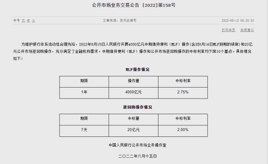 作者:苏东梅 8月15日,央行公告体现,为维护银行体系活动性公道充裕,人民银行开展了4000亿元一年期MLF利用和20亿元7天期逆回购利用。此中,一年期MLF中标利率为2.75%,较7月15日中标利率低落10个基点;7天逆回购利用中标利率2.00%,较上周五(8月12日)中标利率降落10个基点。 图源:中国人民银行官网Wind数据体现,8月15日有20亿元逆回购到期,8月有6000亿元MLF到期。比力来看,此次MLF利用量缩价降,紧张开释央行庇护实体经济,稳货币、宽光荣的深意。同时这也是本年以来中国央行第二次下调政策利率。 1月17日,央行分别下调一年期MLF和7天期逆回购利率各10个基点至2.85%、2.10%。央行公布降息后半小时,国家统计局发布的数据体现,1-7月,天下固定资产投资同比增长5.7%,涨幅较前6个月回落0.4个百分点。7月,社会斲丧品零售总额同比增长2.7%,比上月回落0.4个百分点,规模以上工业增长值同比上涨3.8%,比上月降落0.1个百分点。上述数据均不及市场预期。股债市场也反应剧烈。 由于LPR是在中期借贷便利(MLF)利率根本上加点形成,接下来8月20日的新一轮贷款市场报价利率(LPR)报价也料将下调。对于这一缩量利用,有业内人士表现符合市场预期,这与近期市场活动性较为充裕有关。 综合自界面消息、北京商报、中国人民银行 |